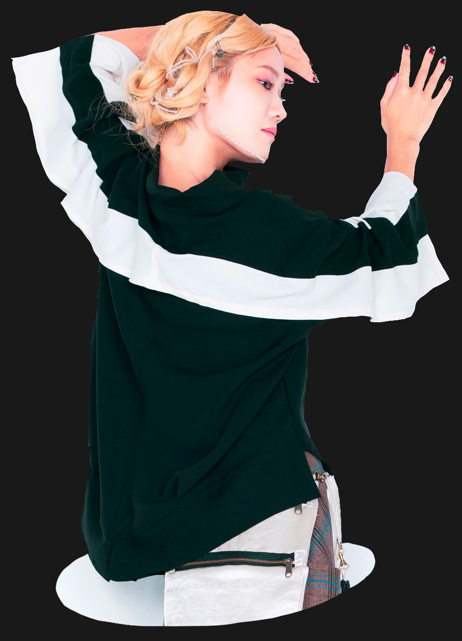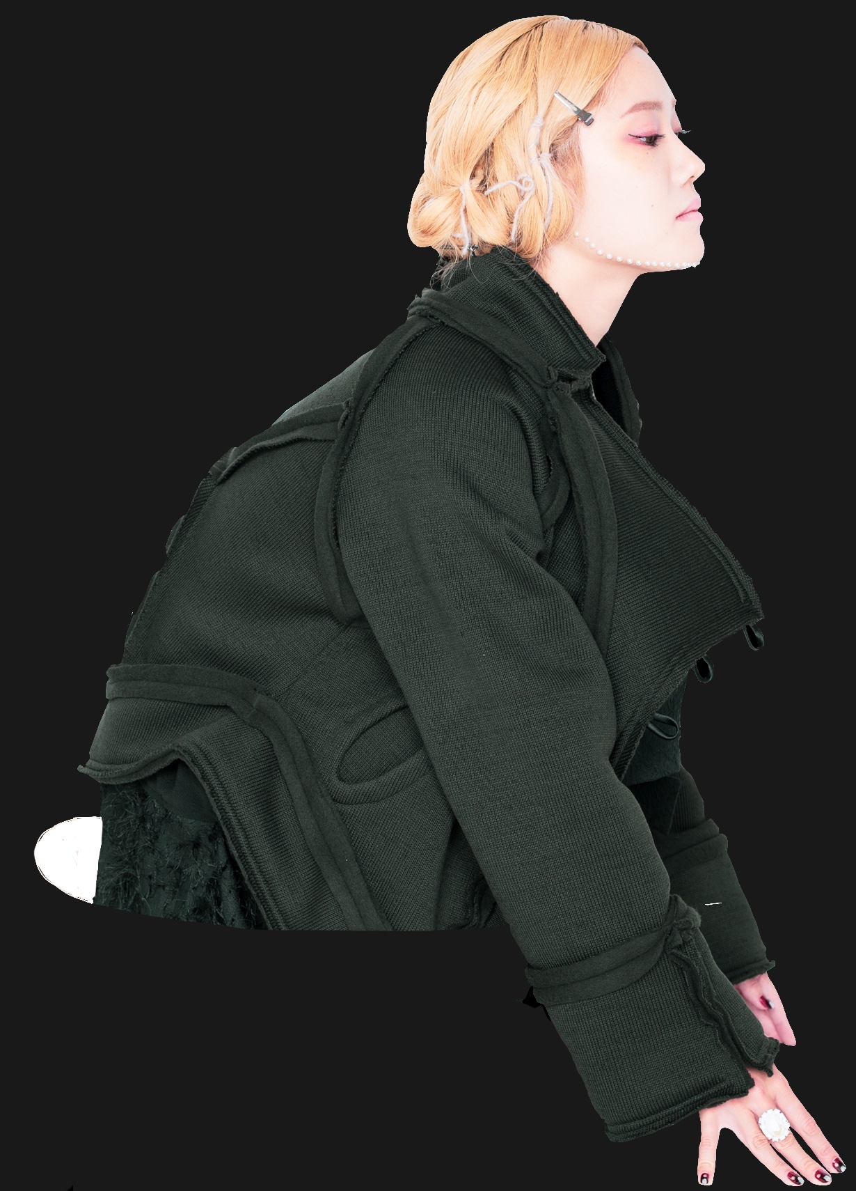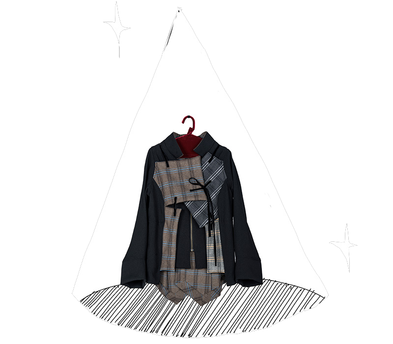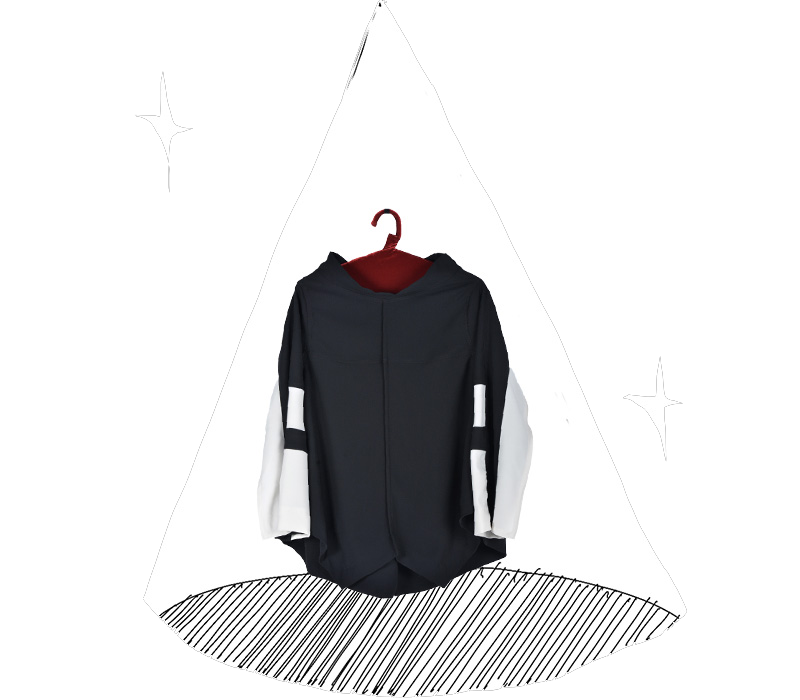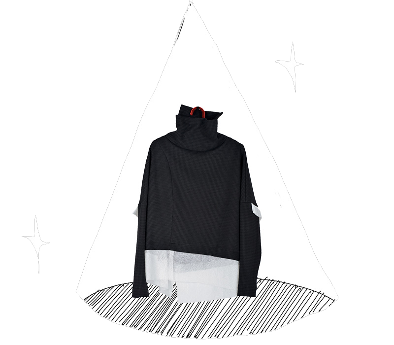 アシンメトリーなスタンドネック。袖口のディティールに遊びがあります。