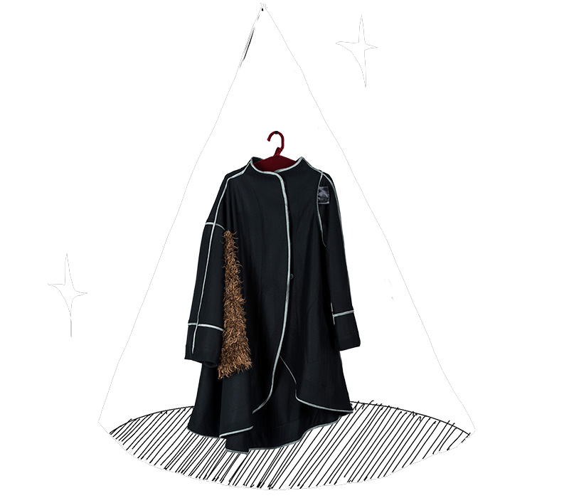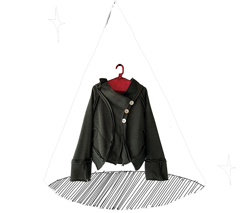 The stand neck is asymmetrical. The cuffs have a playful twist,