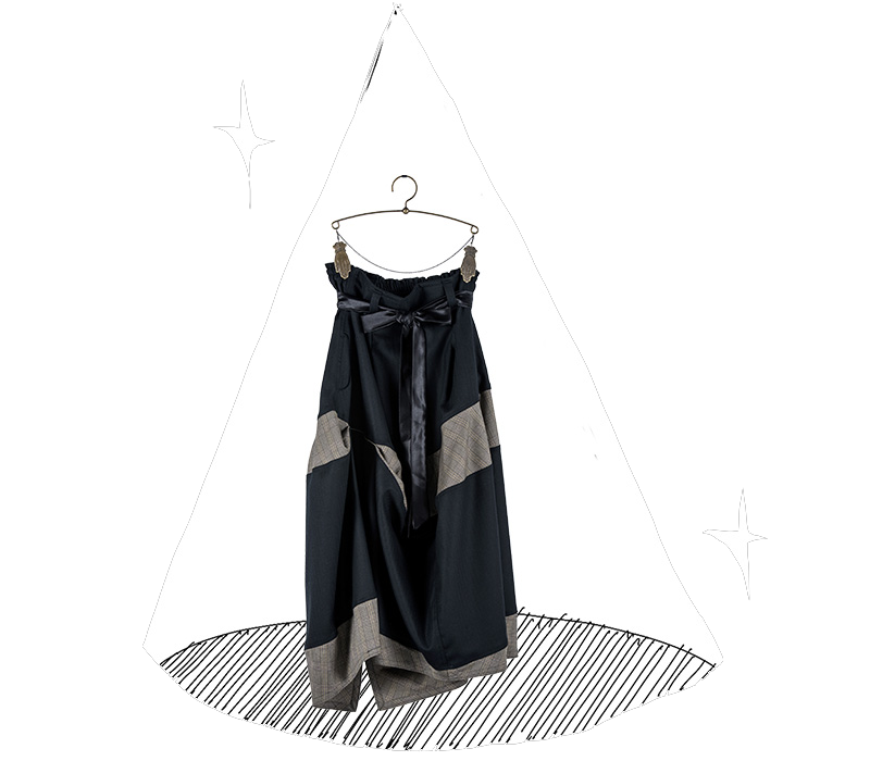 ふっくらとランプ型のスカートはサテンのパイピングラインで華やかな印象。