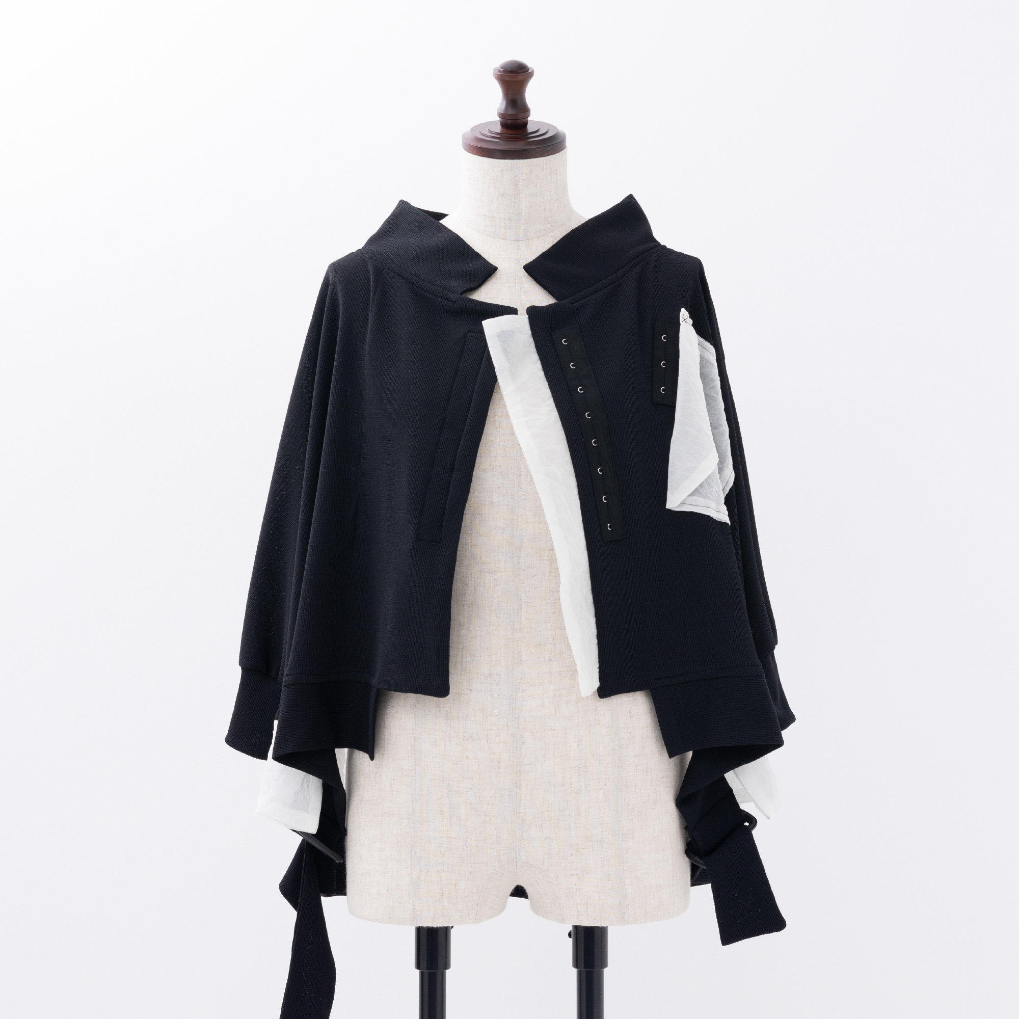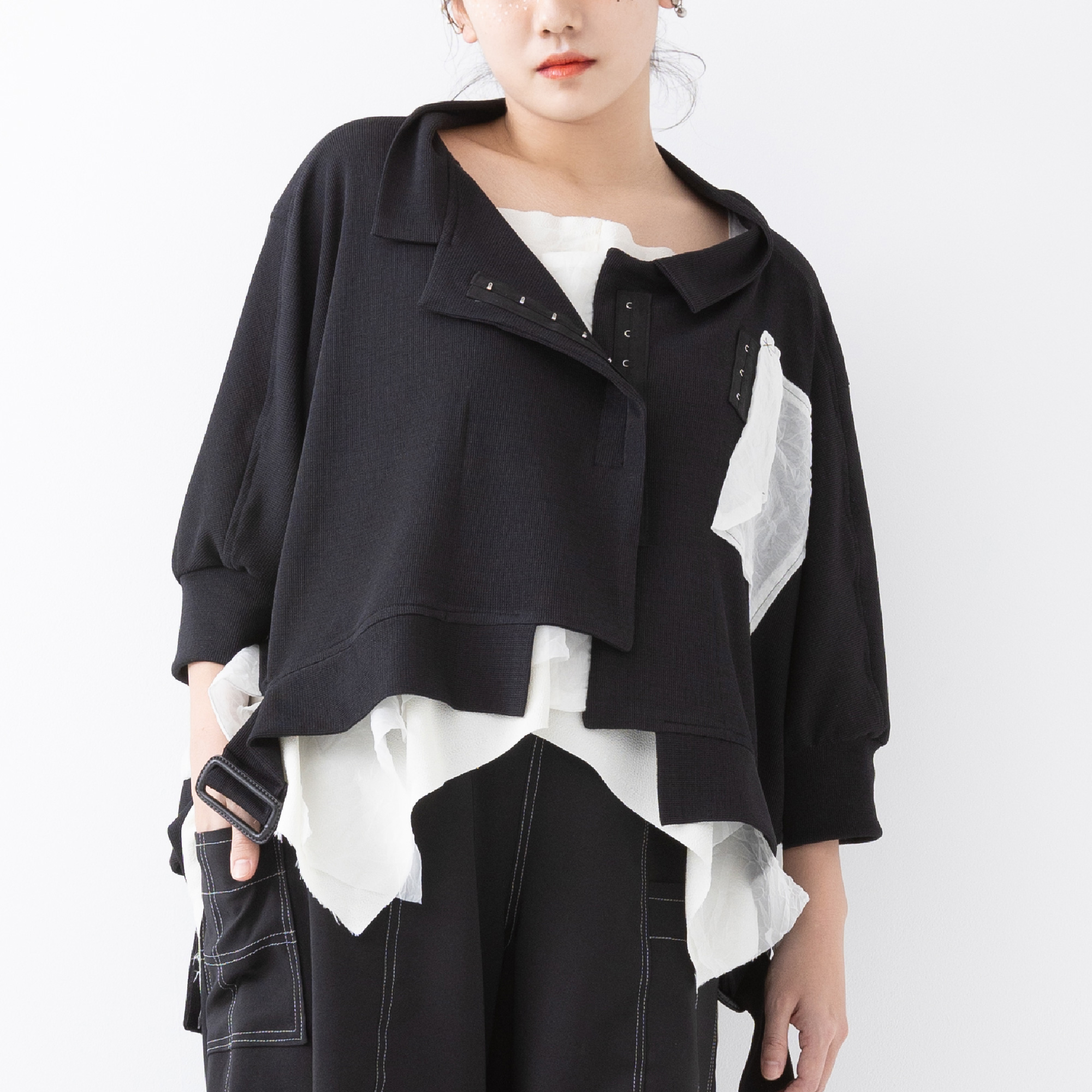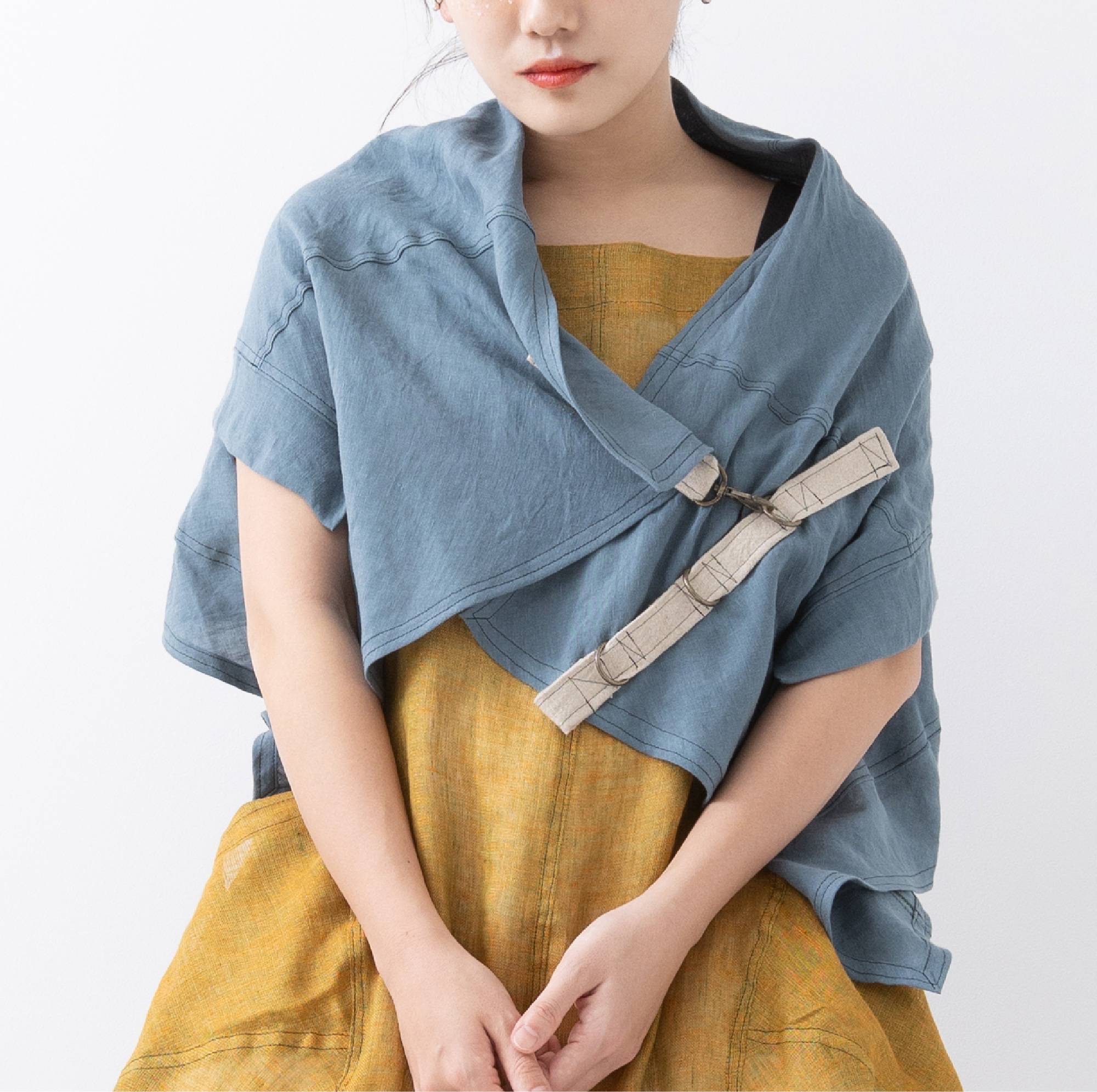 脇から下がるバックルを締めたり、どこでも止められるホックで着崩したり、自由で遊び心いっぱいのアイテム。