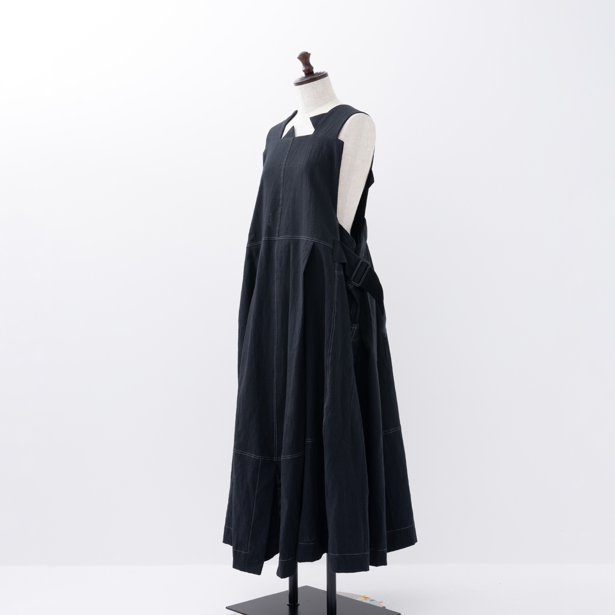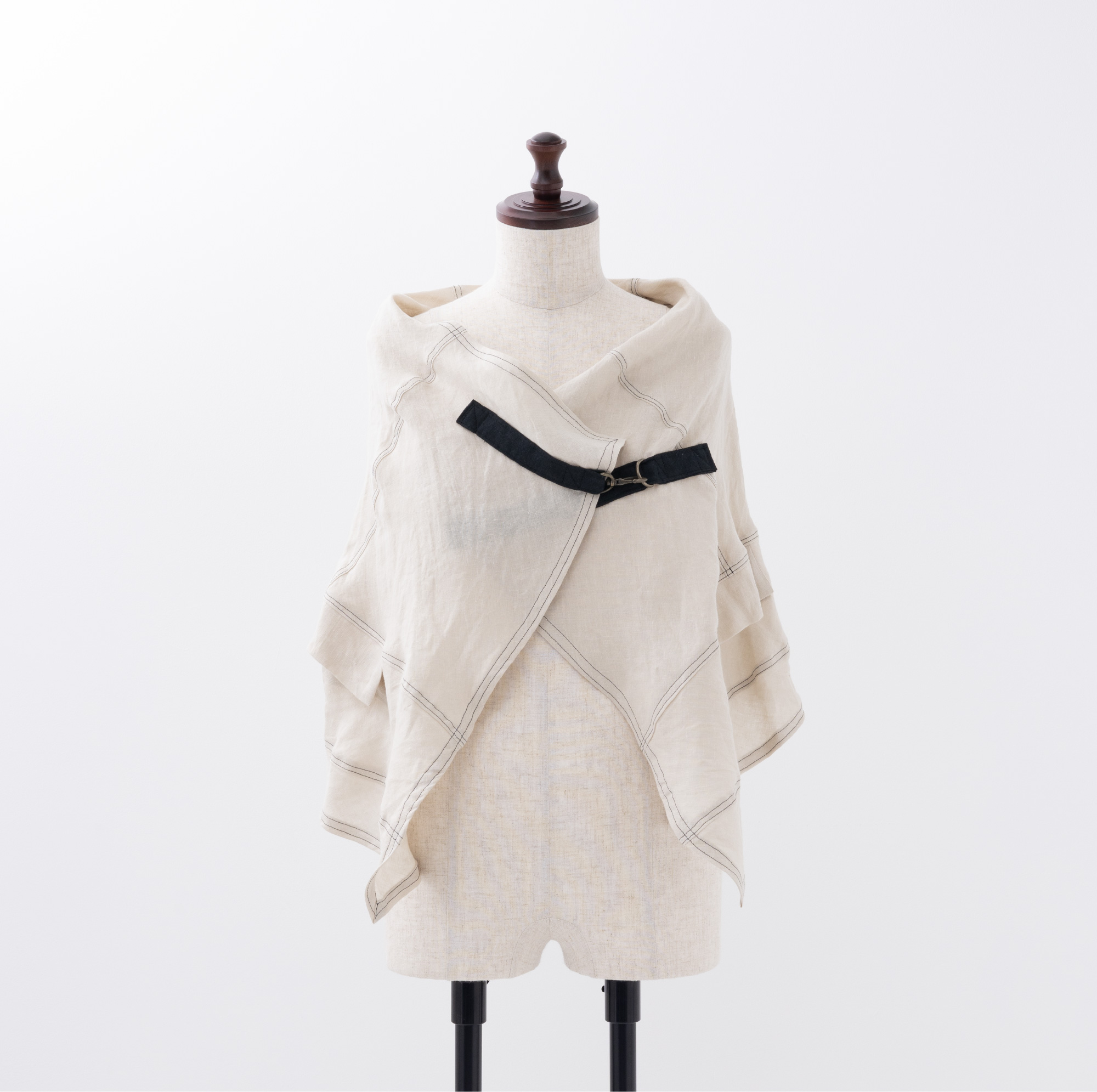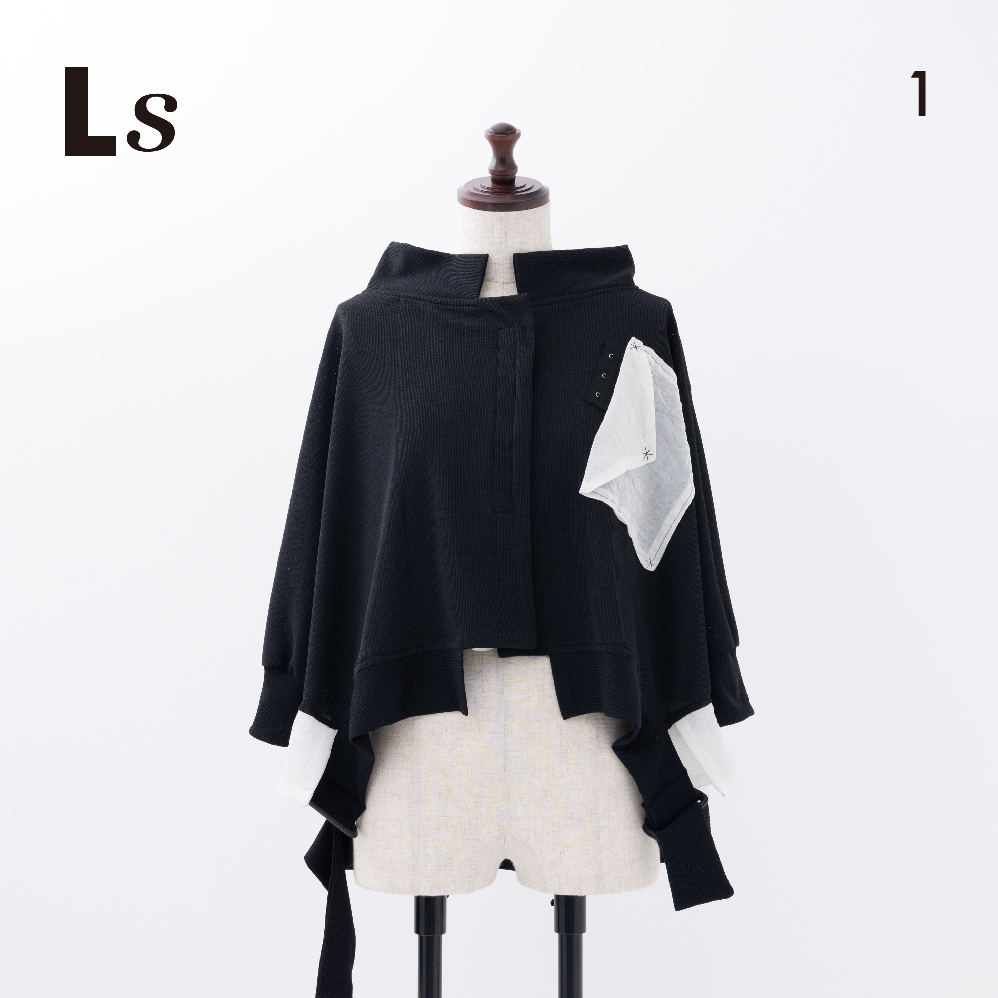 脇から下がるバックルを締めたり、どこでも止められるホックで着崩したり、自由で遊び心いっぱいのアイテム。