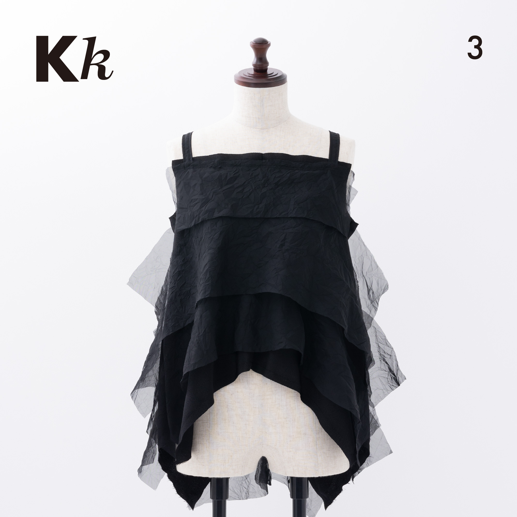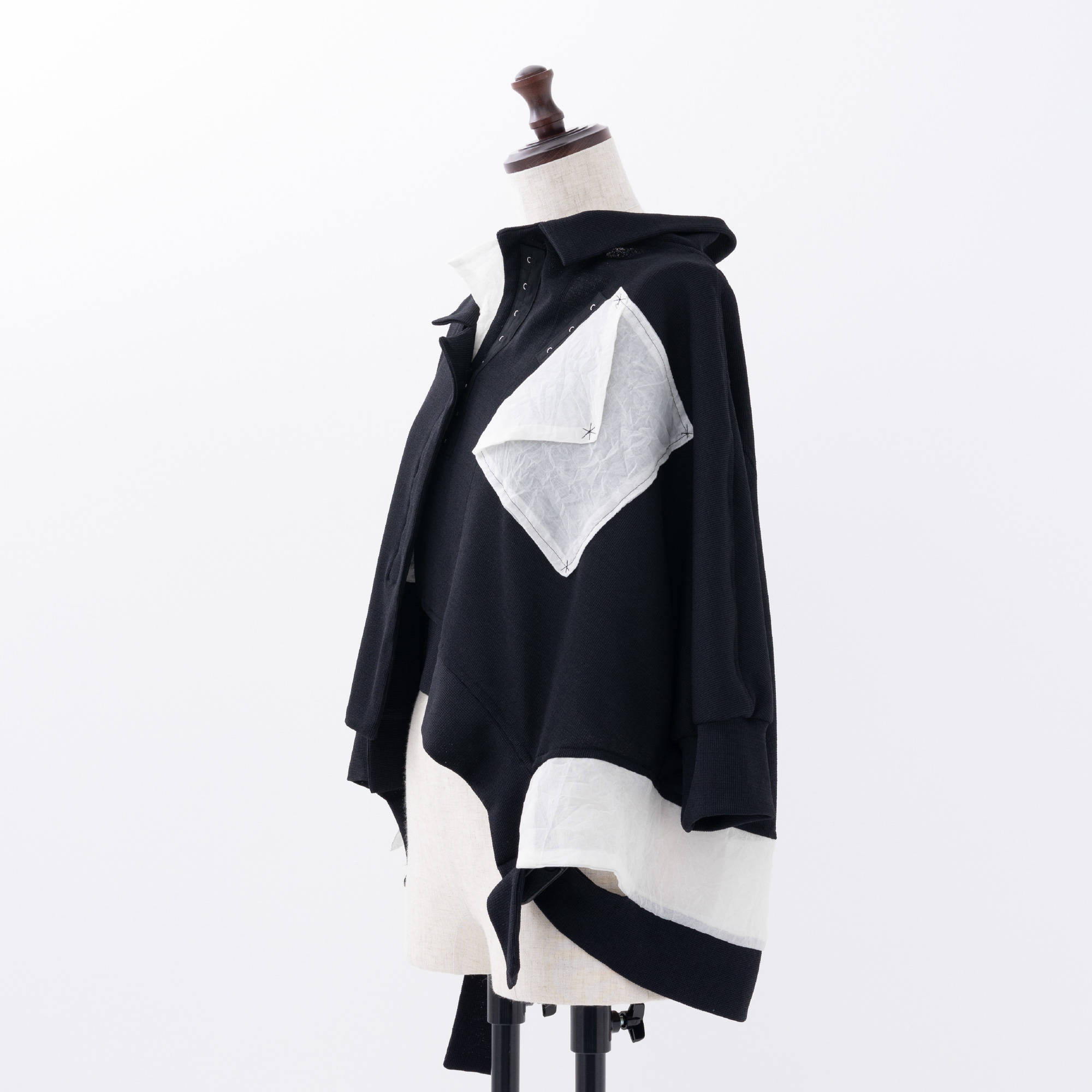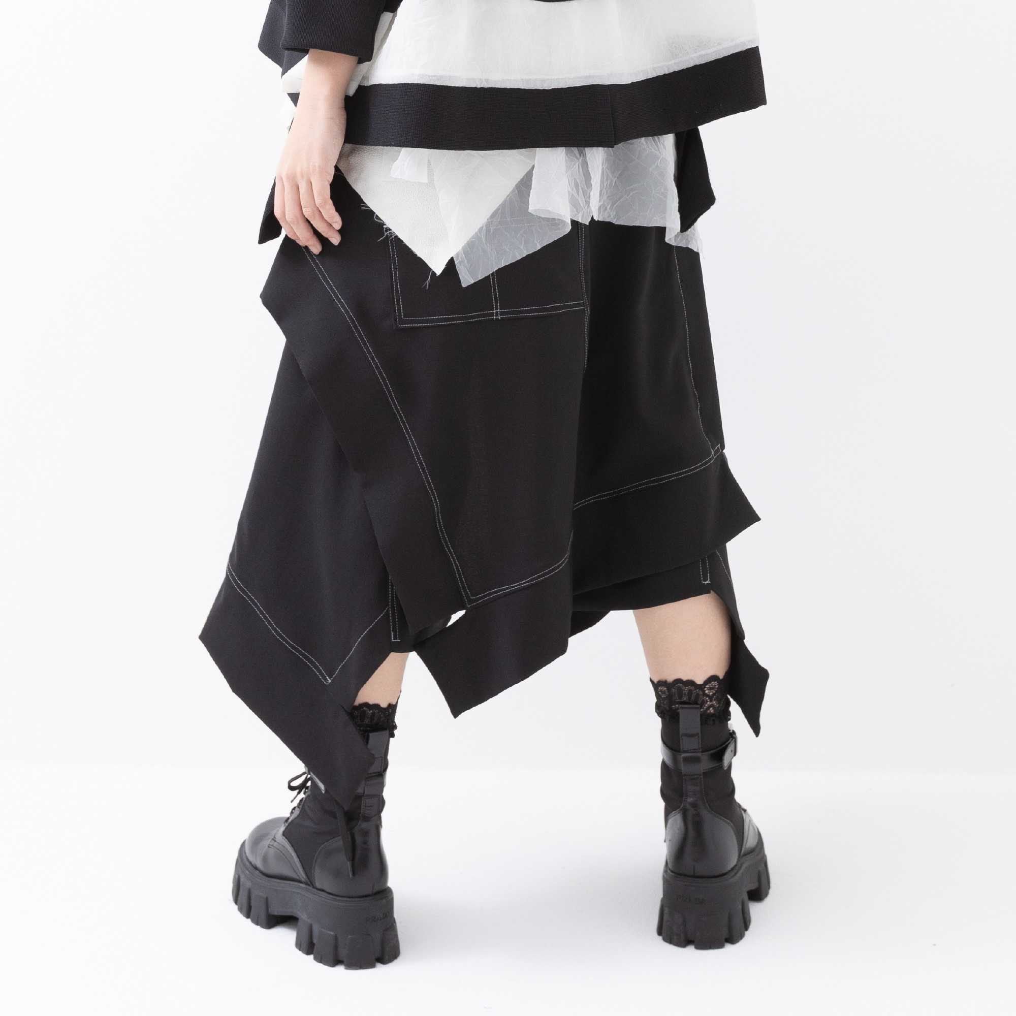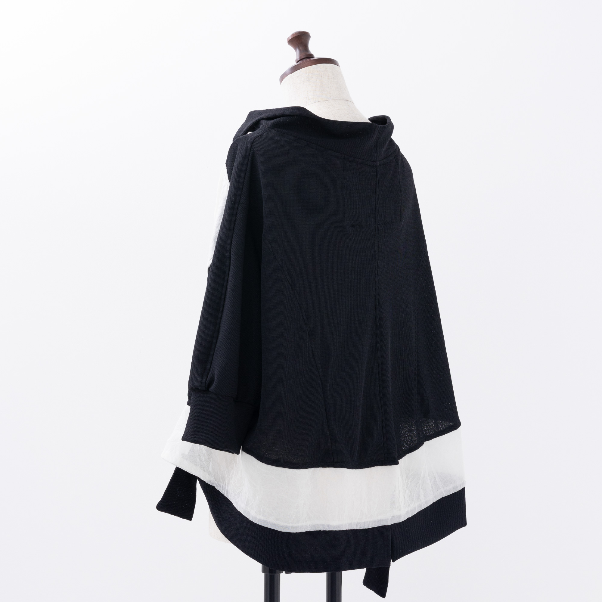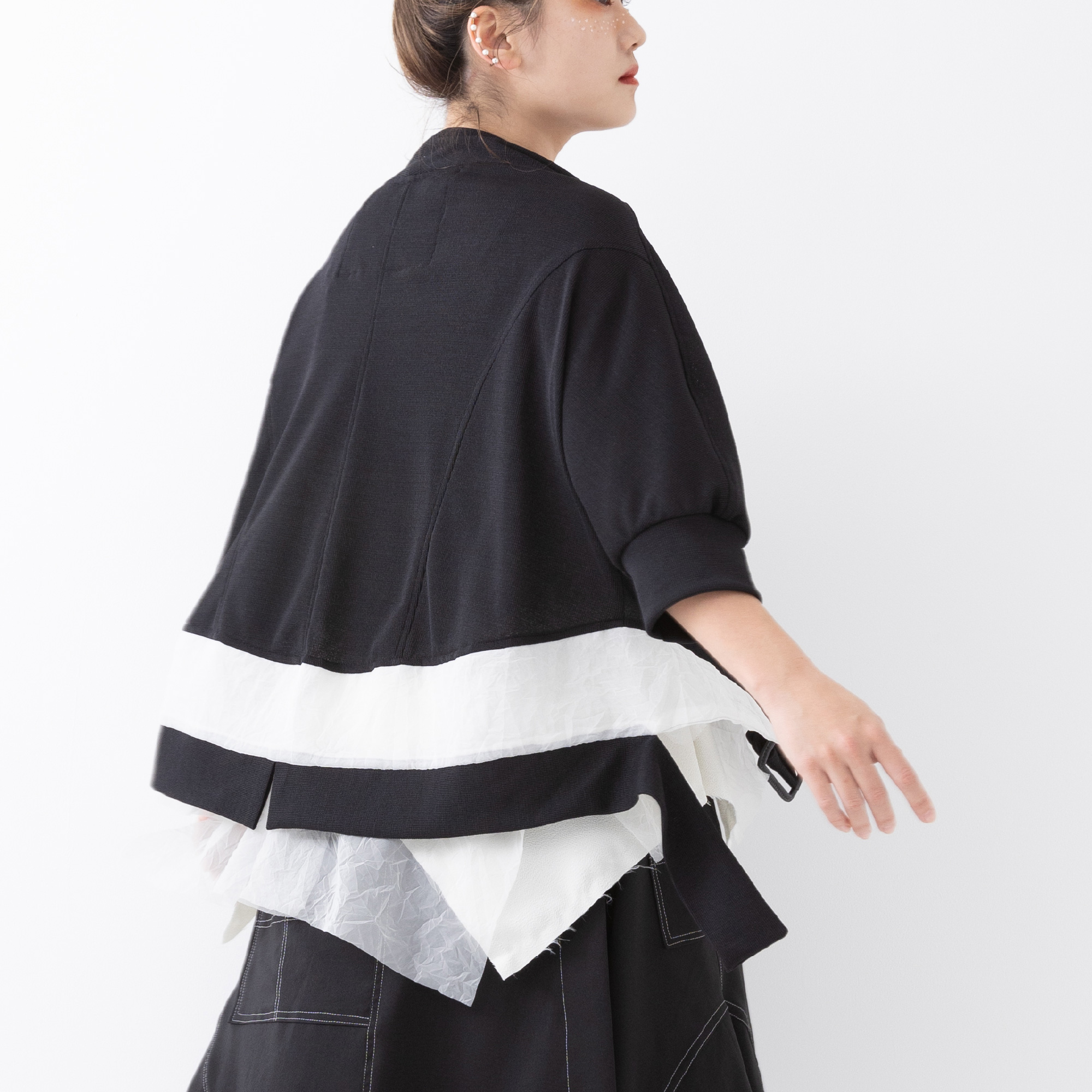 The monochrome look created by the casual knit and sheer organdy looks cool.