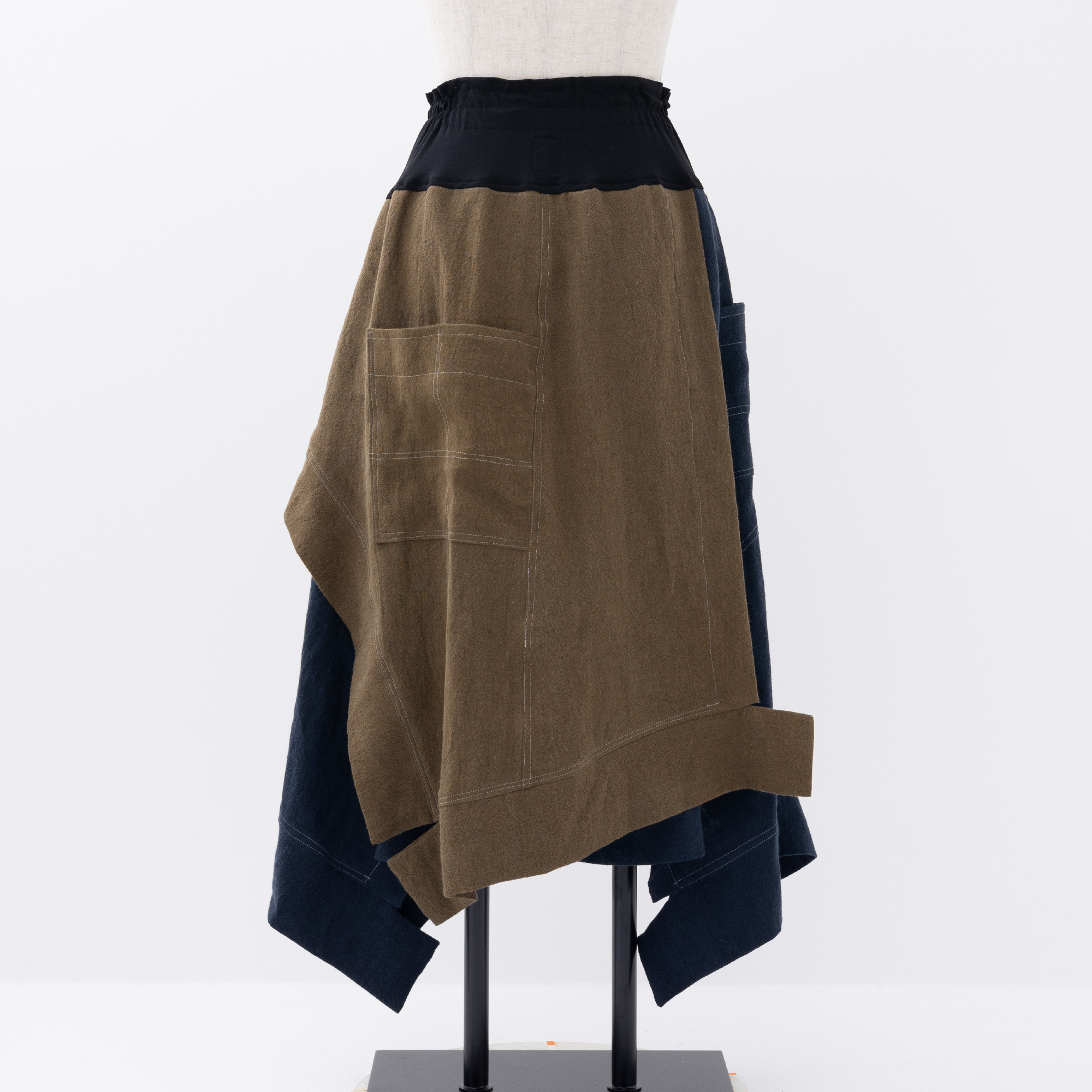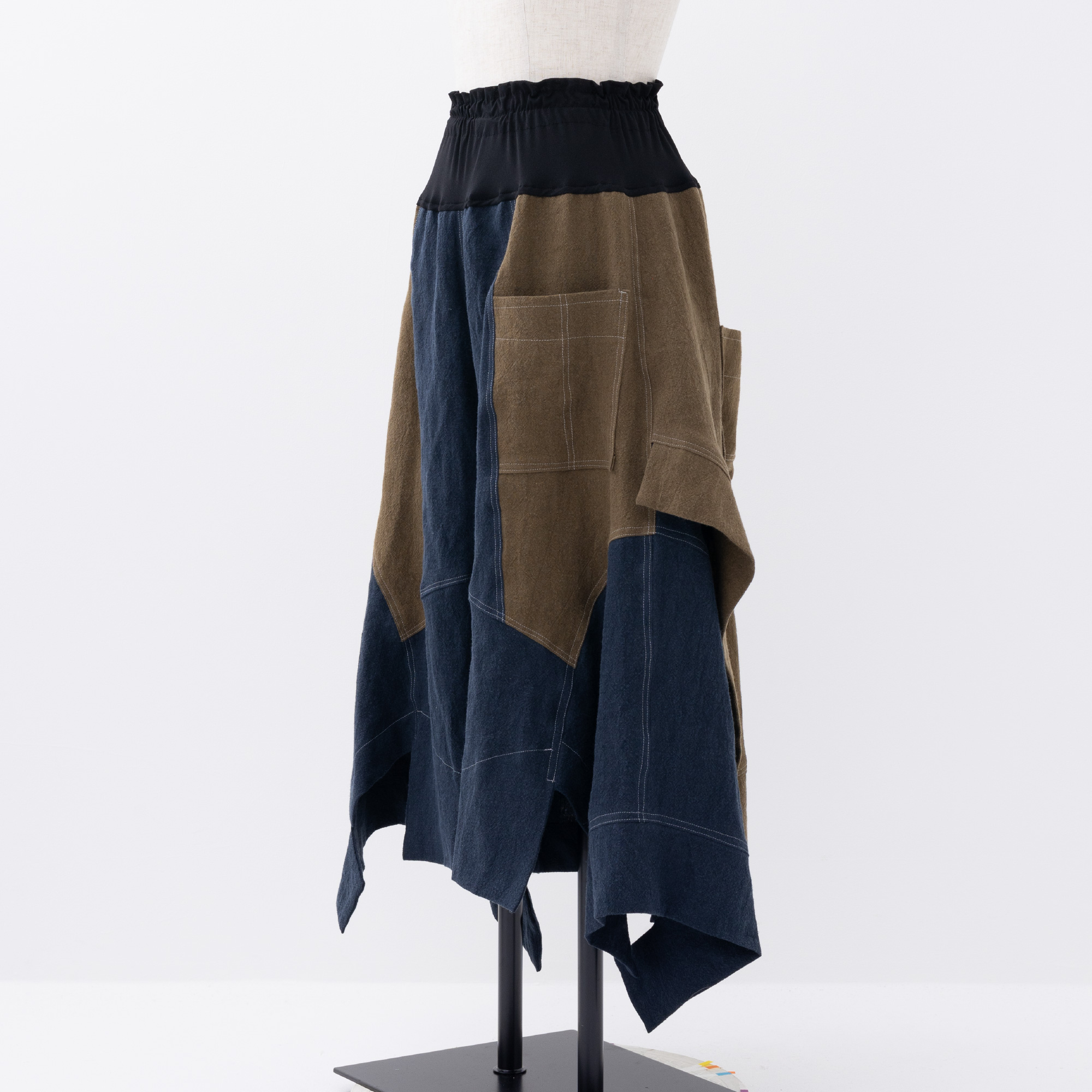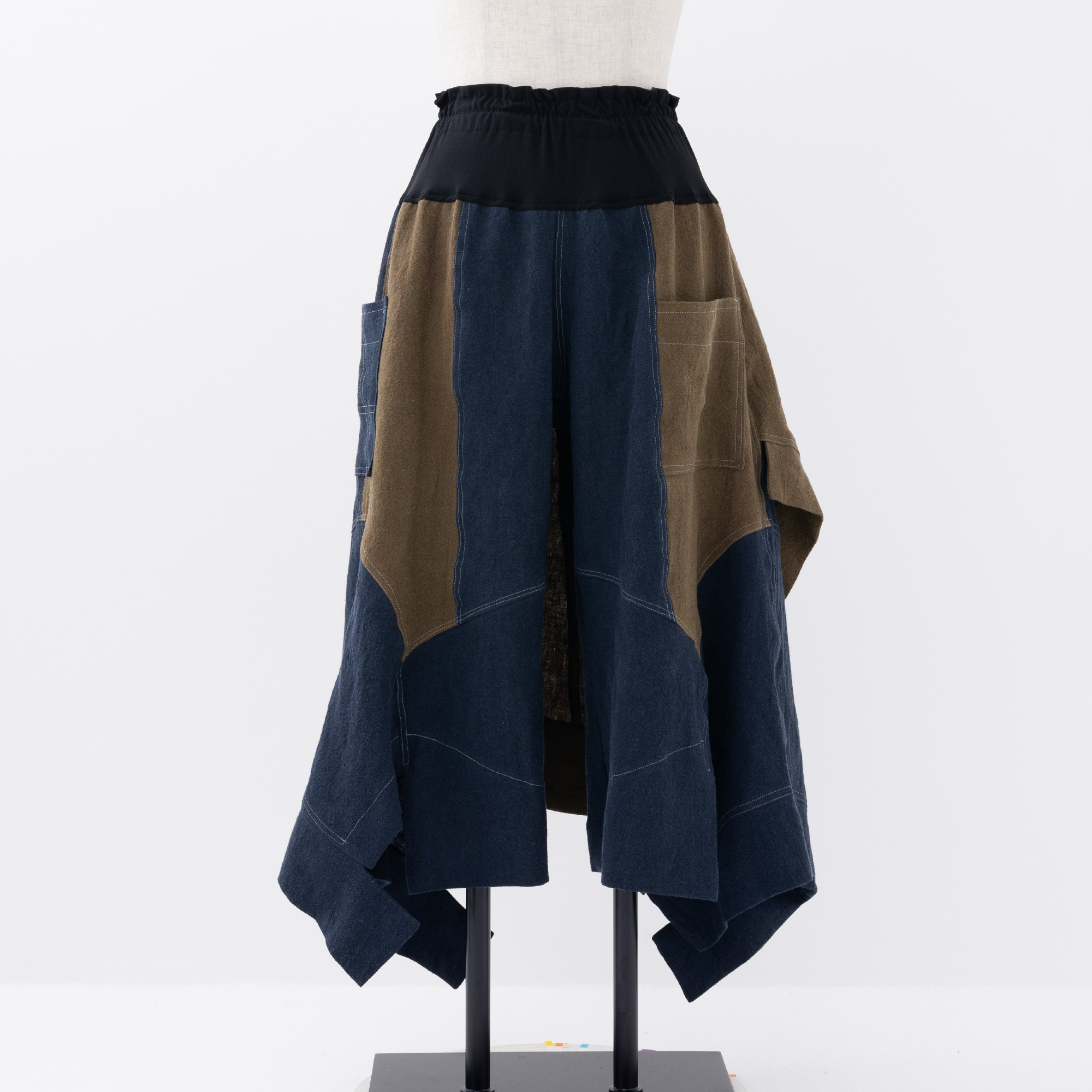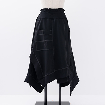 Aラインのカーブ、ギザギザのヘムライン、お尻を隠すスカート等、ディティール満載なのに、ウエストゴムで楽ちん。