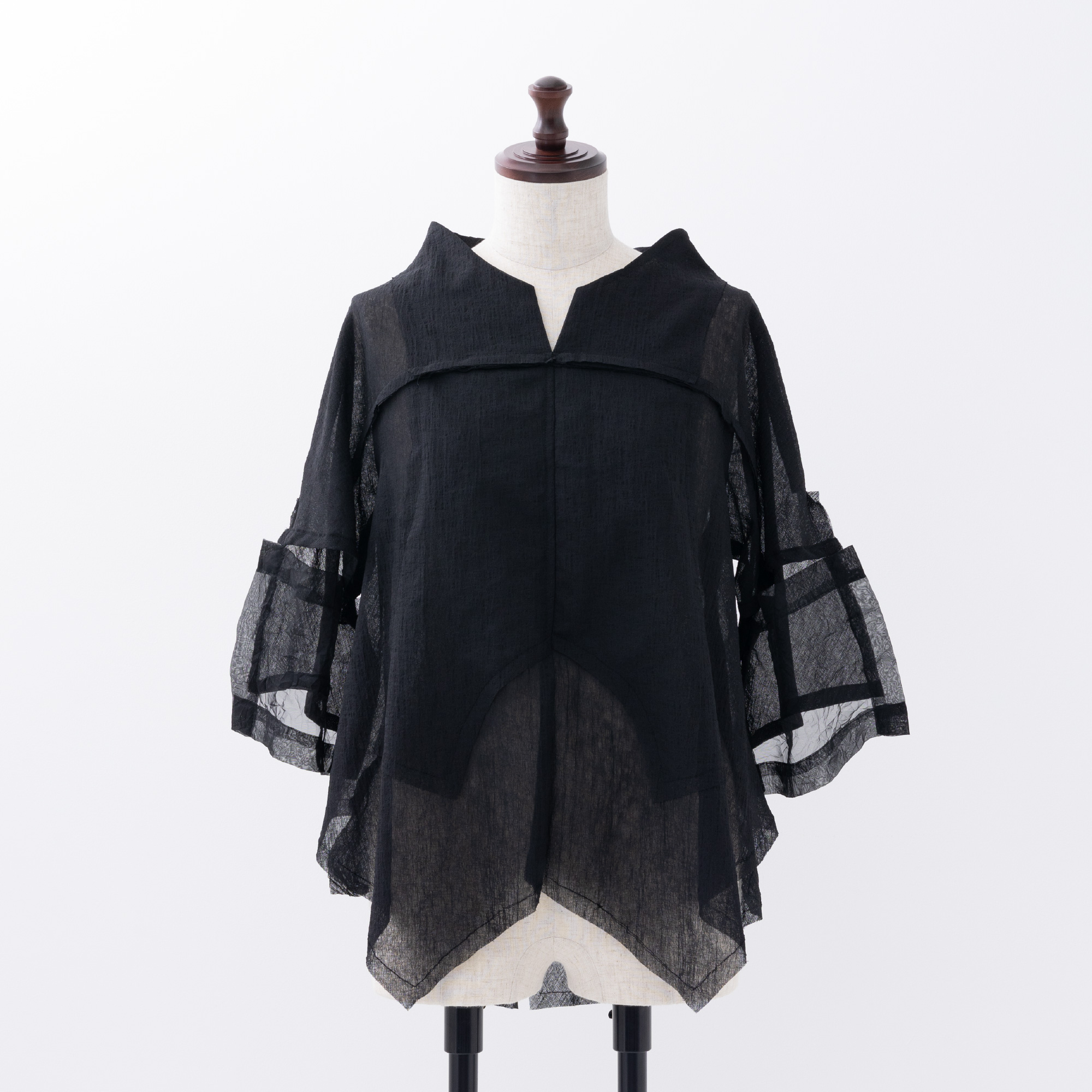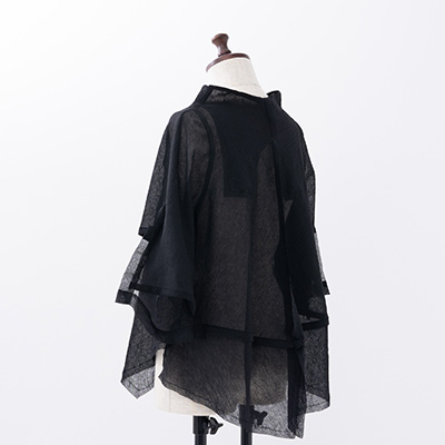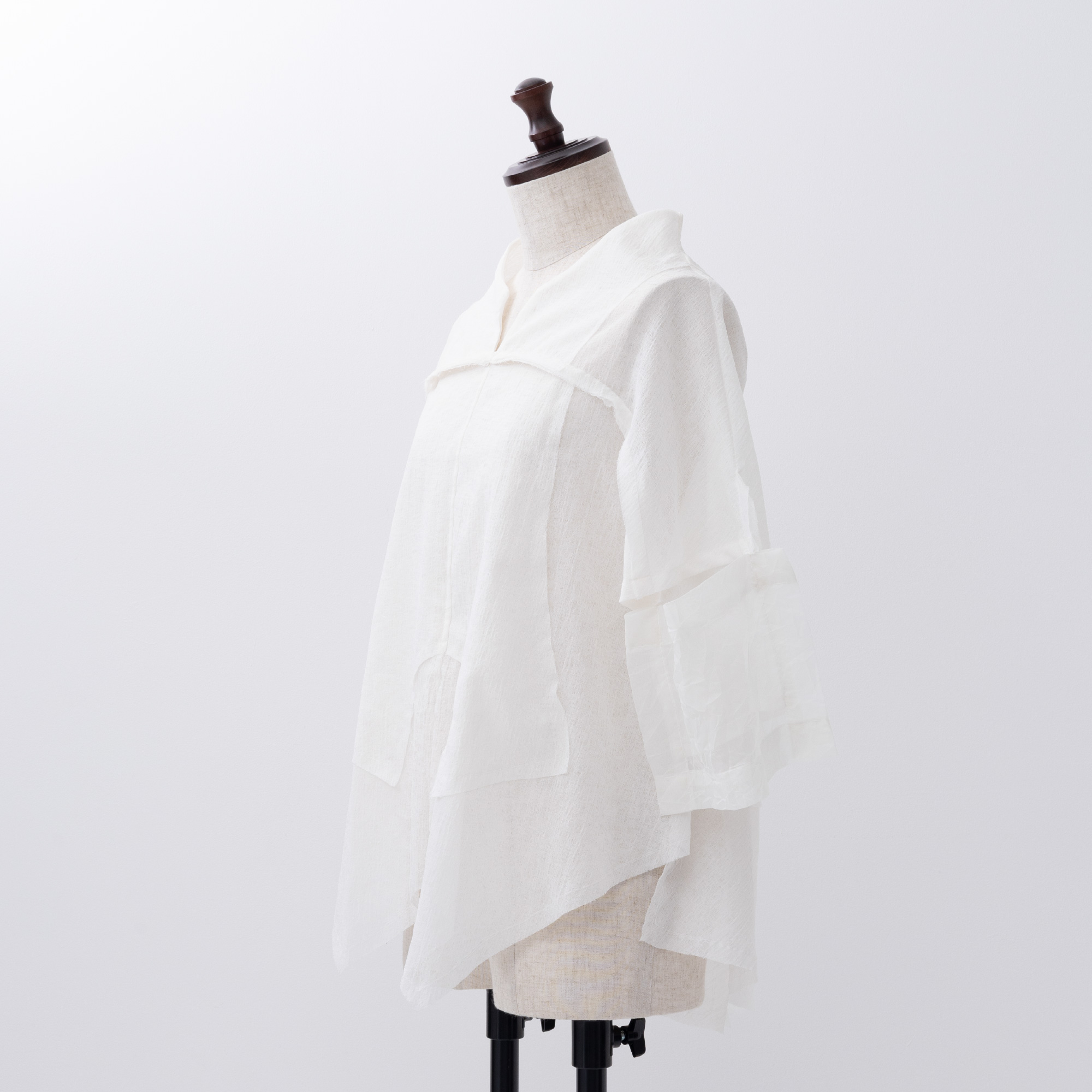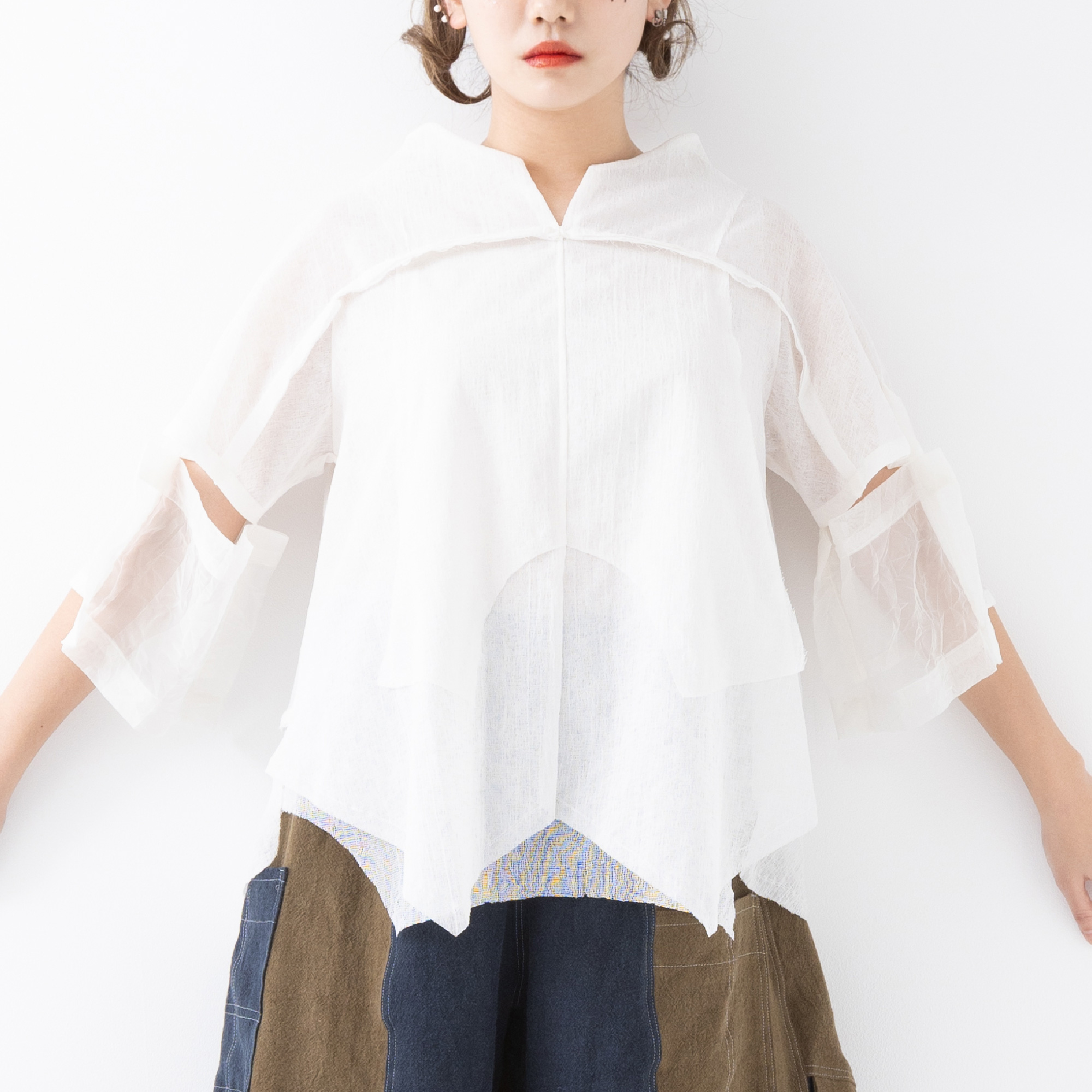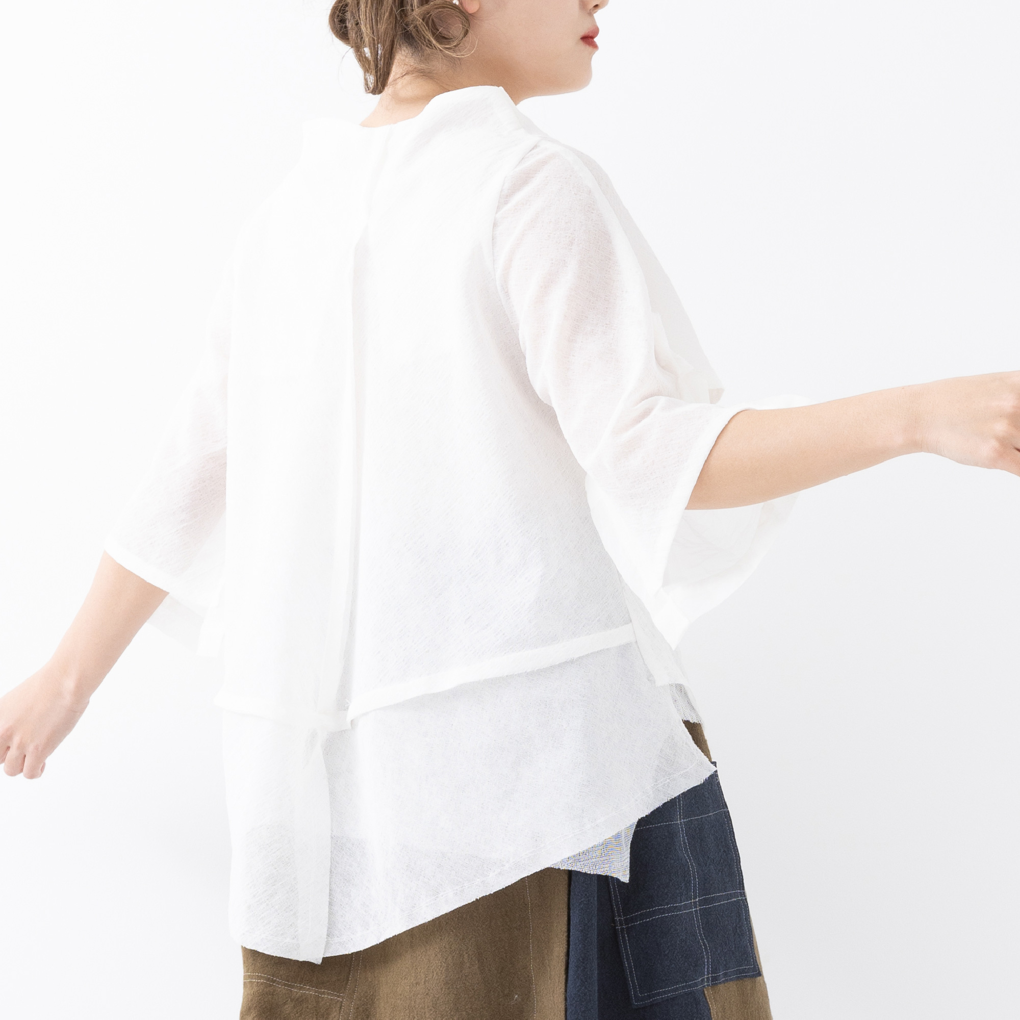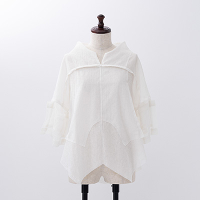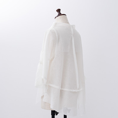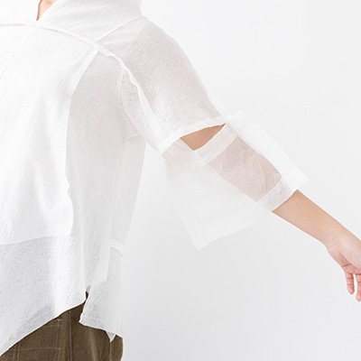 四角く大きなオーガンジーの袖は、ホールが2つあるので、半袖になったり七分袖になったりと変化します。