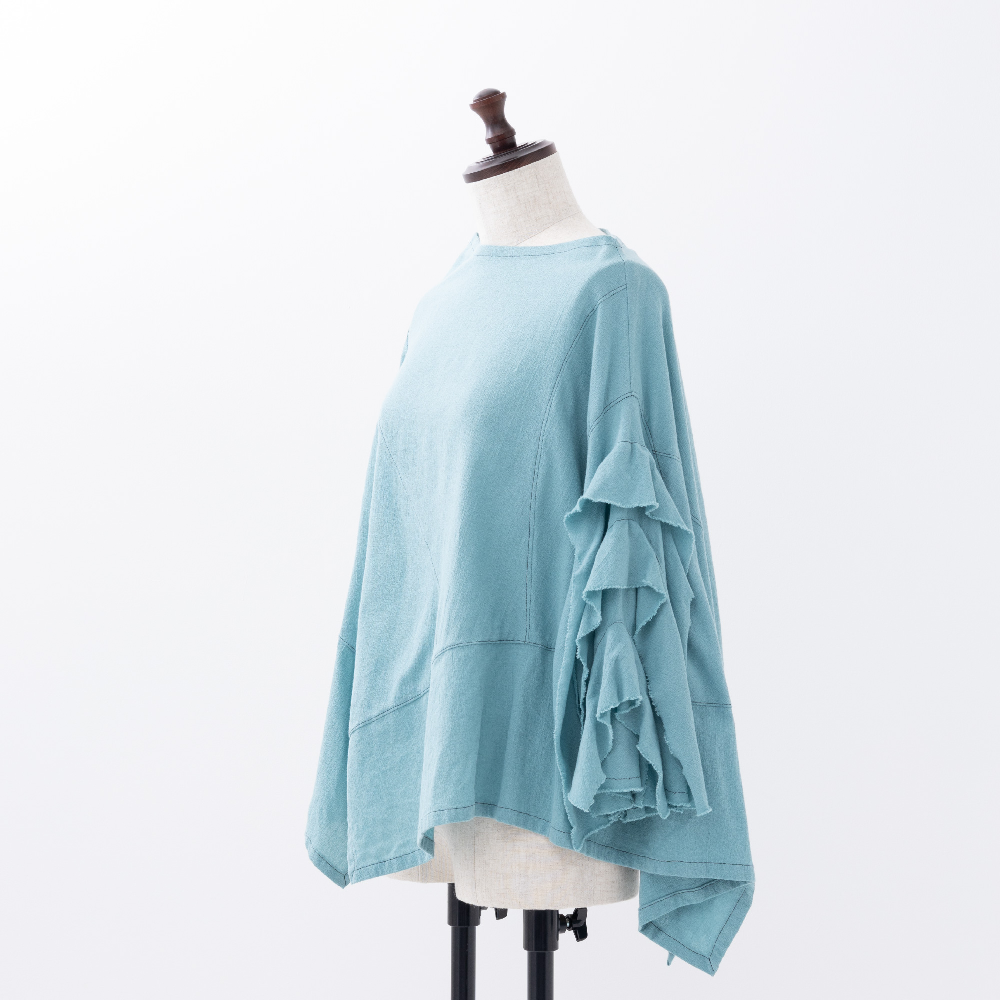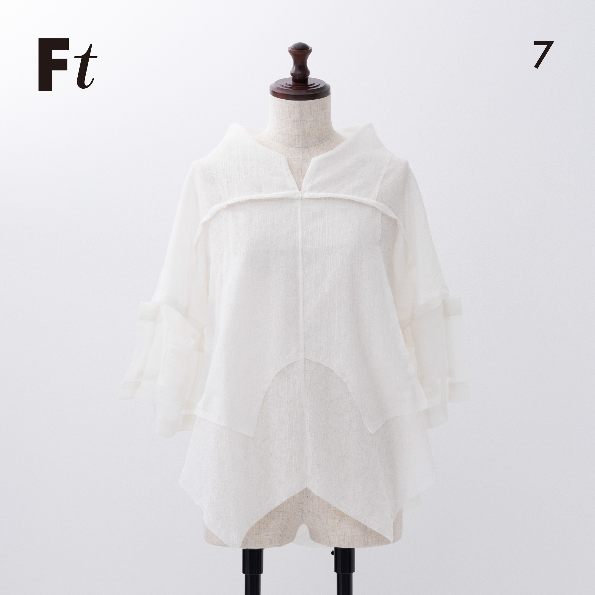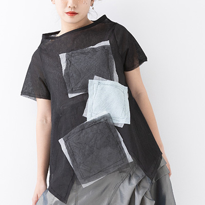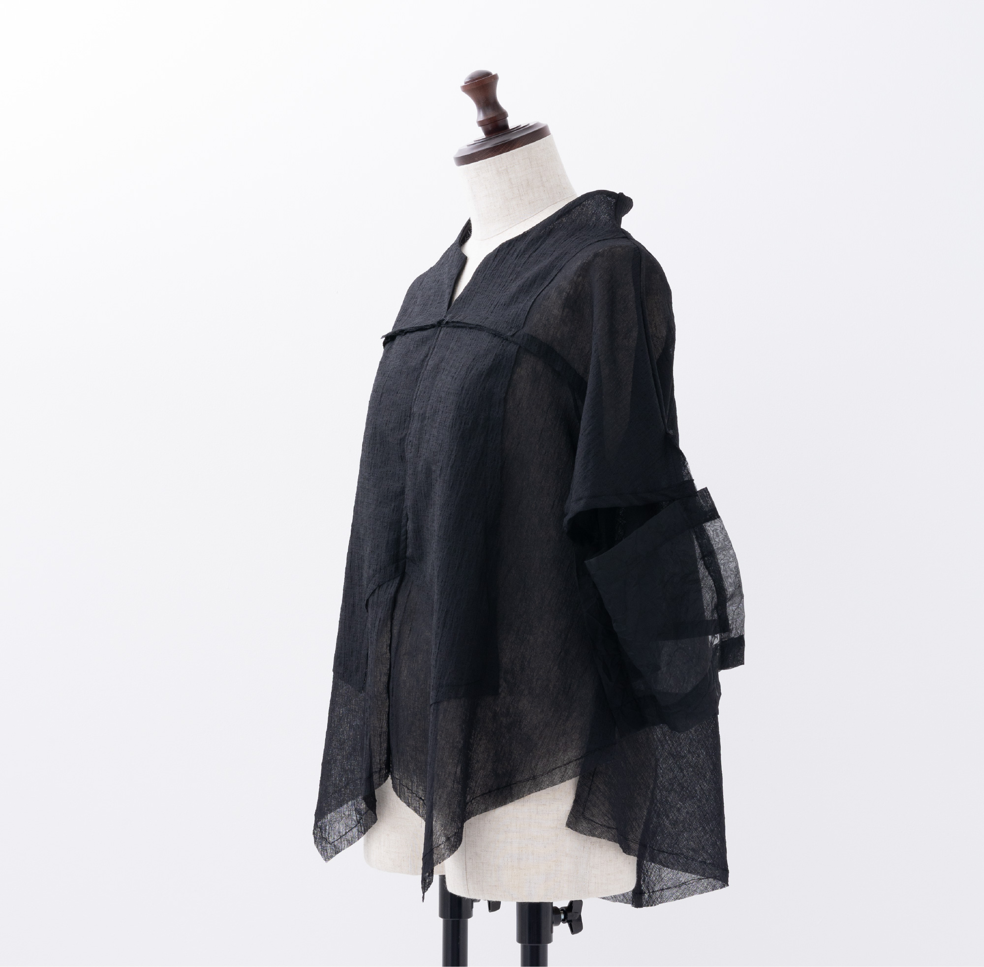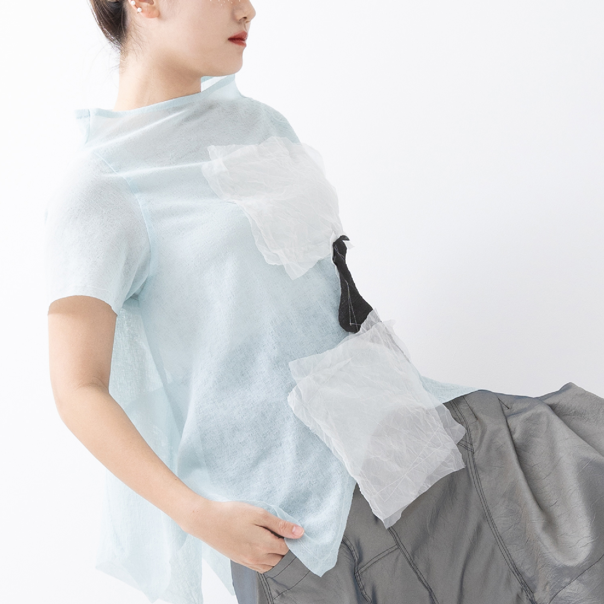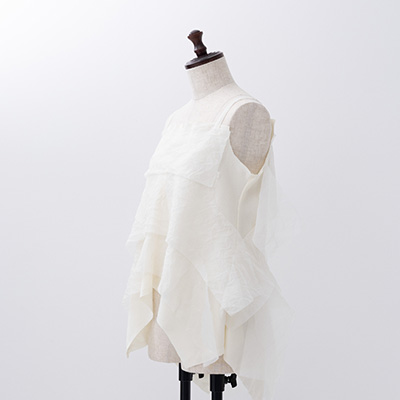 四角く大きなオーガンジーの袖は、ホールが2つあるので、半袖になったり七分袖になったりと変化します。