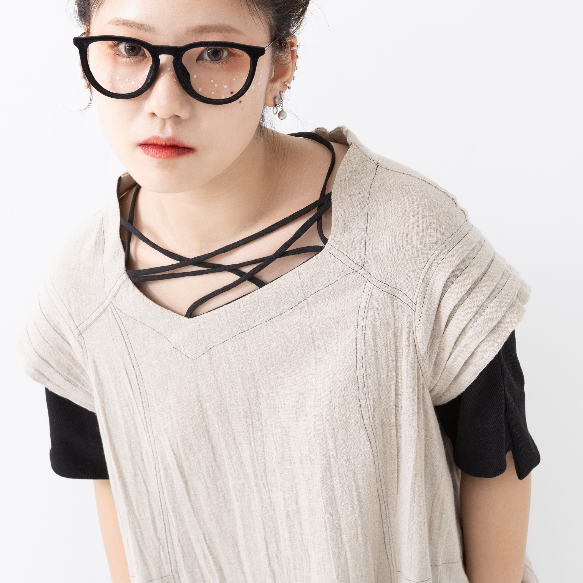 ネックラインの華奢な紐細工が、あやとり遊びのようです。