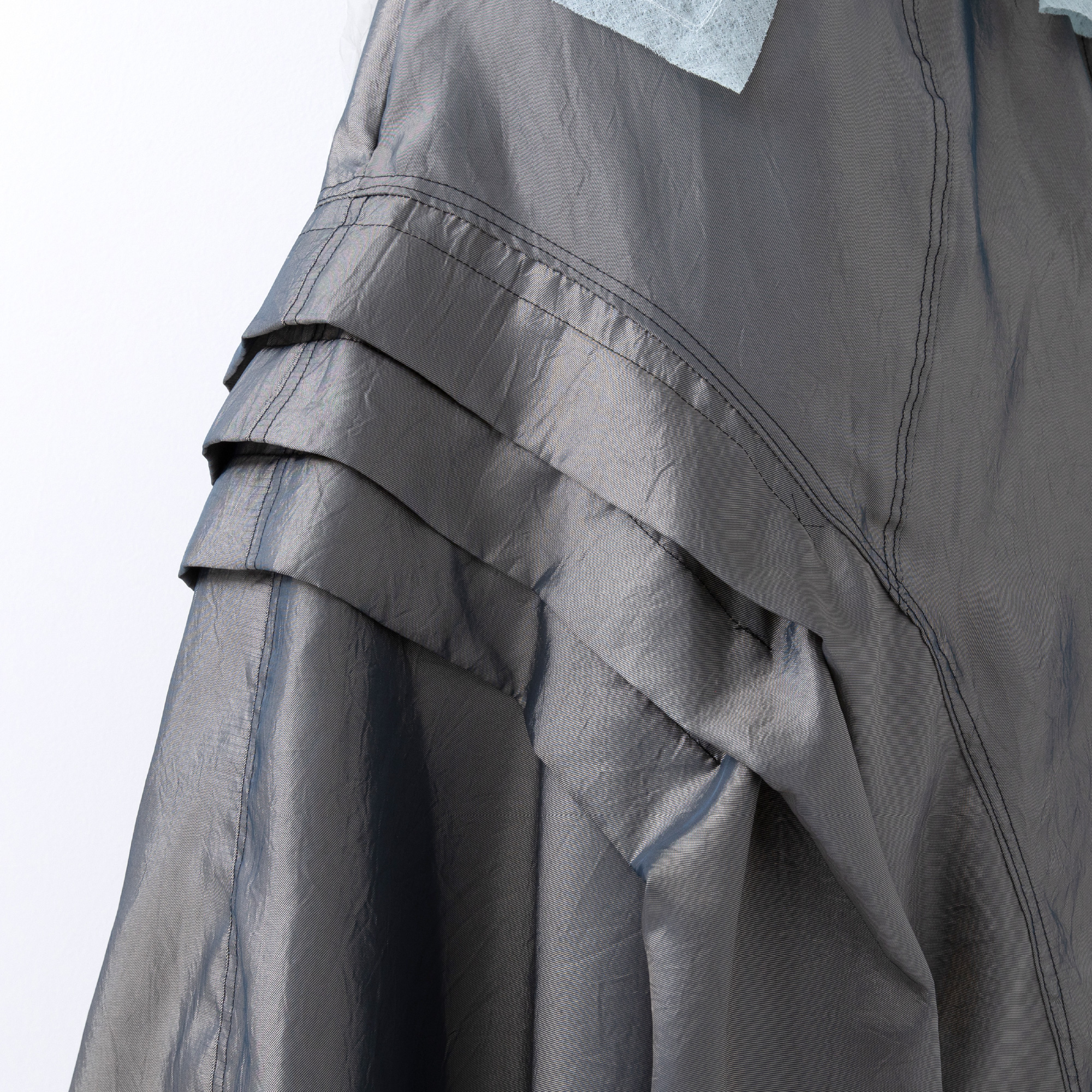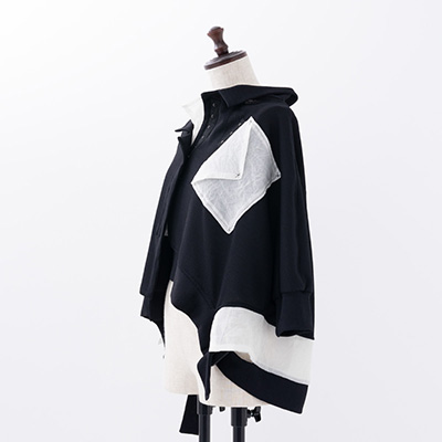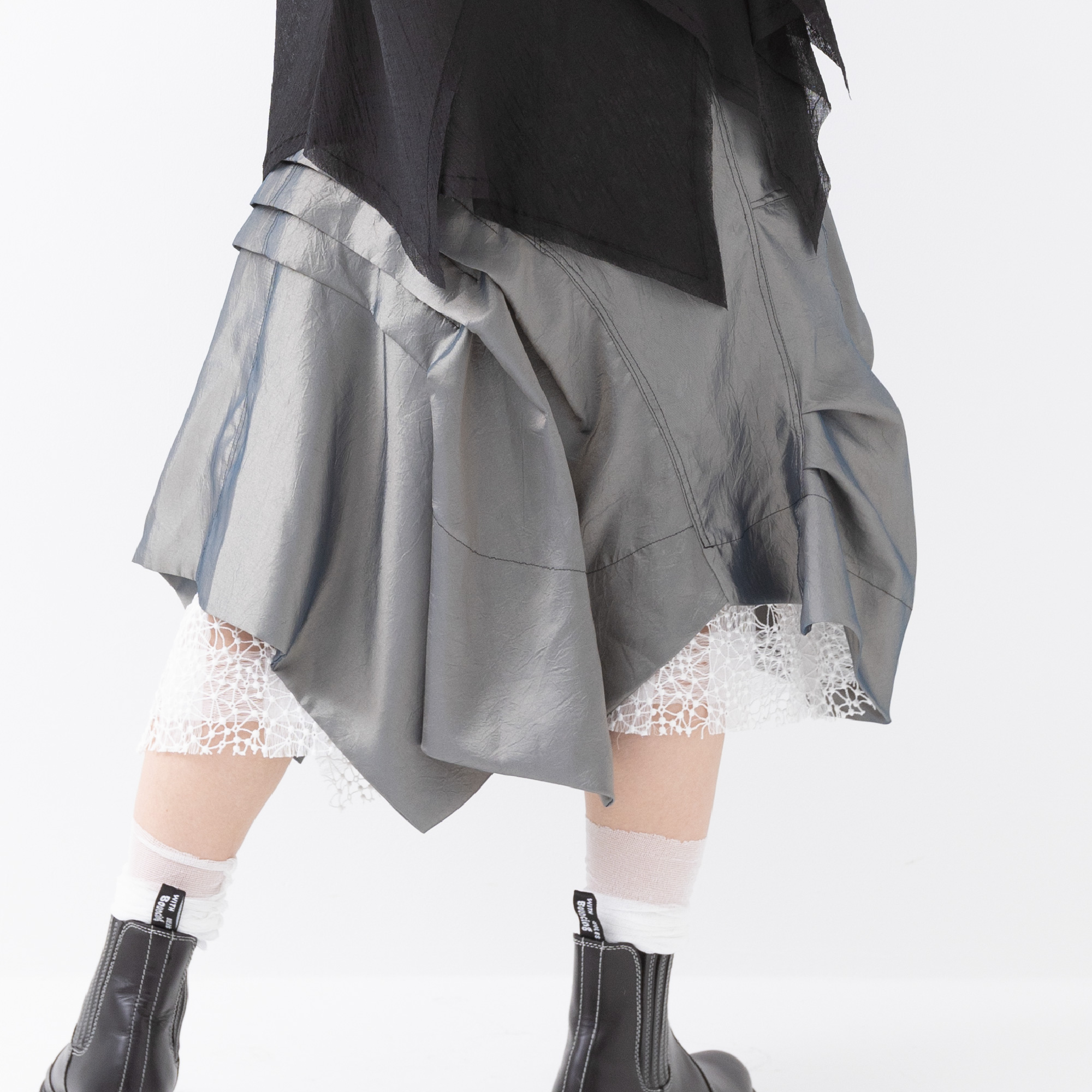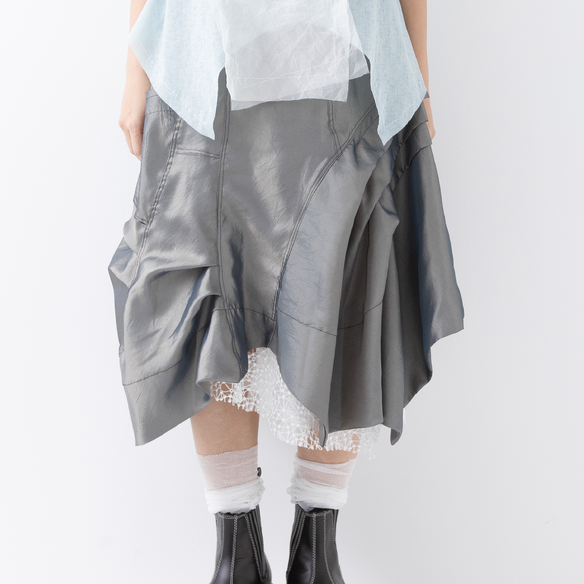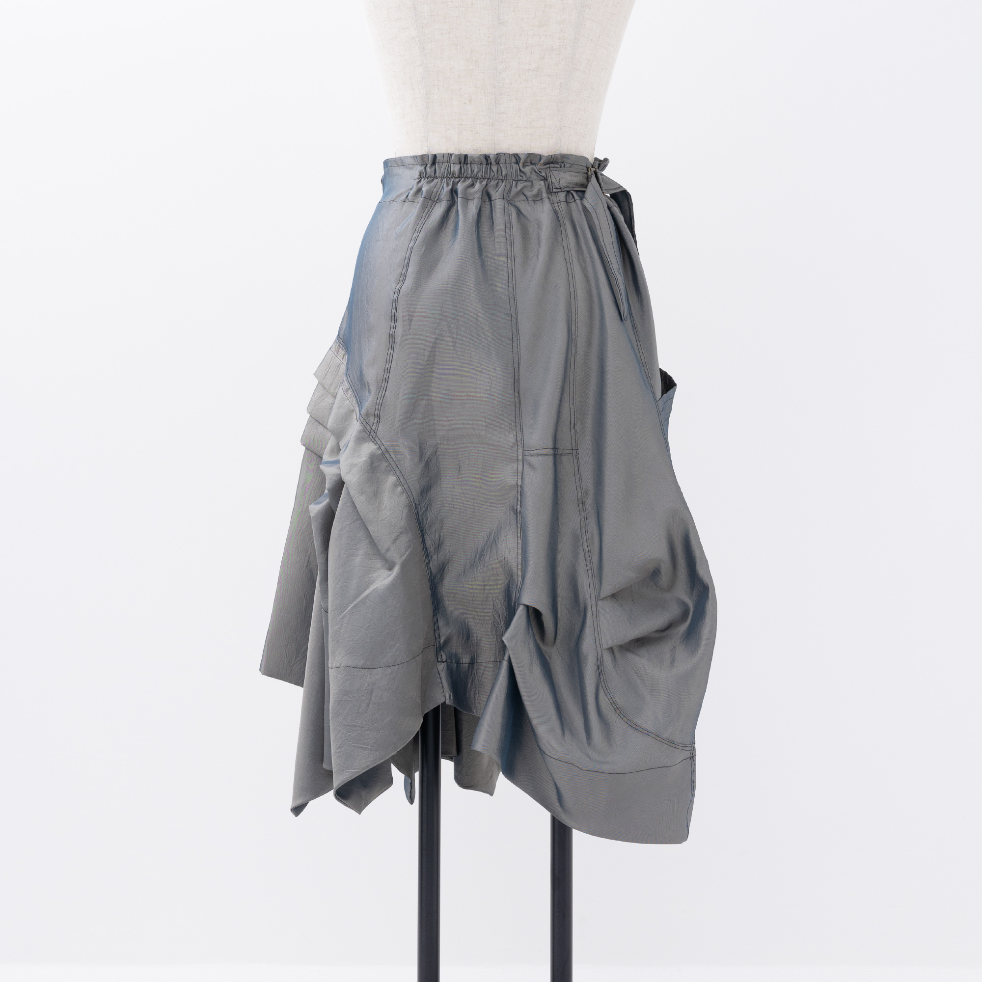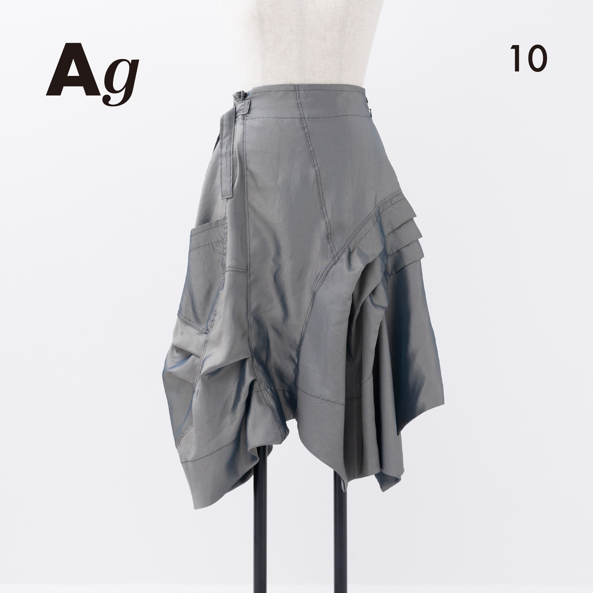 光沢感を生かしたディティールのアシンメトリーシルエット。