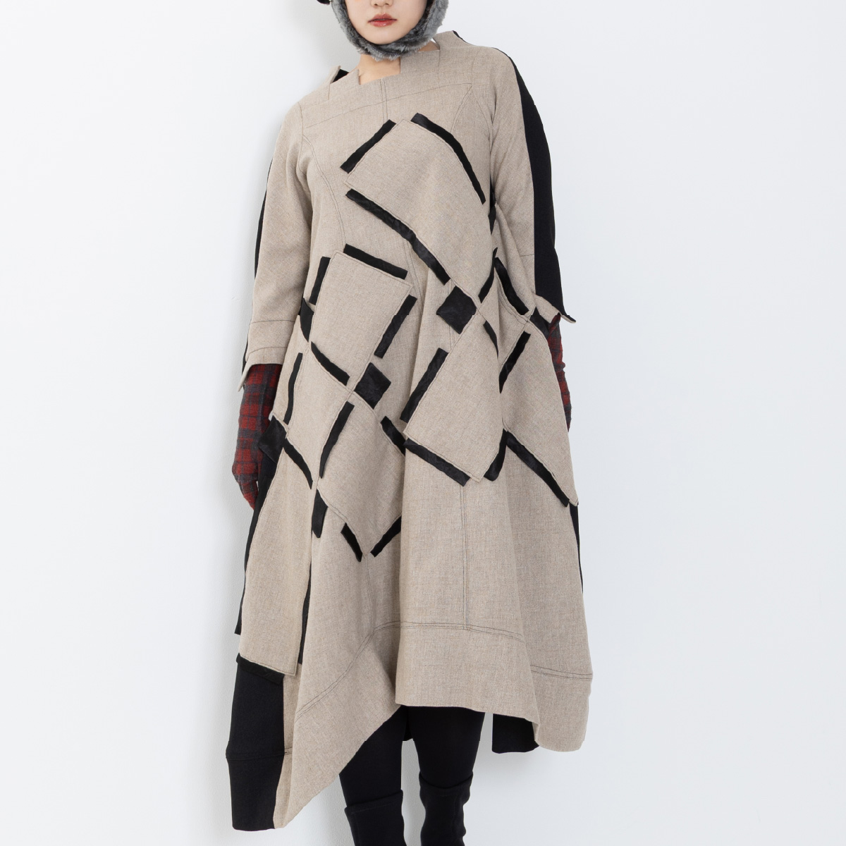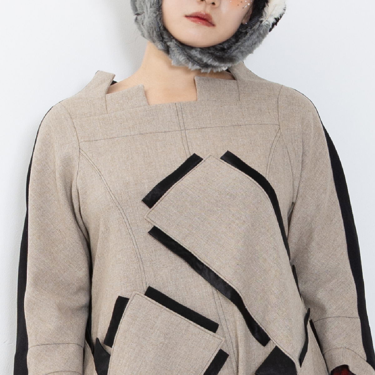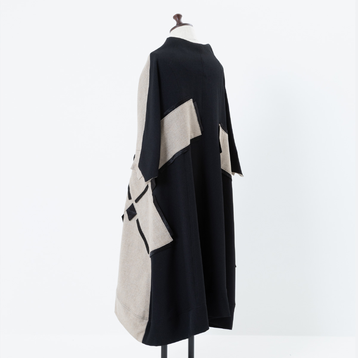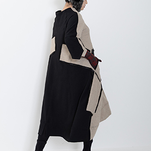 交差する街路樹や街並みをイメージしてプリントや織りに頼らず、新しい形のチェックを作る。手間を惜しまず、小さなパーツを配置していく。エリをパーツでコツコツ積み上げる、新しい手法のワンピース。豪華なディティールに包まれて街歩きしたい。