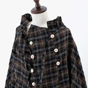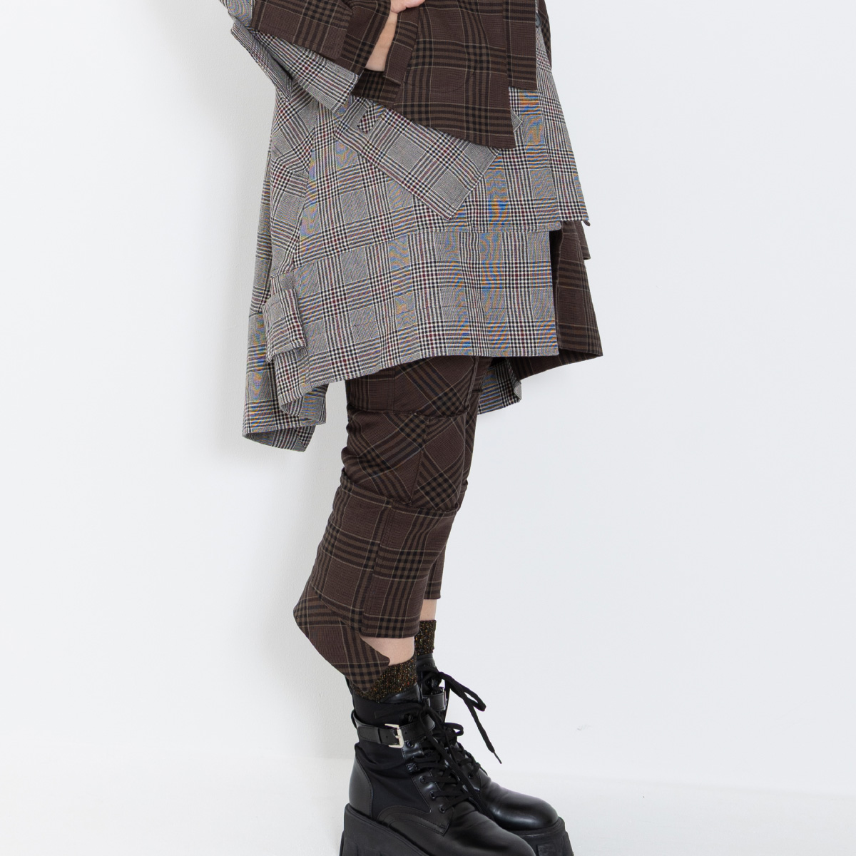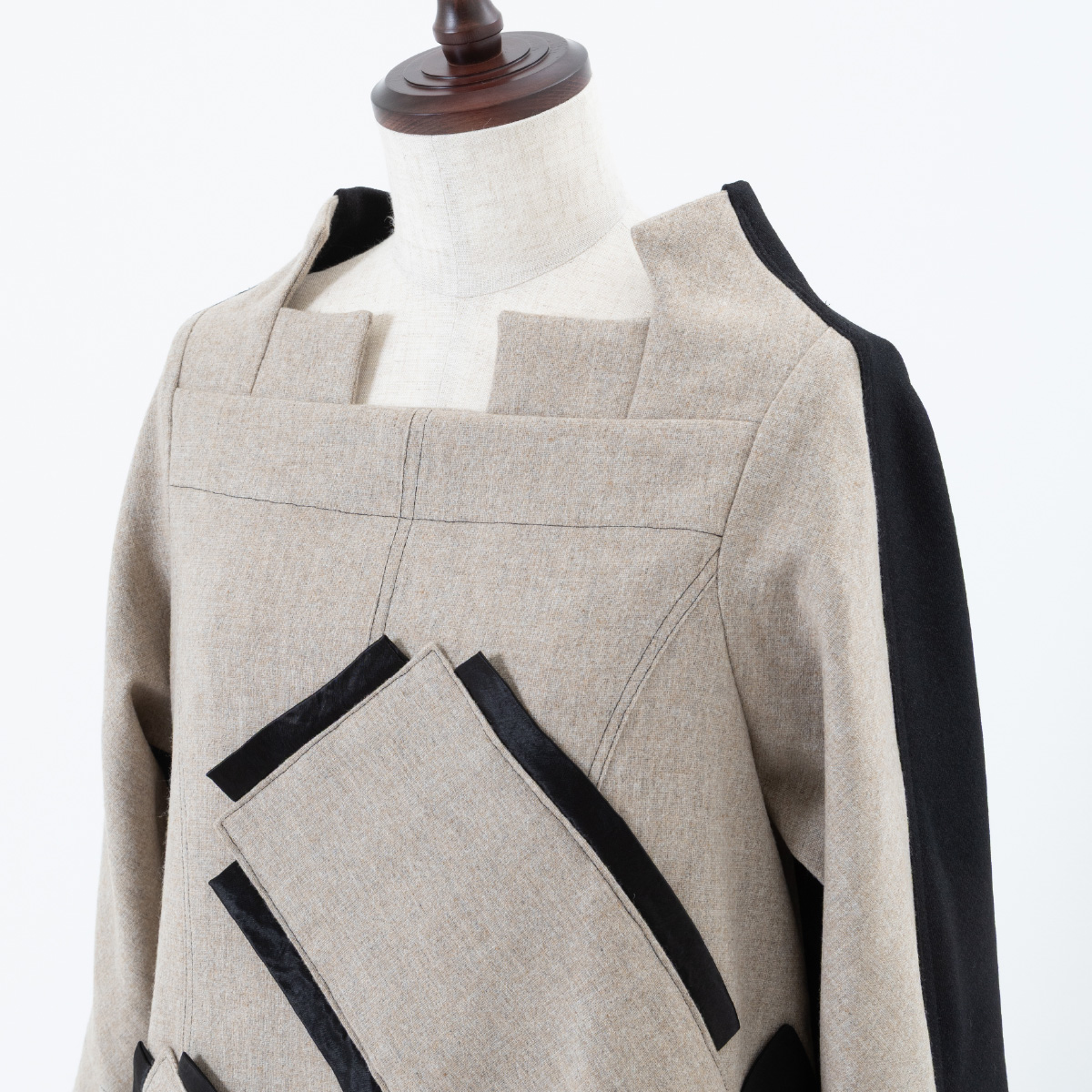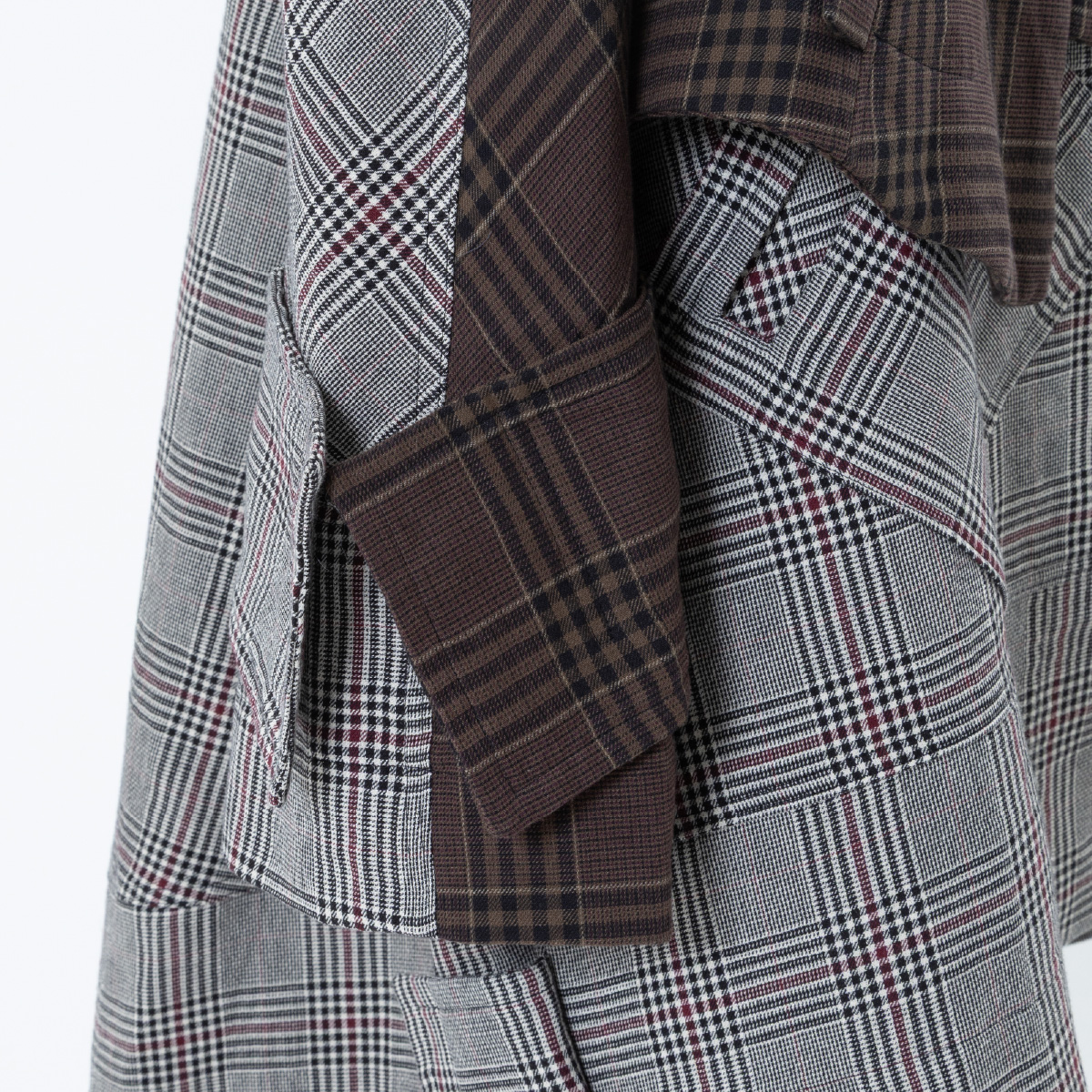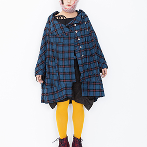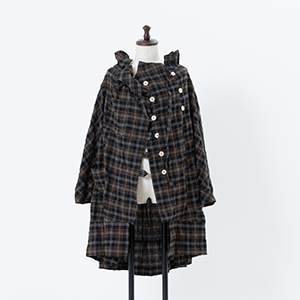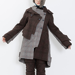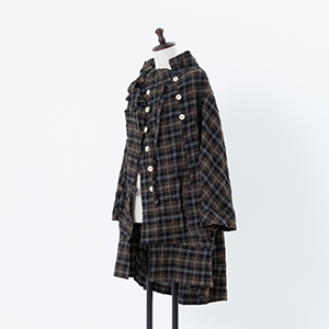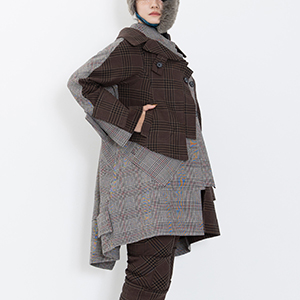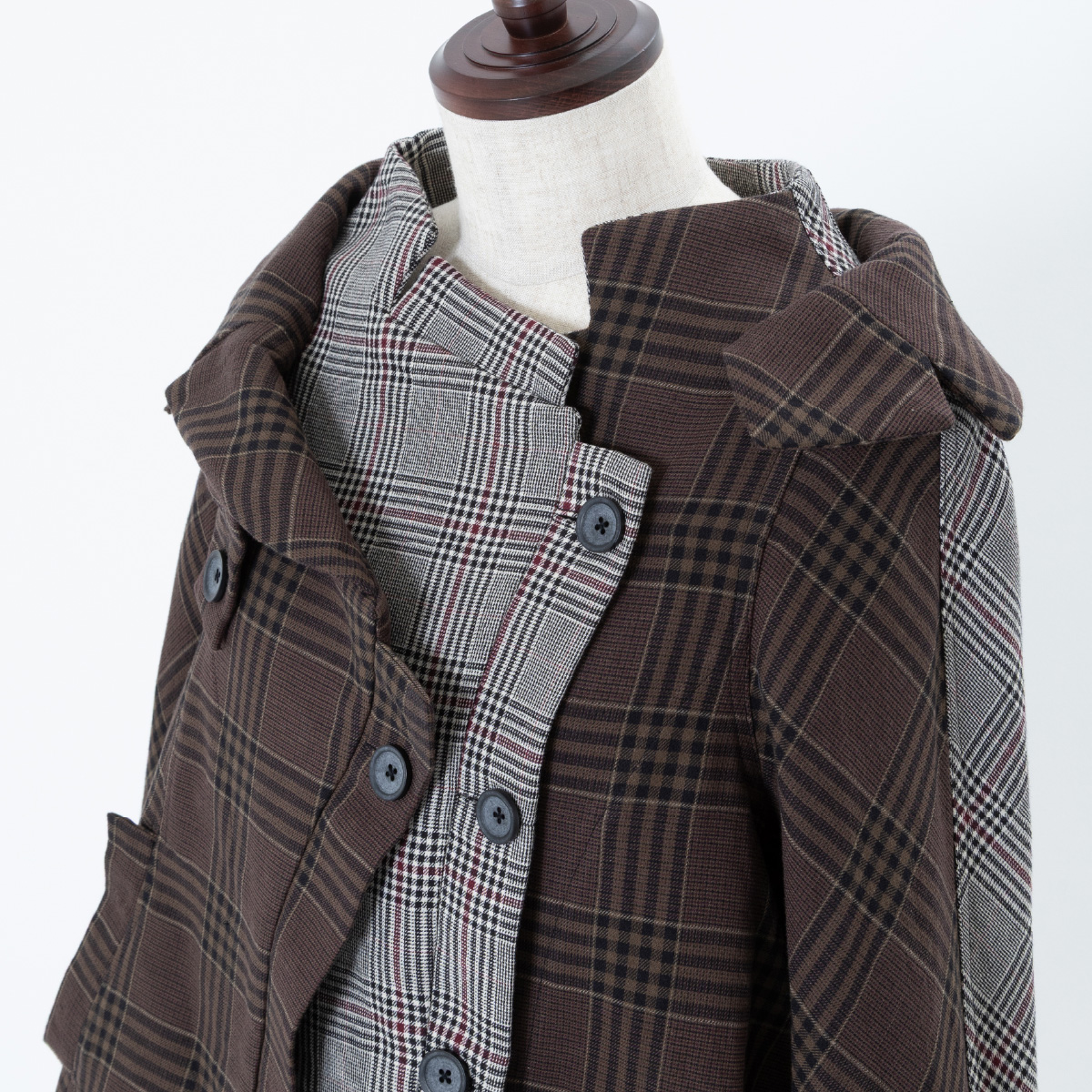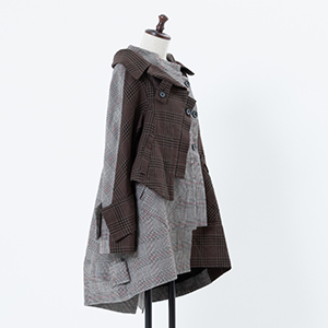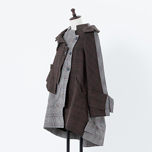 得意のコンフュージョン。まぜこぜアシンメトリーアイテム。トラディショナルなチェックを使い、コートとジャケットを一体化。片身だけ羽織るジャケットに、エリは全周回る矛盾。辻褄の合わないことを、合うように設計するパターン作り。悩んで悩んで、出来たときの達成感があったダイナミックなコート。
