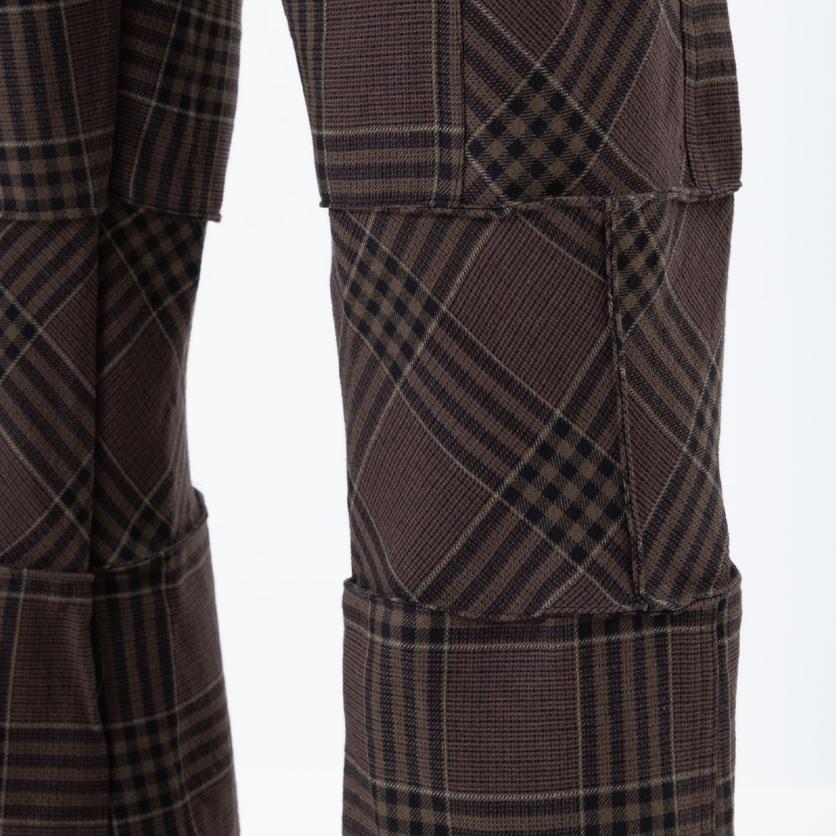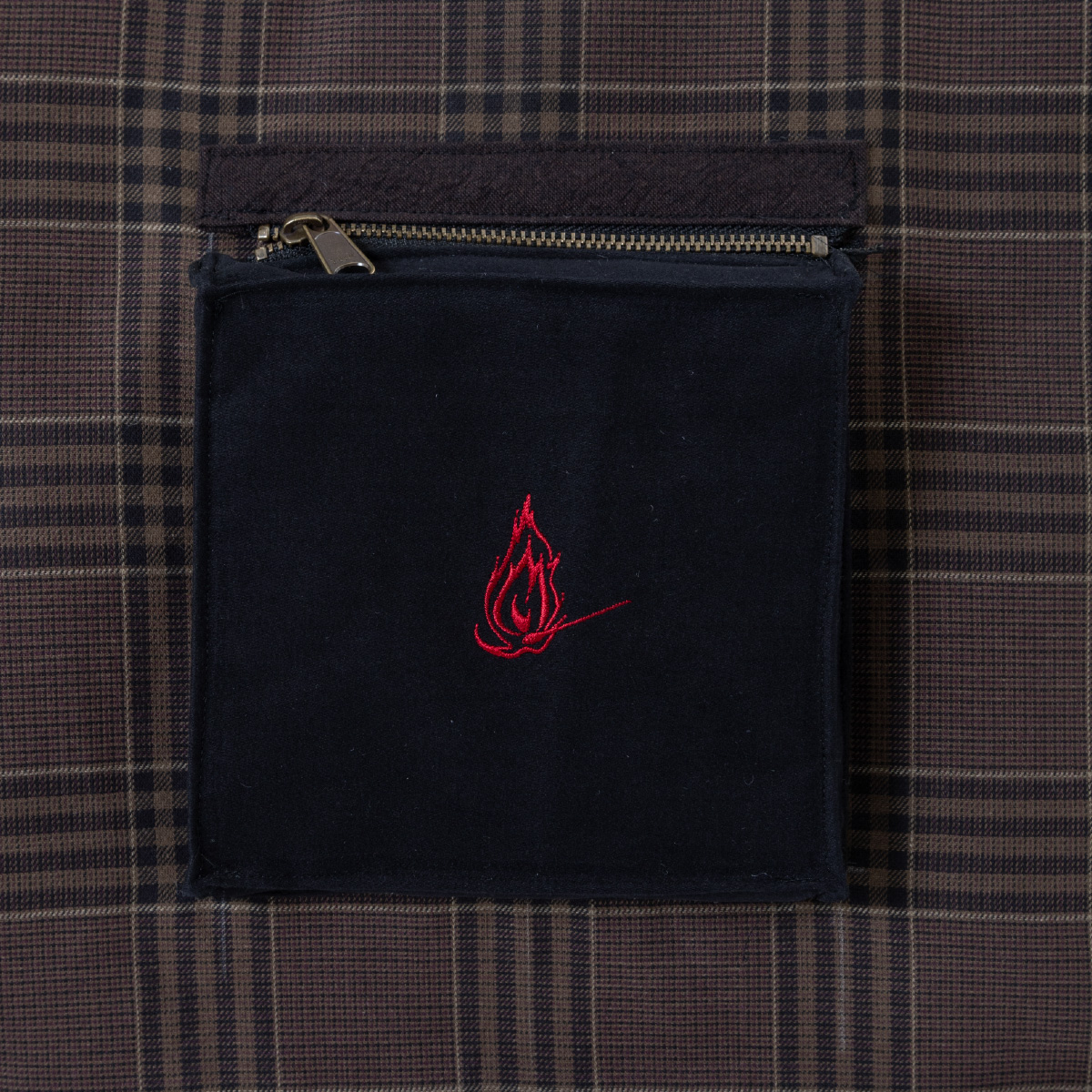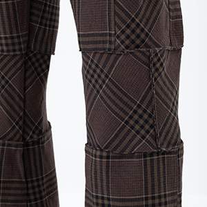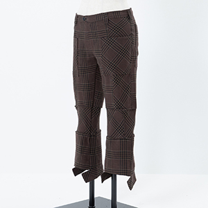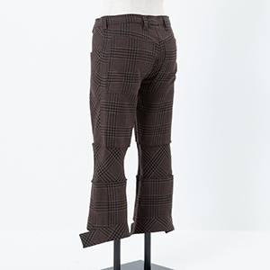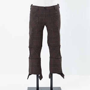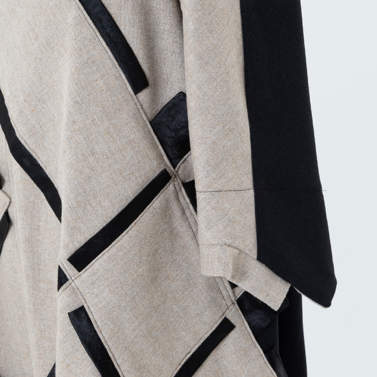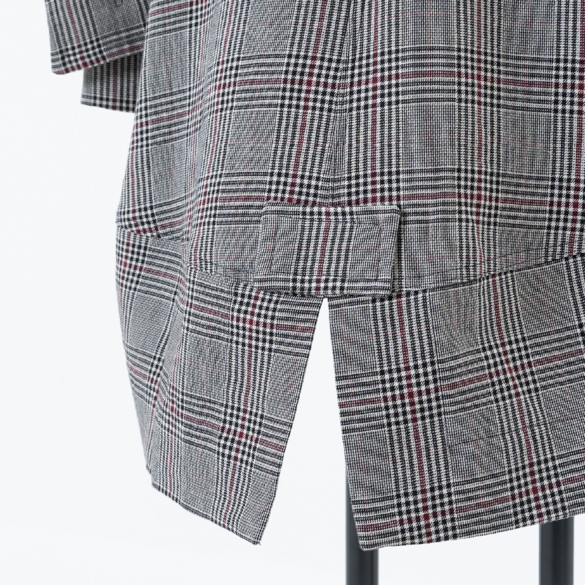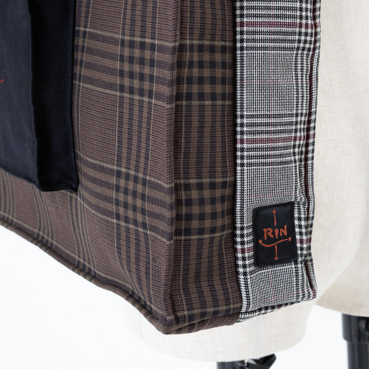 得意のコンフュージョン。まぜこぜアシンメトリーアイテム。トラディショナルなチェックを使い、コートとジャケットを一体化。片身だけ羽織るジャケットに、エリは全周回る矛盾。辻褄の合わないことを、合うように設計するパターン作り。悩んで悩んで、出来たときの達成感があったダイナミックなコート。
