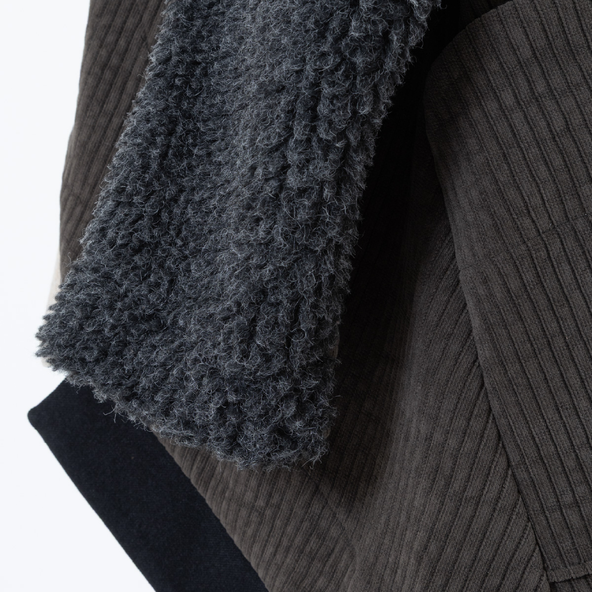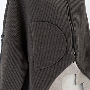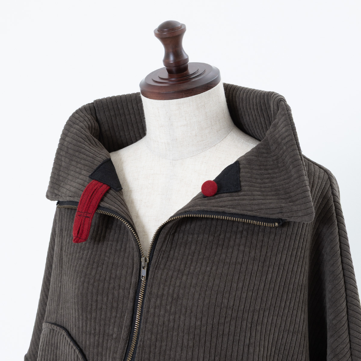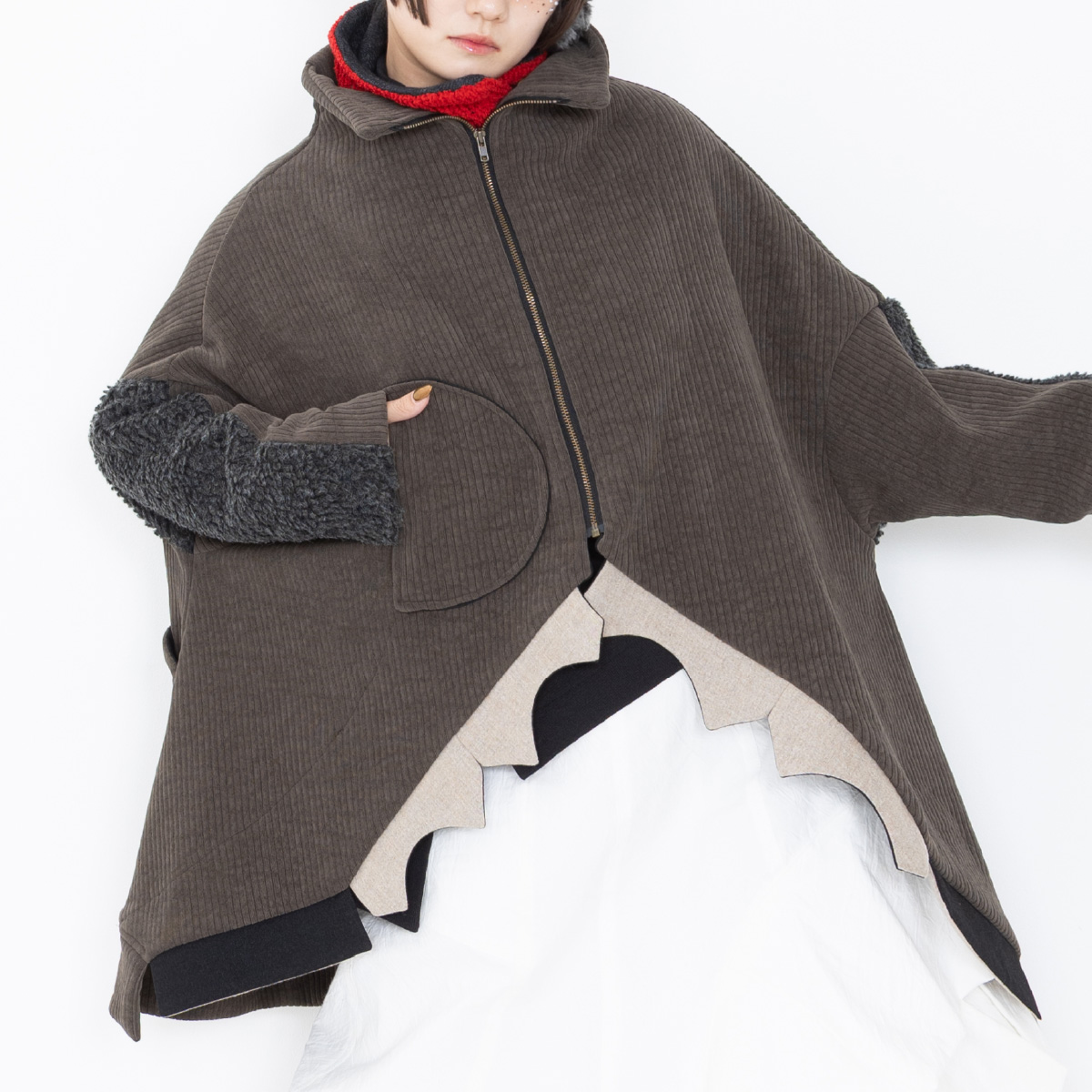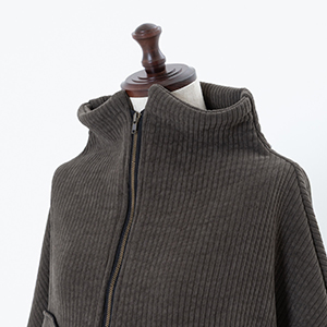 スッキリとしたジップ仕立てのコート。短い前丈に、精密なレリーフ。こっそりと牙のようで愛嬌がある。冬ならではのコーデュロイの質感。安心感のある重みで、包み込むようなシルエットは、風も雪も弾いてくれるマントのよう。