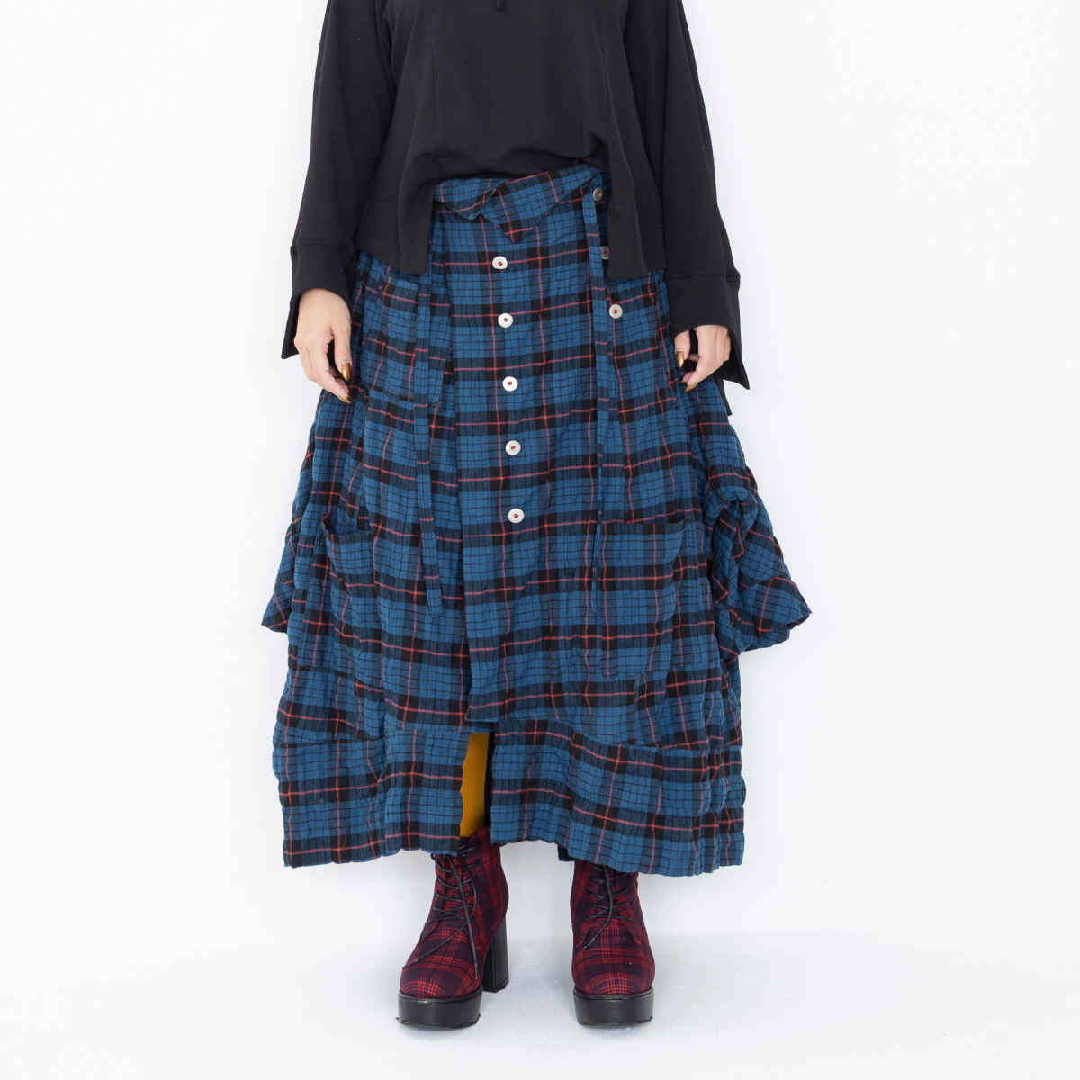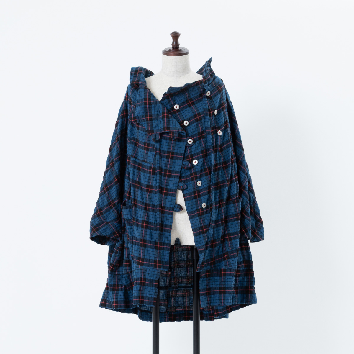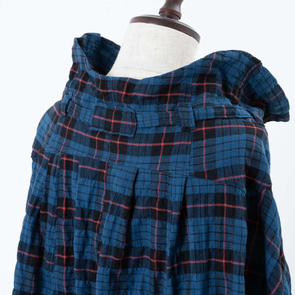 シャーリングコットンのふわふわ生地。綺麗なブルーのチェックをたっぷり使った、ワイドシルエットのガウンシャツ。あちこちに付いたボタンやリボンは、色んなアレンジが出来るように配置。オーバースカートにもなるサイズ感。自由に工夫して、ザックリ羽織るカジュアルなアイテム。