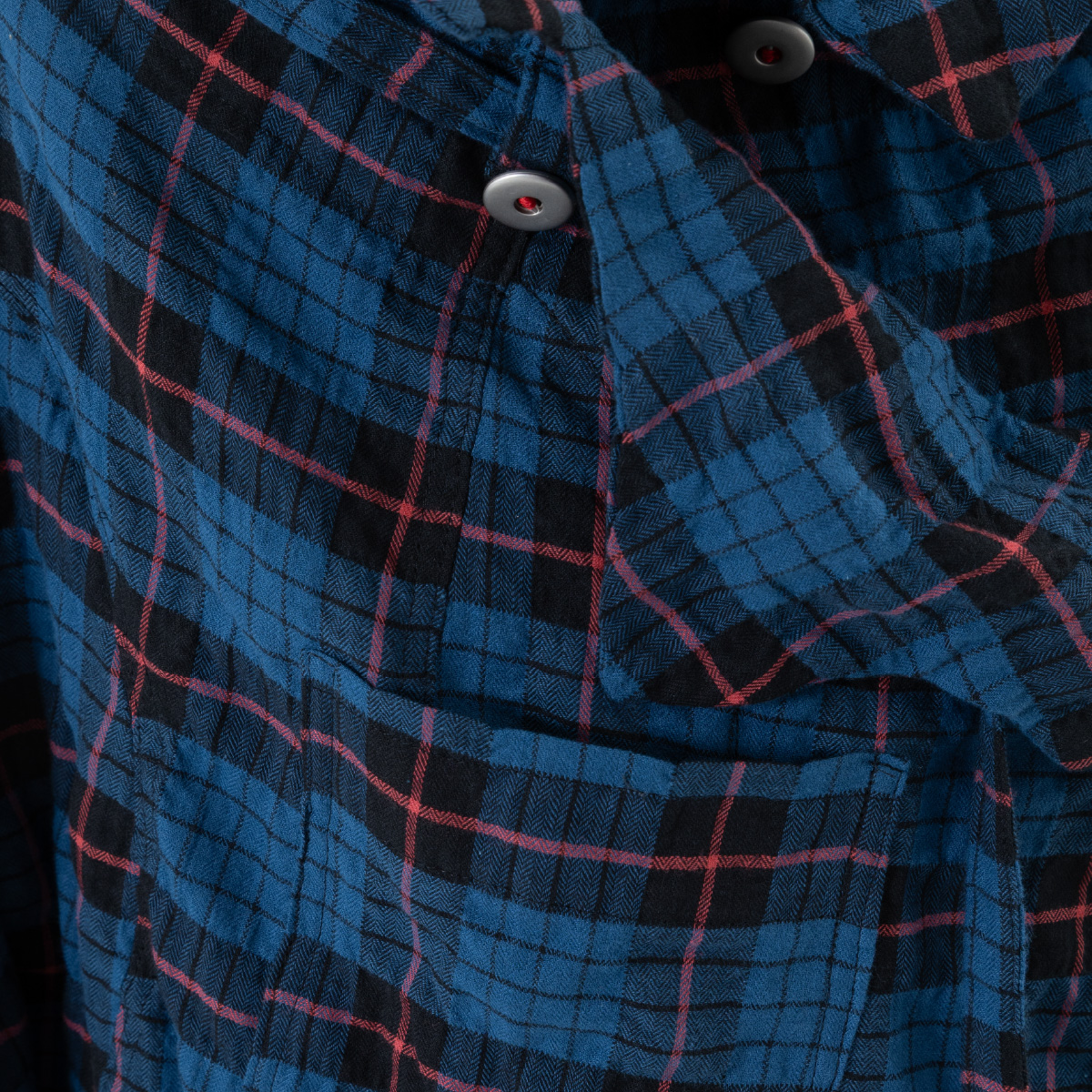 A wide silhouette gown shirt made with plenty of beautiful blue checked fabric.