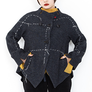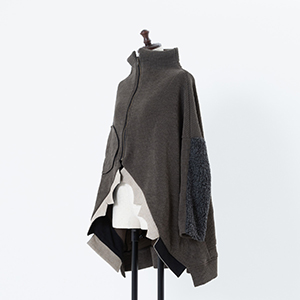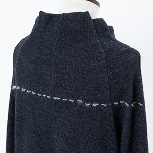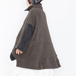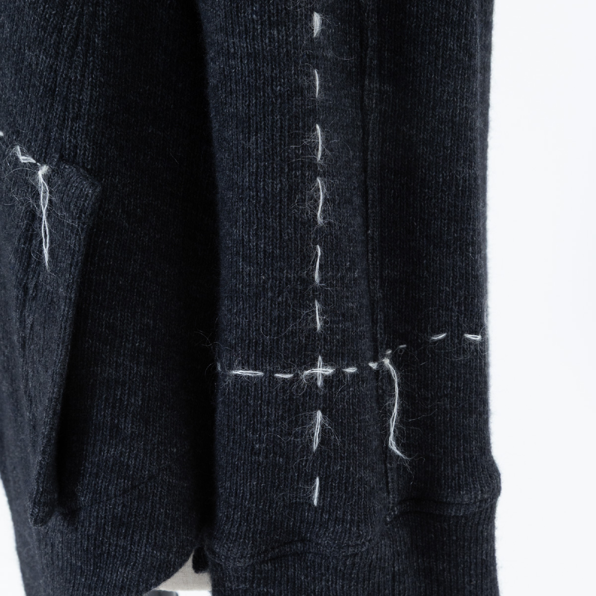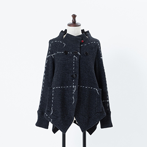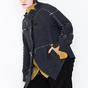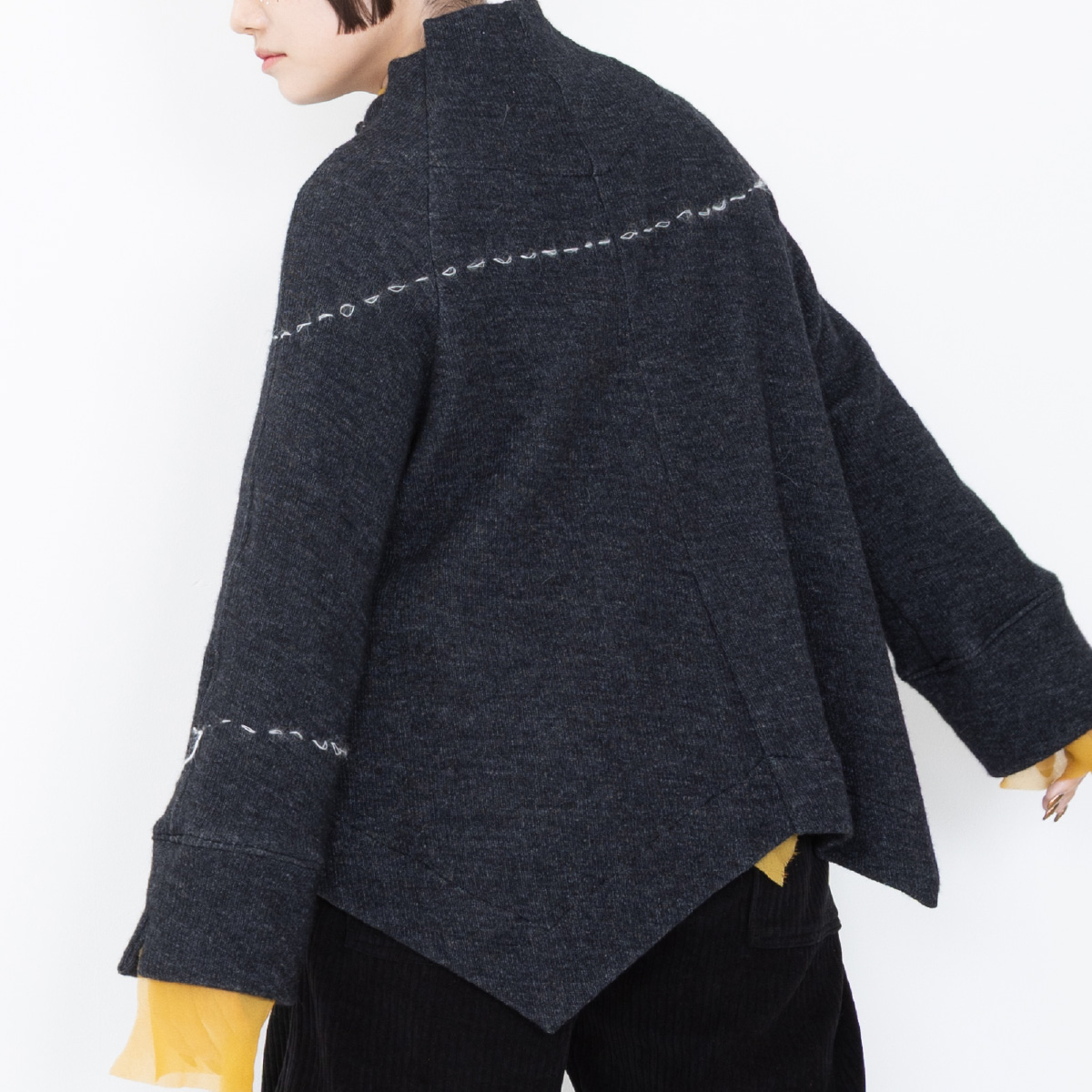 小さなアトリエブランドだからこそ出来る、細やかな仕事。モヘアのぐし縫いが、仕立屋さんの仮縫い線のよう。縦横に走るラインを、自由に描くラフステッチ。段々になったエリが楽しく、首までカバーする暖かさ。柔らかく肌触りのいいニット生地のジャケット。