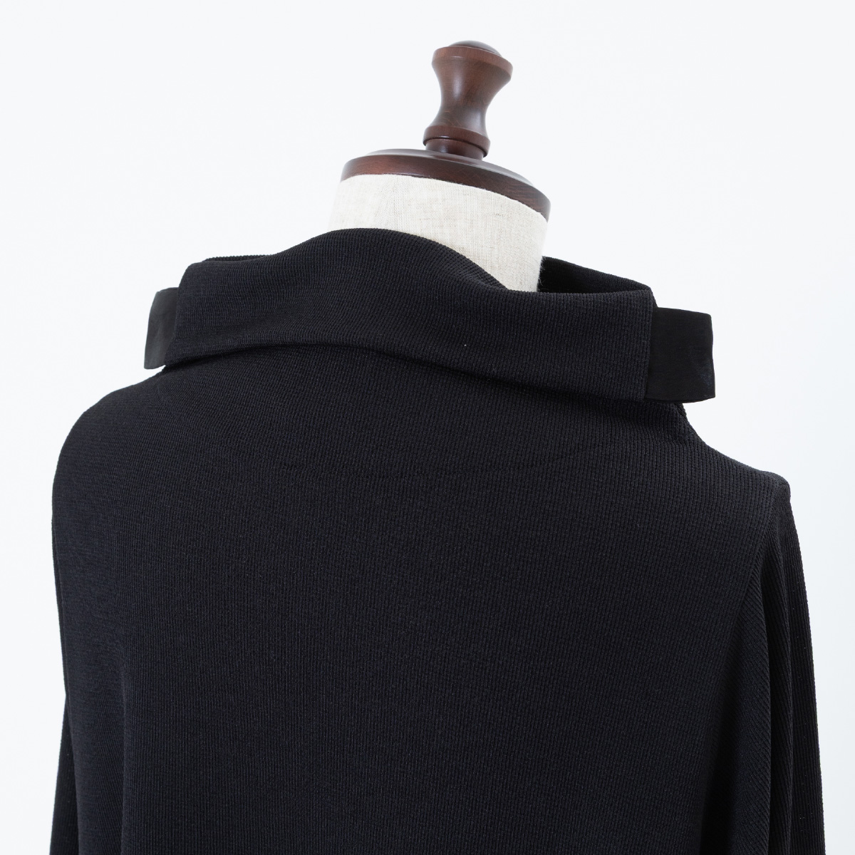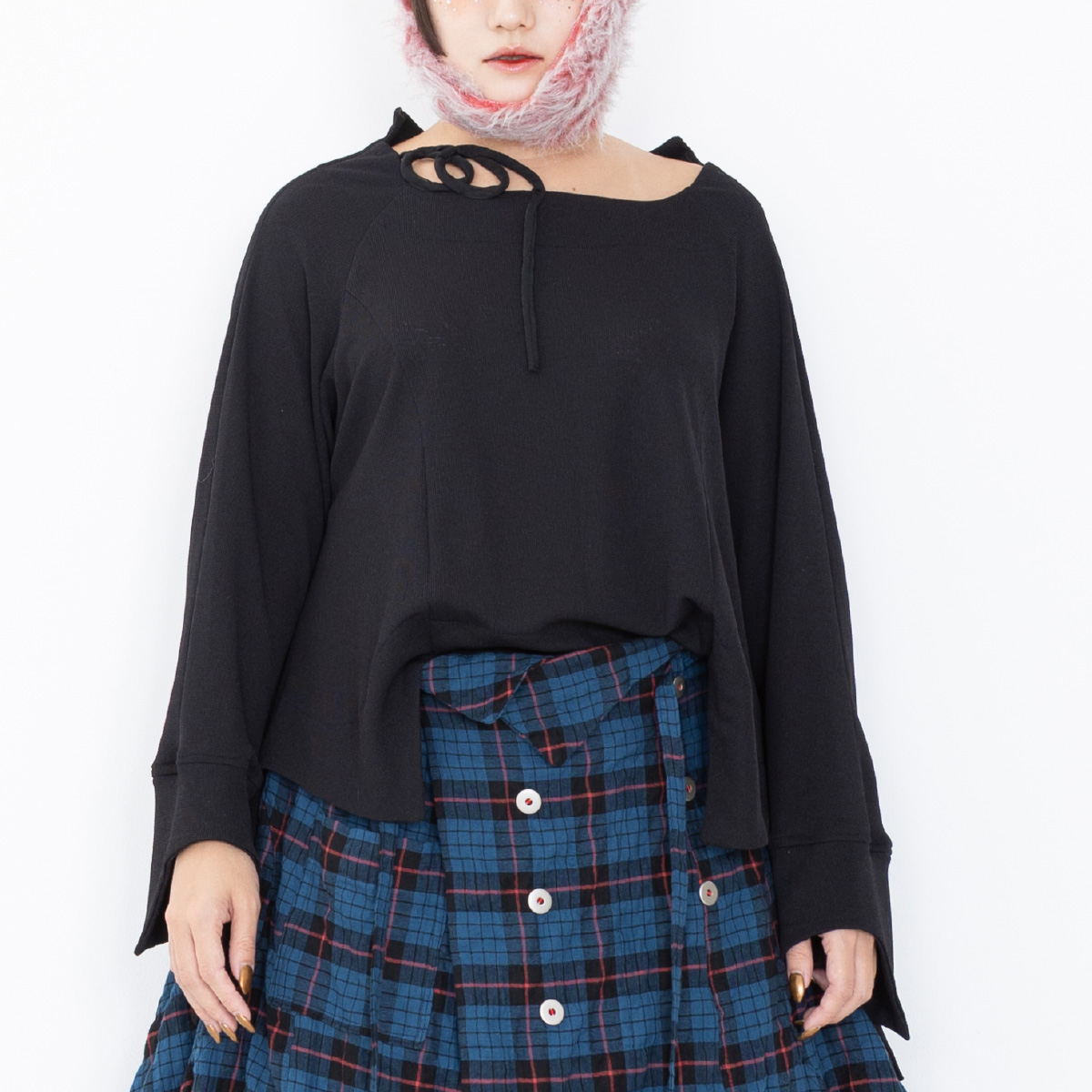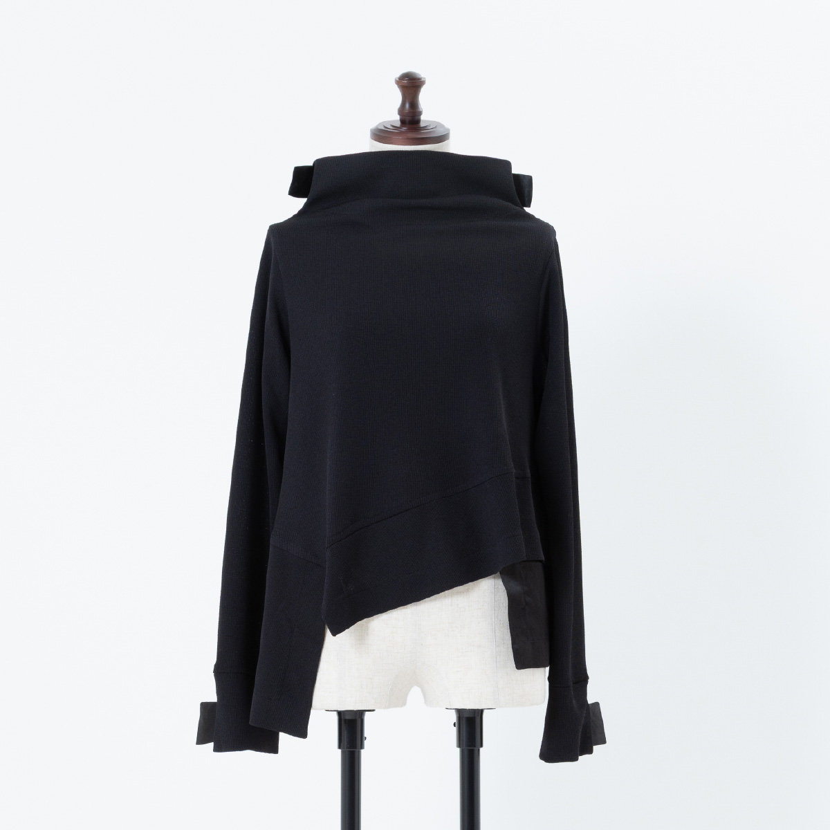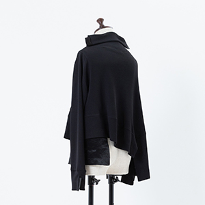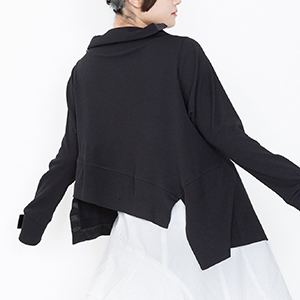 ポイントは胸元のくるり、だけじゃない。スリットいっぱいで、羽のようなスソが、ヒラヒラと遊ぶ。変形のカフスが手首を華奢にしてくれて、Aラインでゆったりと使いやすい。くるりは、手心で作っていくので一点づつ個性がある。オールブラックでサラッとしたカットソー。