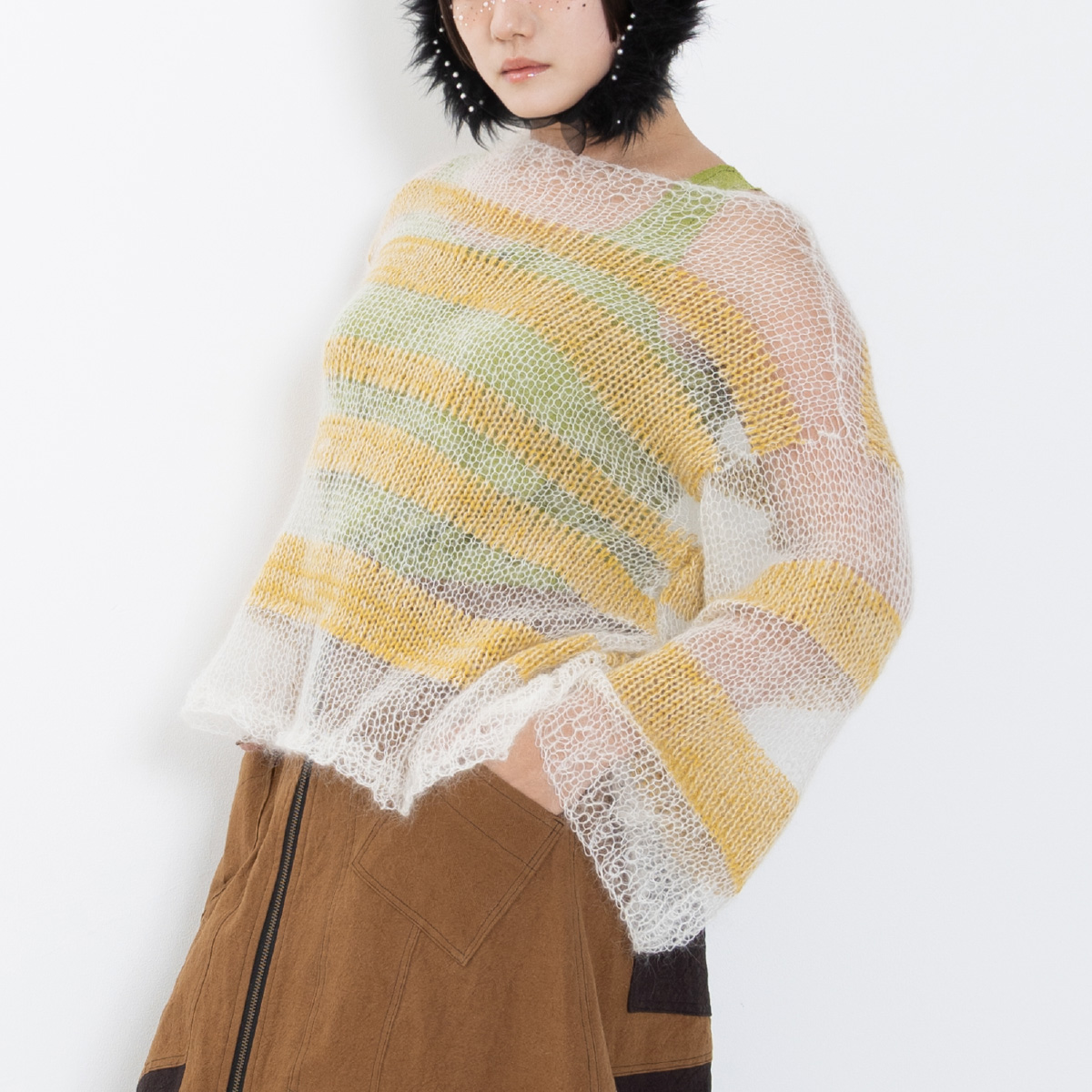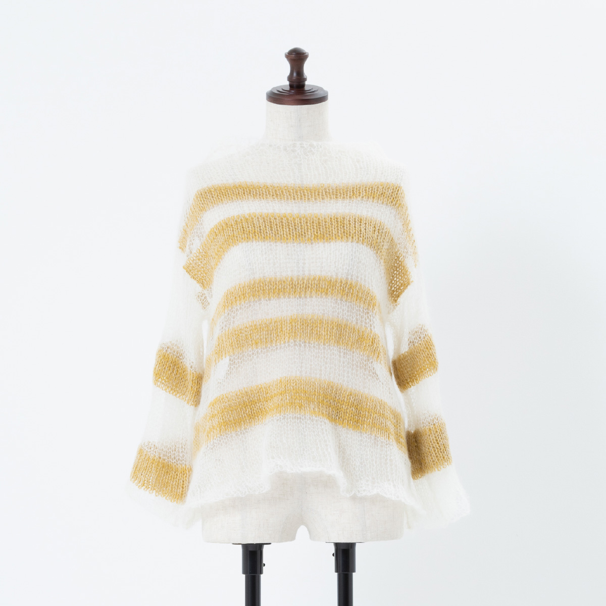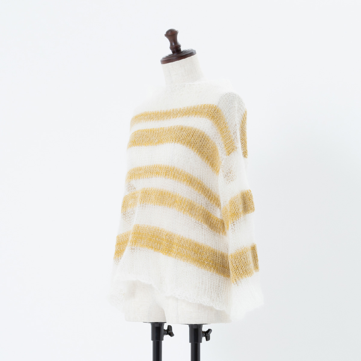 ランダムな巾のボーダーは糸の太さを変えて、ニュアンスを出す。首回りや袖口のエンド部分に仕上げをしない事で、華奢ではかなく見え、反面パンクで乱暴な印象にもなる。手編みのニットは大変で、めったに作れないけど、好きなものが売ってないので、頑張って挑戦。