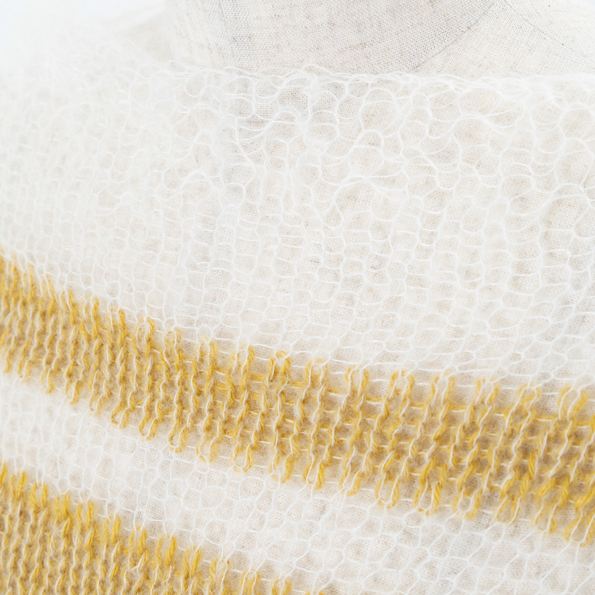 The running stitch of the mohair yarn resembles a tailor’s basting line