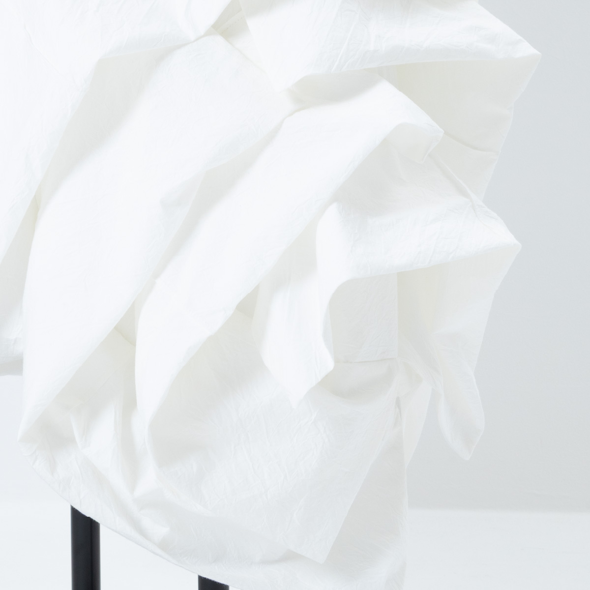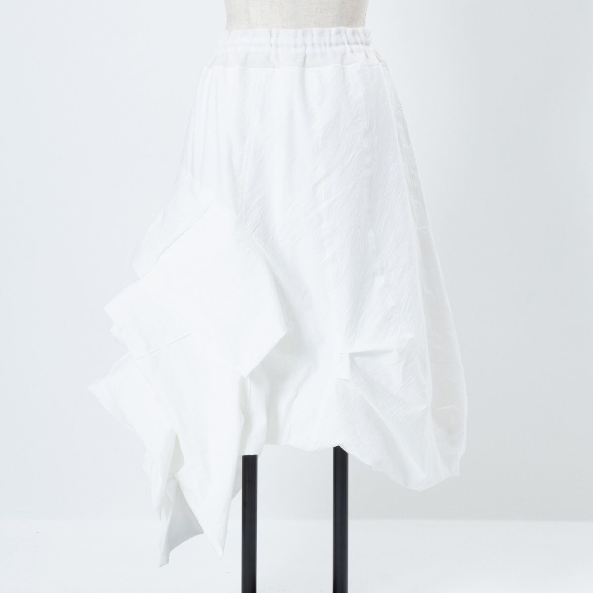大きな花が咲いたような、インパクトあるバルーンスカート。動くとパサパサと衣擦れの音がする生地は、幾重に重ねても軽い。エレガントなコーディネートもいいけれど、真っ黒のタートルや、ザックリとした靴下、ごついブーツで、カジュアルな着こなしにするのが好み。