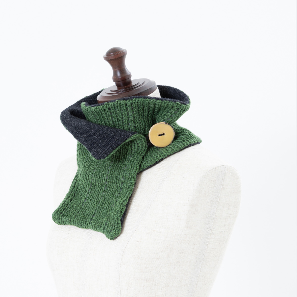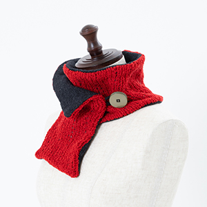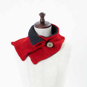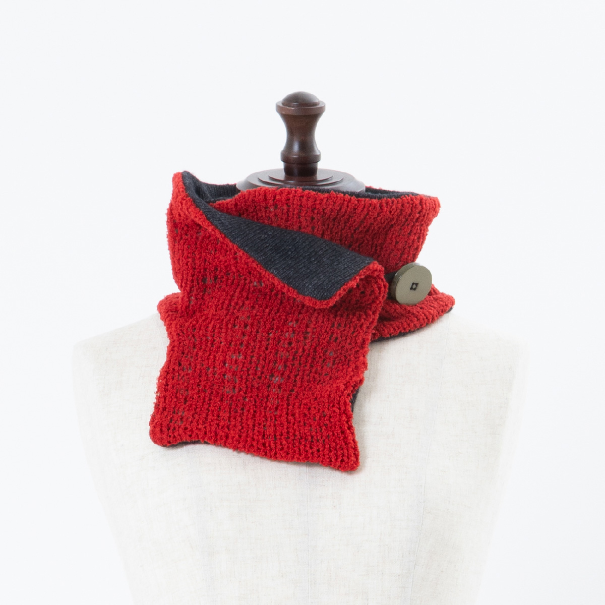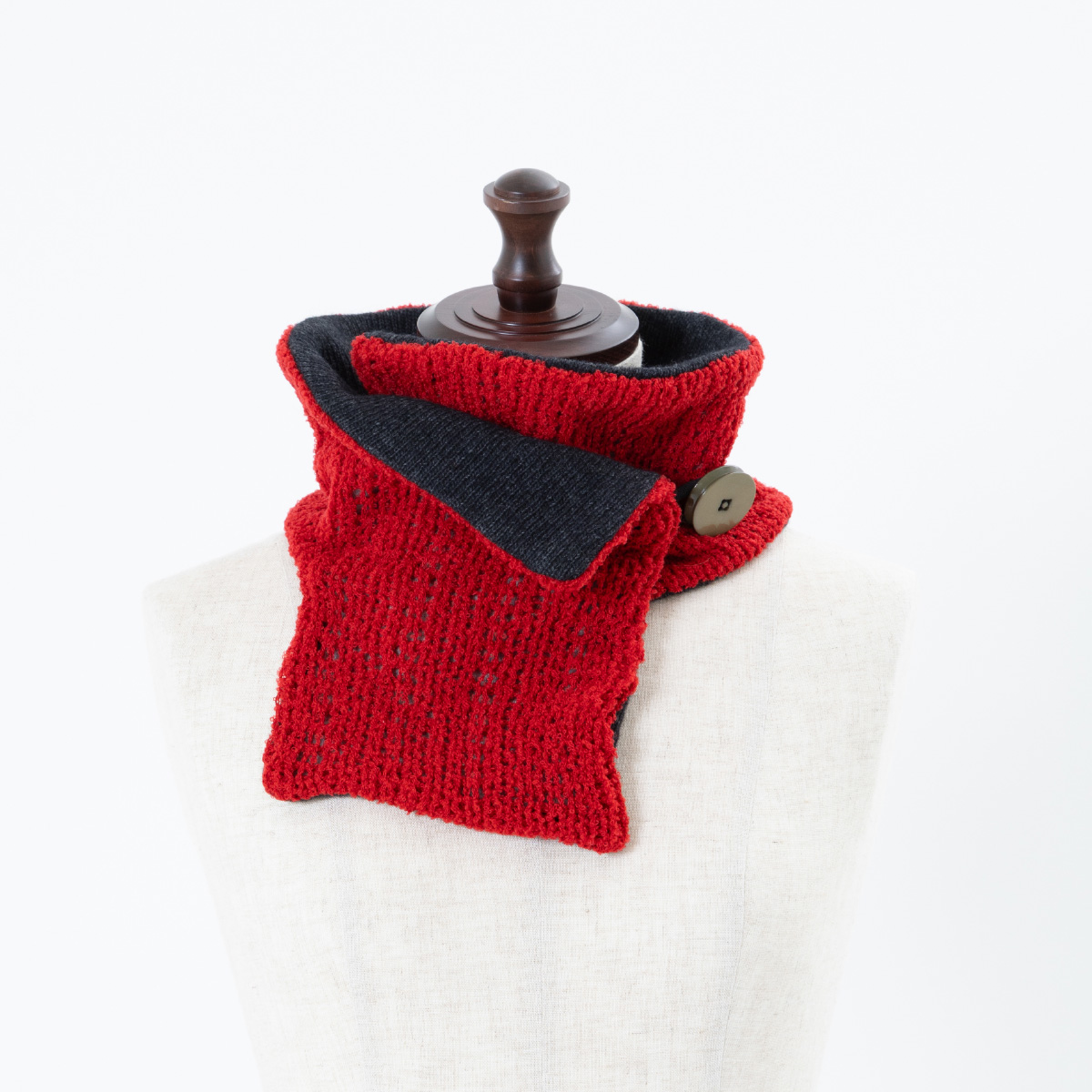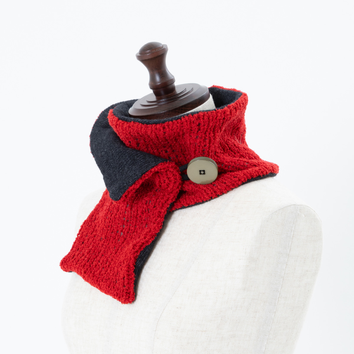 発色のいい糸で手編みをした、ミニサイズのマフラー。首にキチンとそって、とても軽い。大きなボタンがポイント。向きを変えると形も変わるデザイン。付けエリのように使ったり、スカーフのようにエリから覗かせたり、室内で付けていても違和感がない、燐の可愛いマフリン。