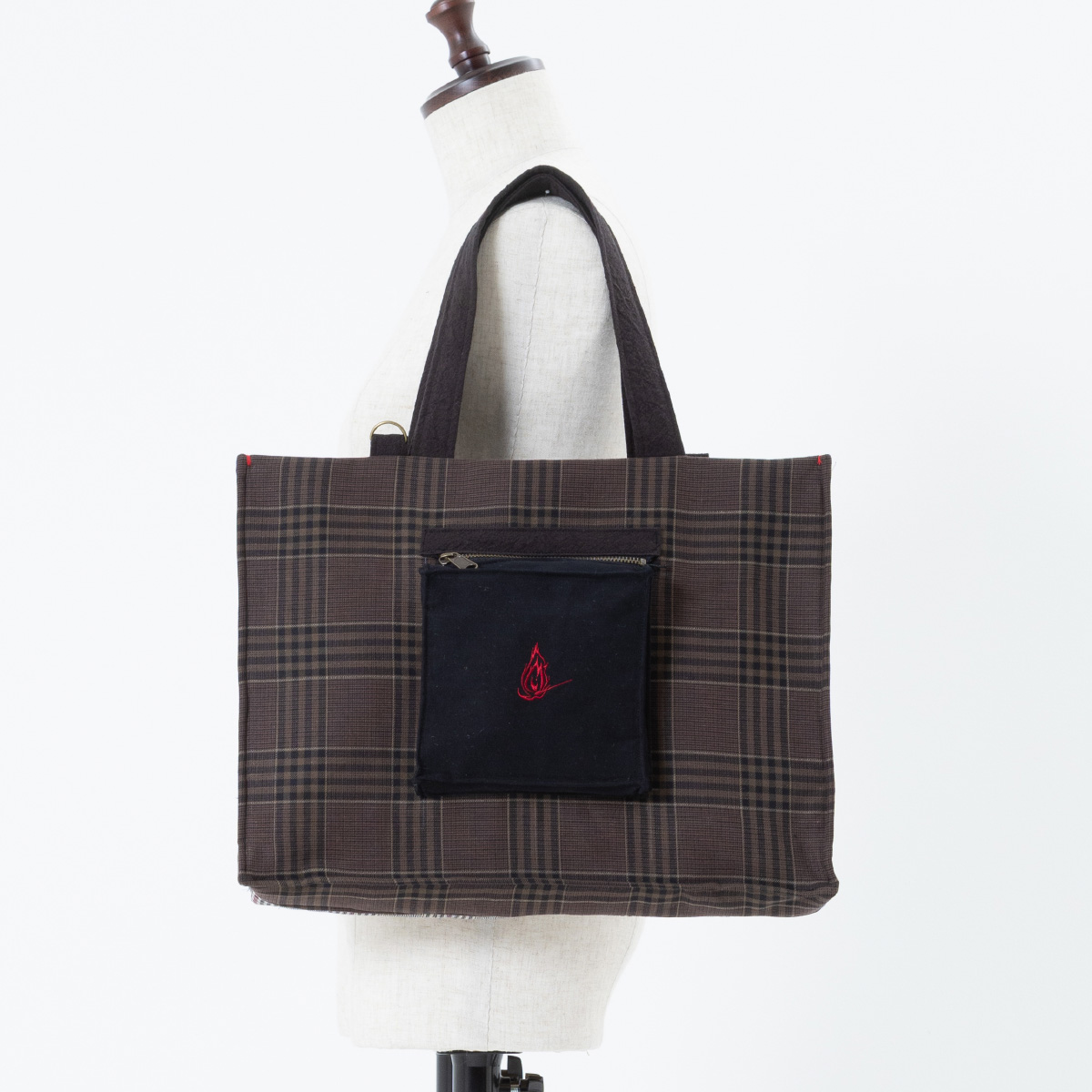 ビンセントとグースパンツとボックスバッグは、同じ生地で出来ている。これは、旅行に出掛けるコーディネートをコンセプトにした為。1泊は軽く出来る大きさの、ボストンバッグをイメージ。使いやすいフルオープンだけど、隠しジップもあるので安心。服屋の作るバッグは柔らかく服を傷つけない。