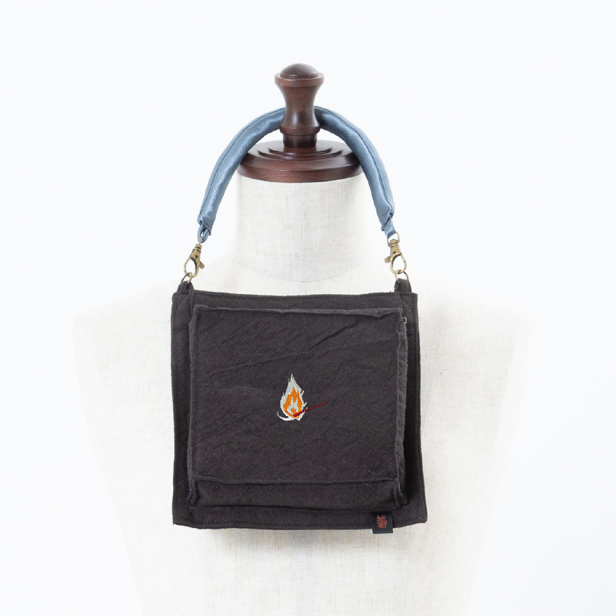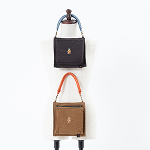エッジの効いた箱マチのポケット。中央に燐のロゴ。フカフカの持ち手。約17センチ程度の小ささだけど、収納部は3カ所。スマホさえあれば、実はどこにでもいける時代だけど、お財布とか鍵とか、メガネとか鏡とか、ハンドクリームとかリップとか、やっぱり持っていたい心情。それ全部入ります。