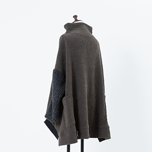四角いパーツが散りばめられた、ハコハコ。エリに2つ、カフスに2つ、スソに3枚、全部四角で構成。ロータートルで重ね着にも相性がいいトップ。アシンメトリーのスソは、ボトムを選ばない。ポリエステルのニットは年中選手。