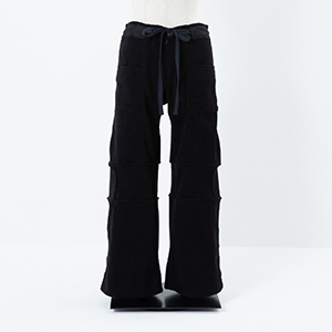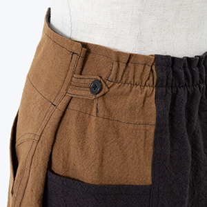 燐の定番グーズパンツ。七分丈の立体パンツ。相性のいい生地を探し、いつも違う素材で作るアイテム。スソのベルトが、後ろに跳ねるようなデザイン。コートやジャケットのシーズンに、細身のパンツは欠かせない。