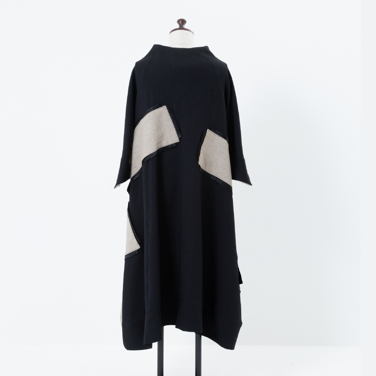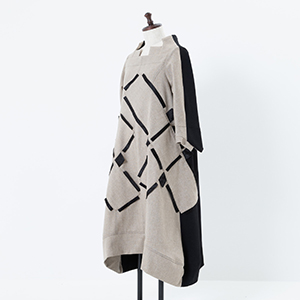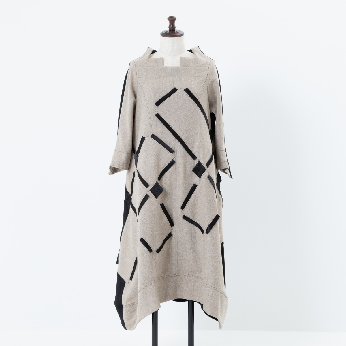 交差する街路樹や街並みをイメージしてプリントや織りに頼らず、新しい形のチェックを作る。手間を惜しまず、小さなパーツを配置していく。エリをパーツでコツコツ積み上げる、新しい手法のワンピース。豪華なディティールに包まれて街歩きしたい。