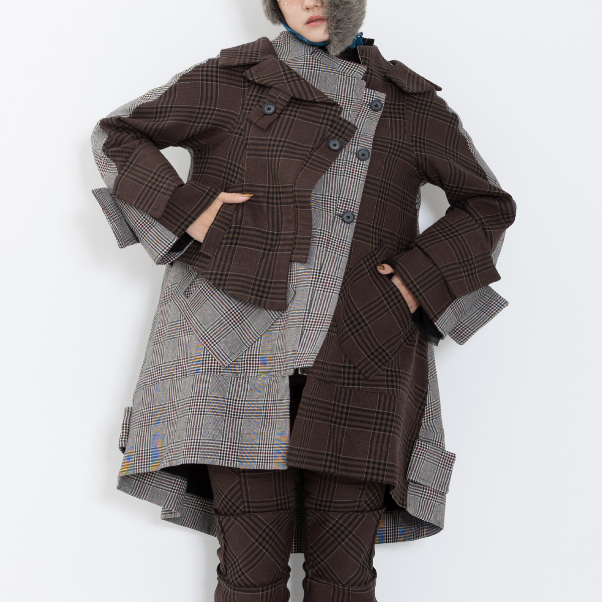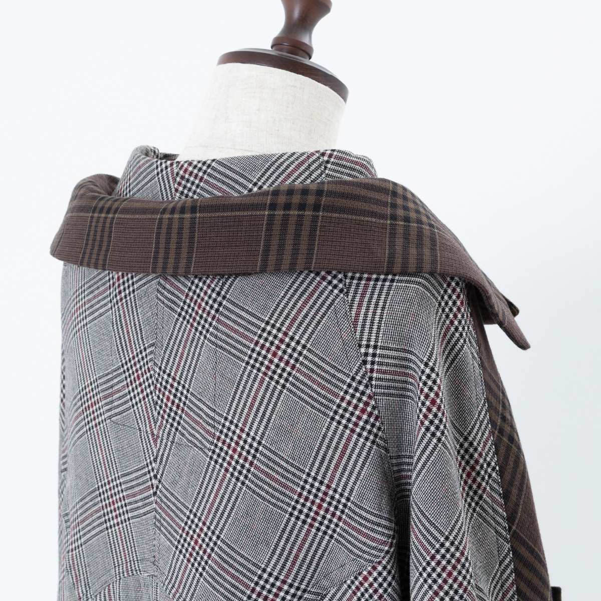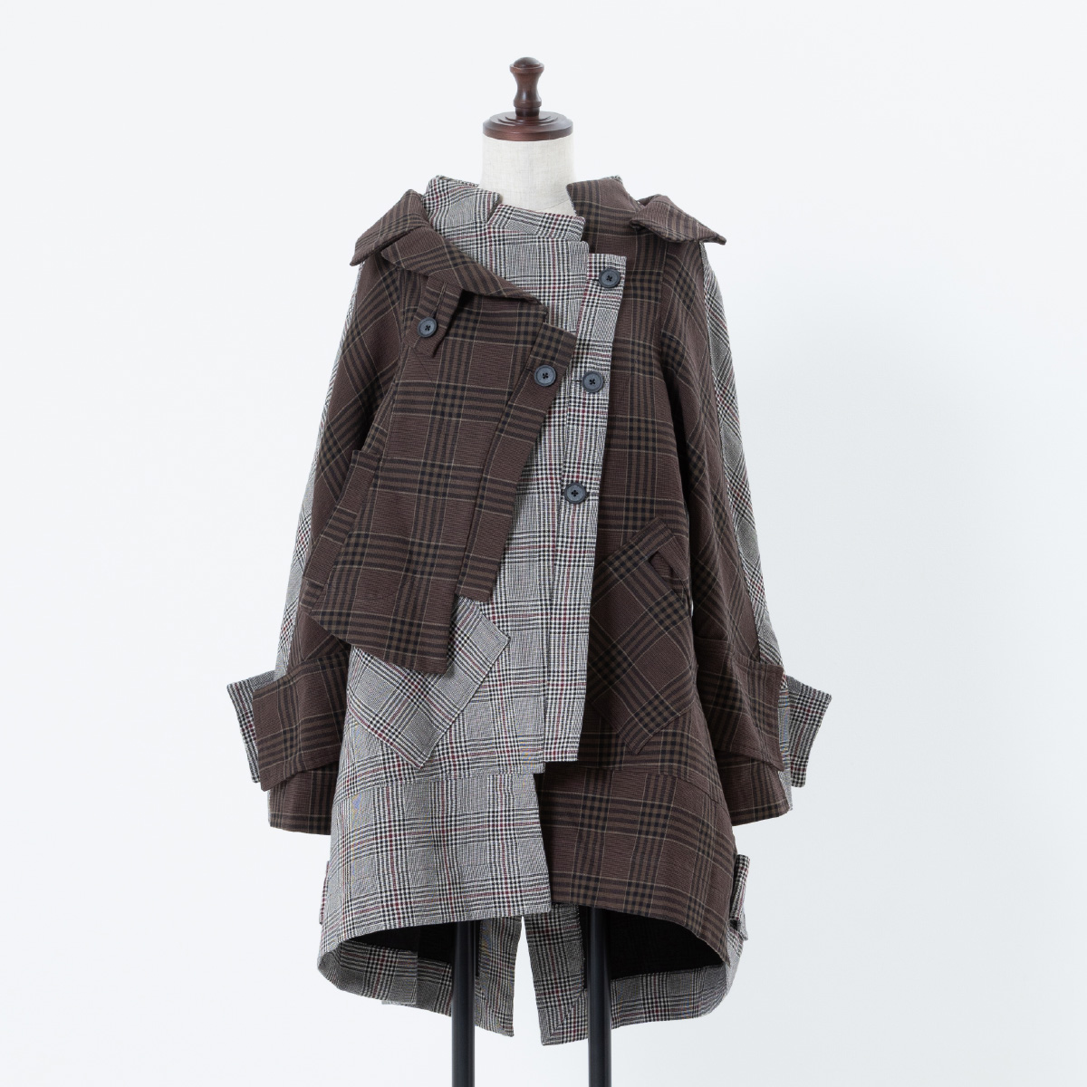 得意のコンフュージョン。まぜこぜアシンメトリーアイテム。トラディショナルなチェックを使い、コートとジャケットを一体化。片身だけ羽織るジャケットに、エリは全周回る矛盾。辻褄の合わないことを、合うように設計するパターン作り。悩んで悩んで、出来たときの達成感があったダイナミックなコート。