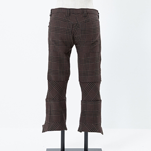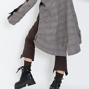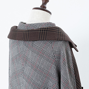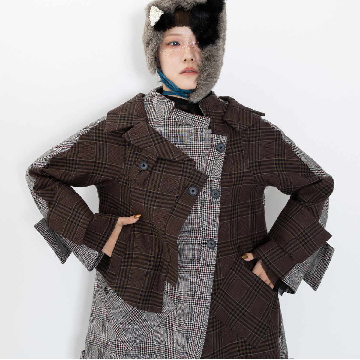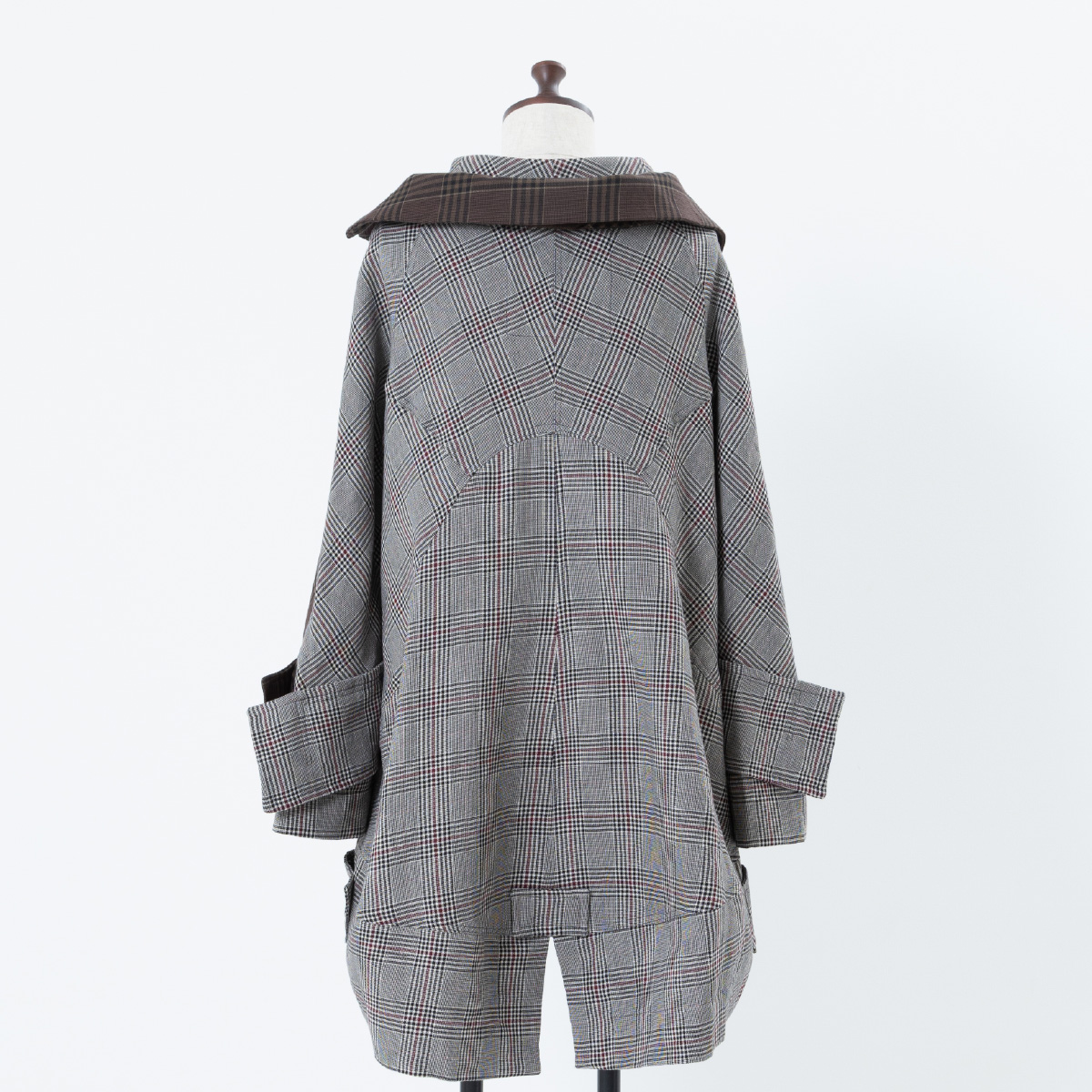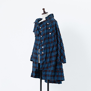 得意のコンフュージョン。まぜこぜアシンメトリーアイテム。トラディショナルなチェックを使い、コートとジャケットを一体化。片身だけ羽織るジャケットに、エリは全周回る矛盾。辻褄の合わないことを、合うように設計するパターン作り。悩んで悩んで、出来たときの達成感があったダイナミックなコート。