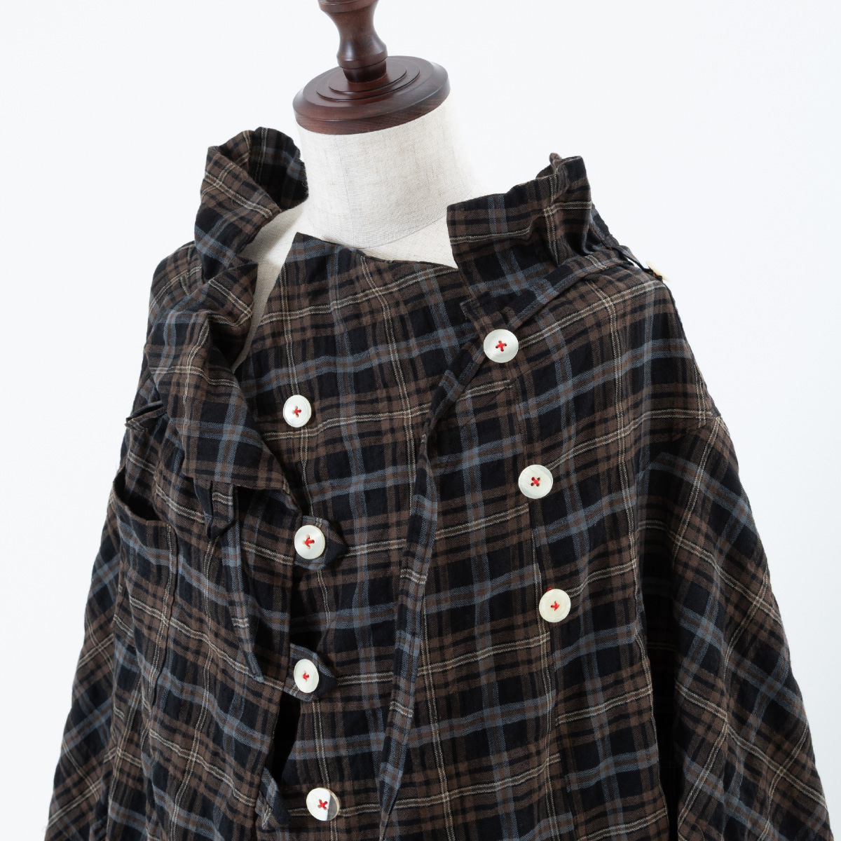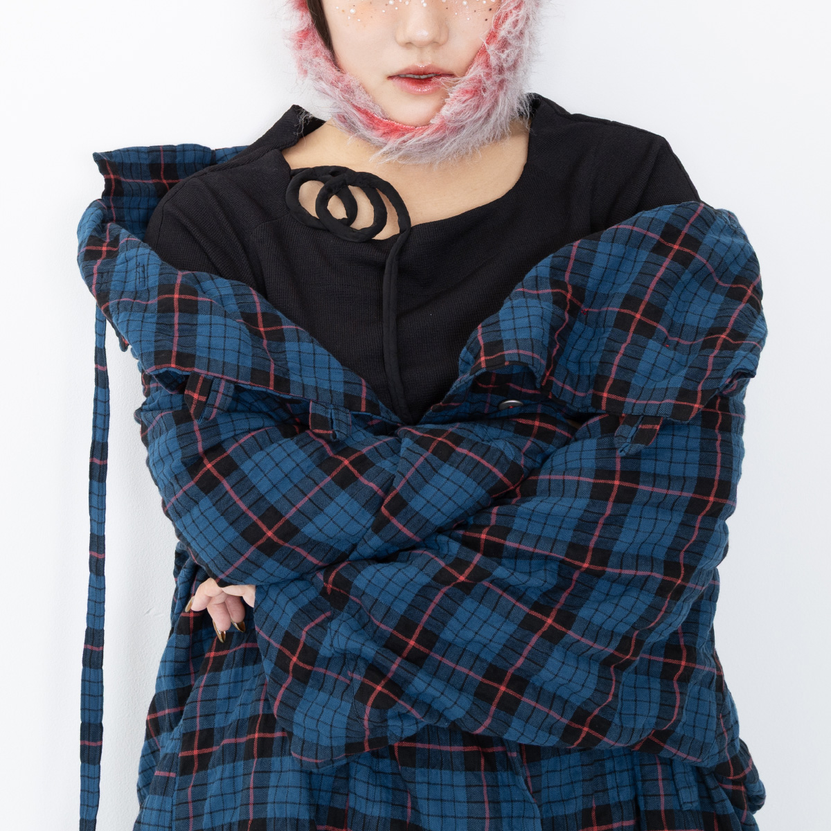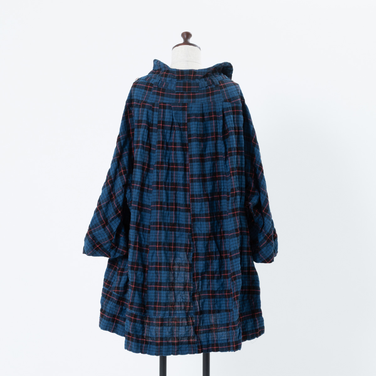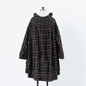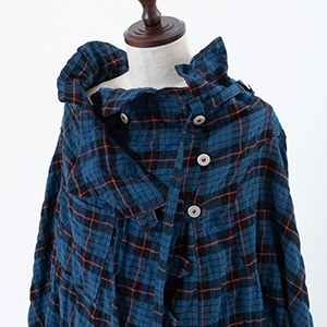 シャーリングコットンのふわふわ生地。綺麗なブルーのチェックをたっぷり使った、ワイドシルエットのガウンシャツ。あちこちに付いたボタンやリボンは、色んなアレンジが出来るように配置。オーバースカートにもなるサイズ感。自由に工夫して、ザックリ羽織るカジュアルなアイテム。