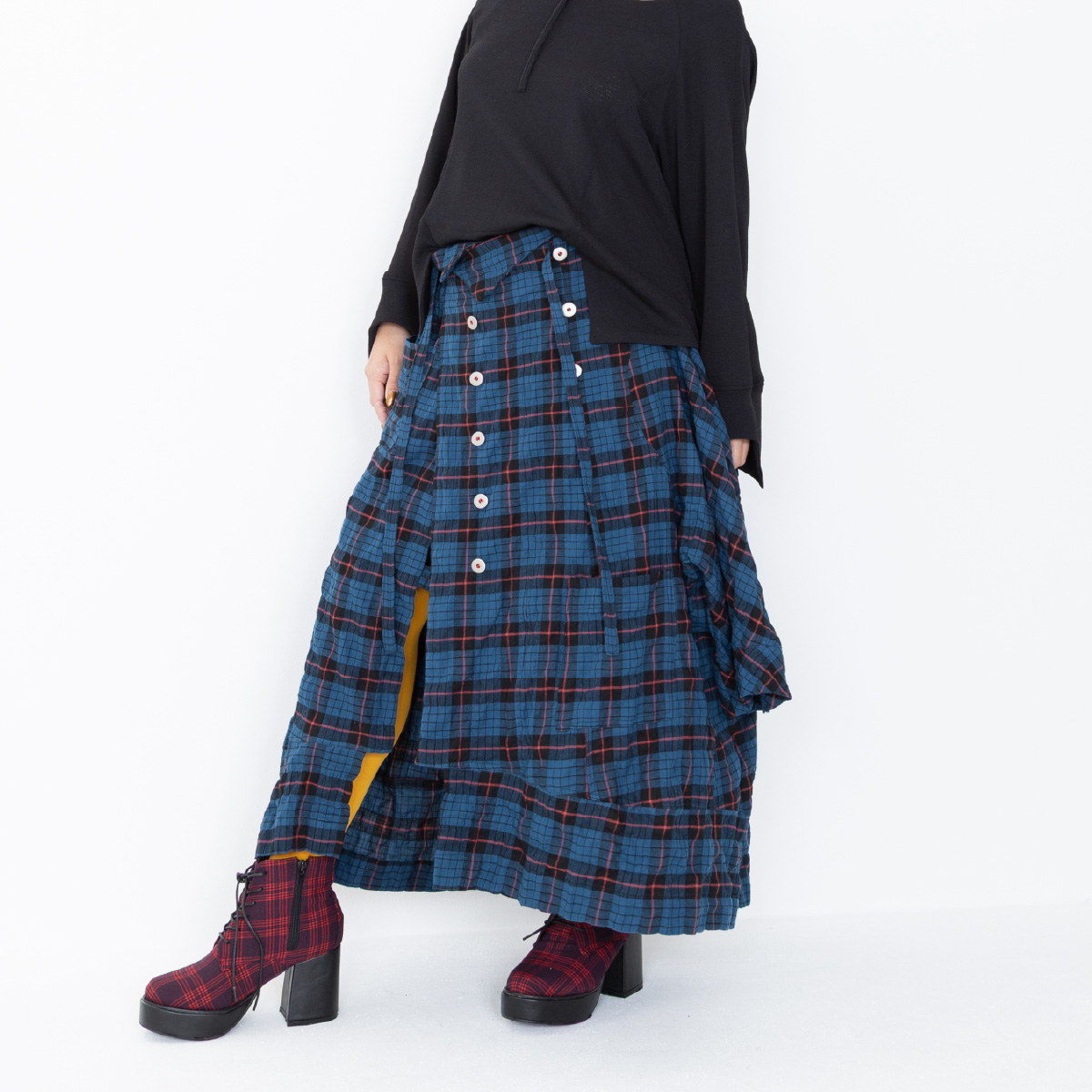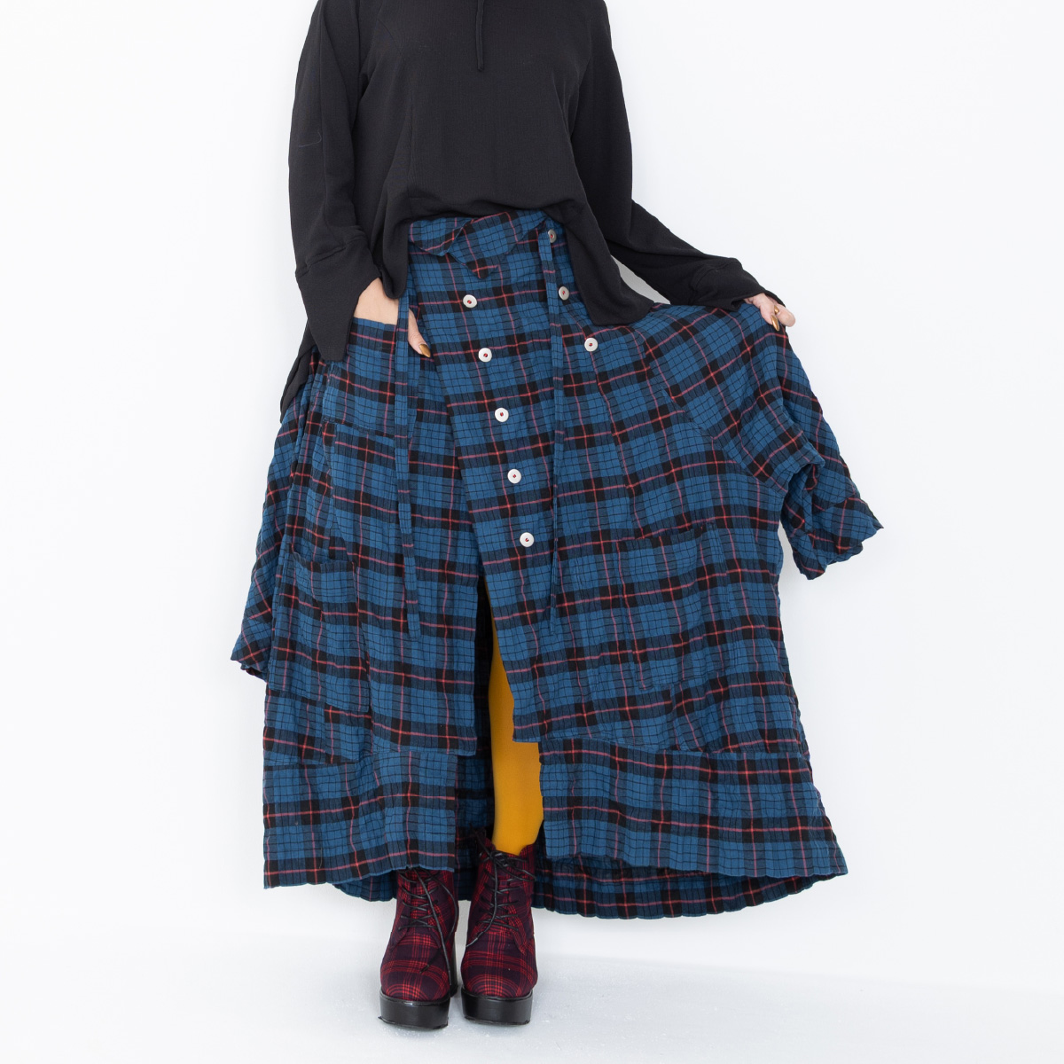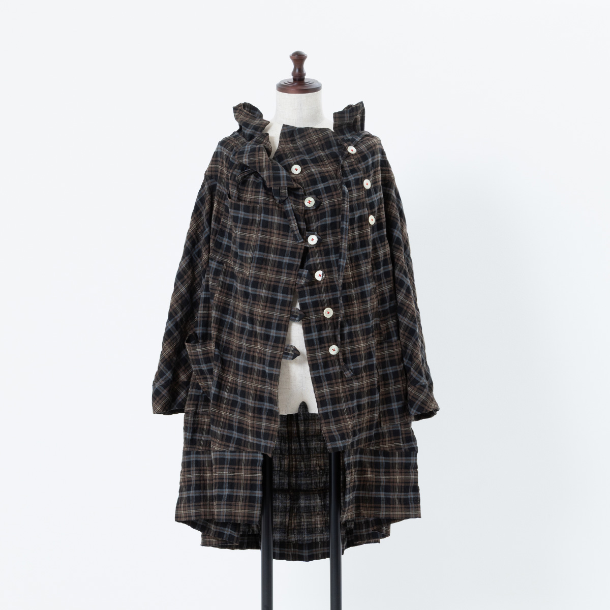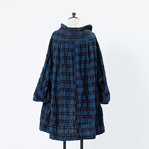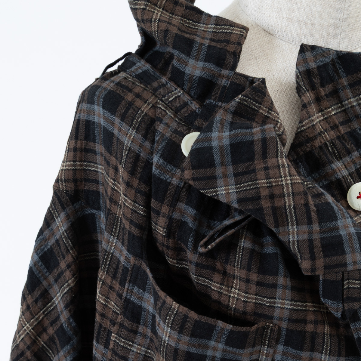 シャーリングコットンのふわふわ生地。綺麗なブルーのチェックをたっぷり使った、ワイドシルエットのガウンシャツ。あちこちに付いたボタンやリボンは、色んなアレンジが出来るように配置。オーバースカートにもなるサイズ感。自由に工夫して、ザックリ羽織るカジュアルなアイテム。