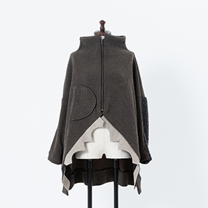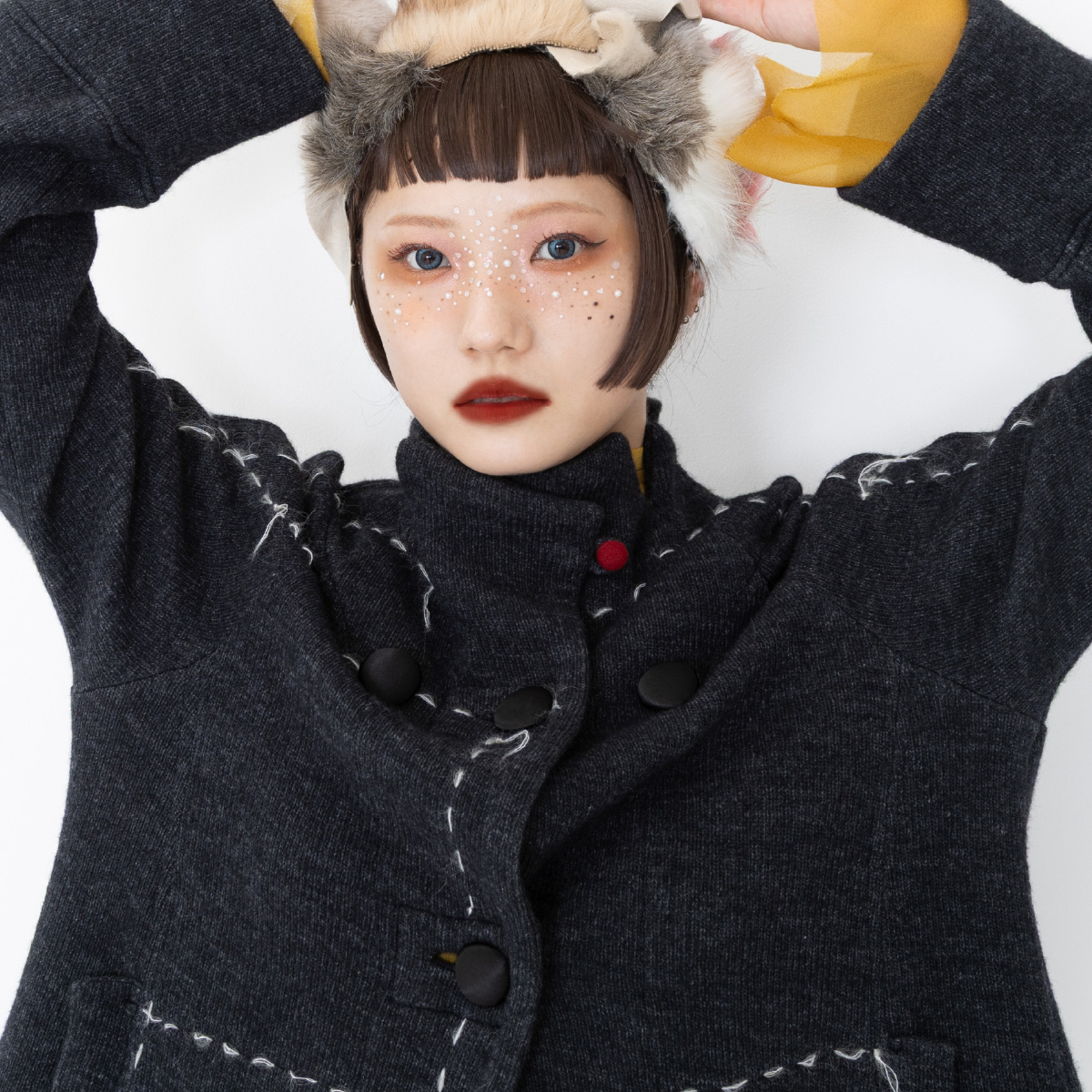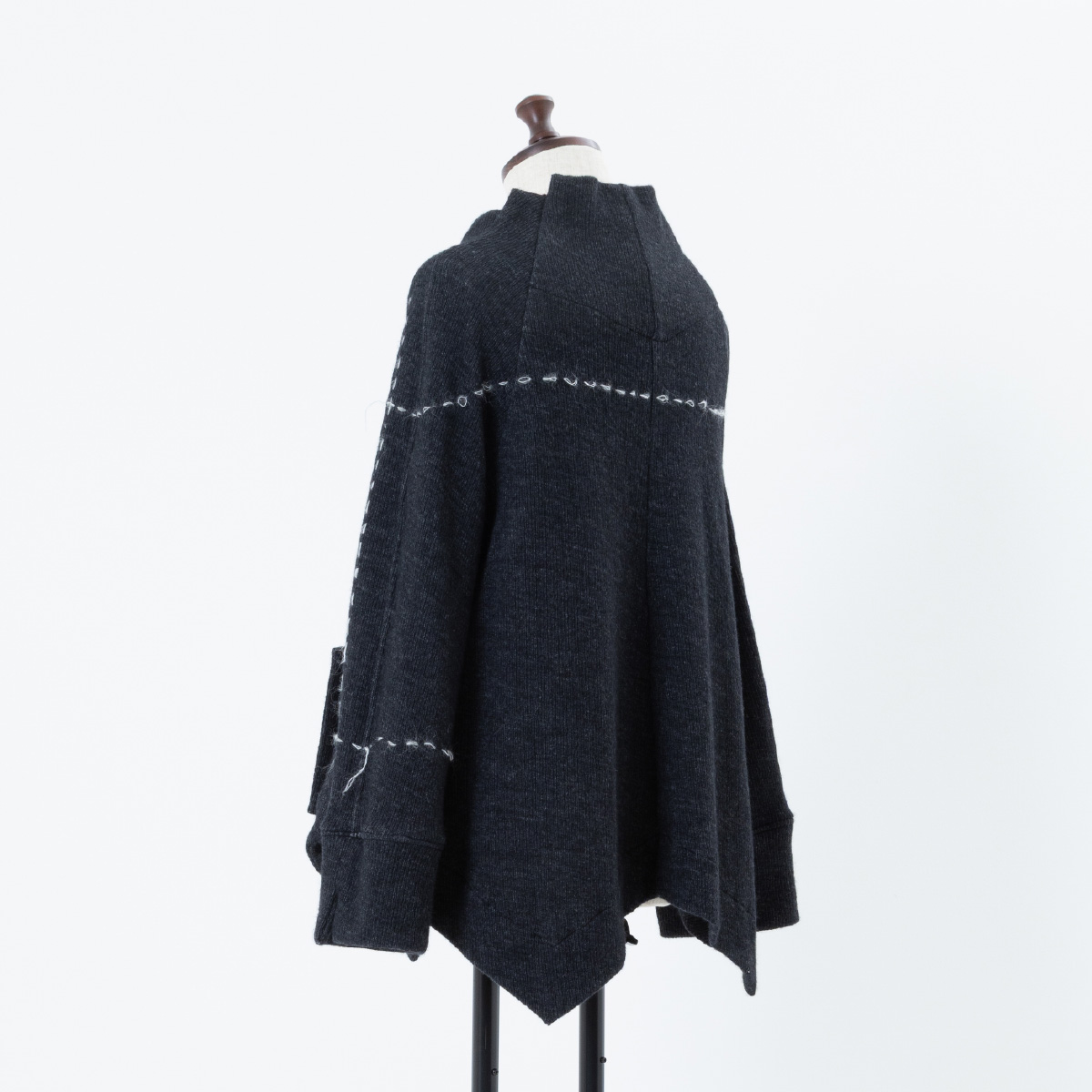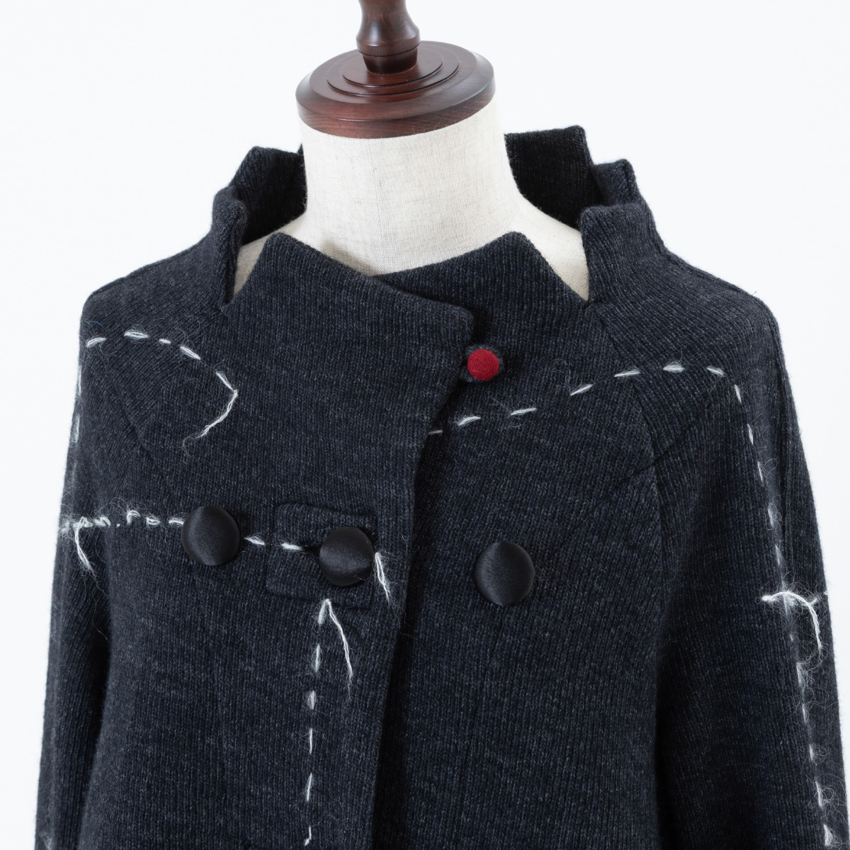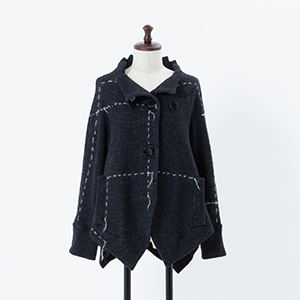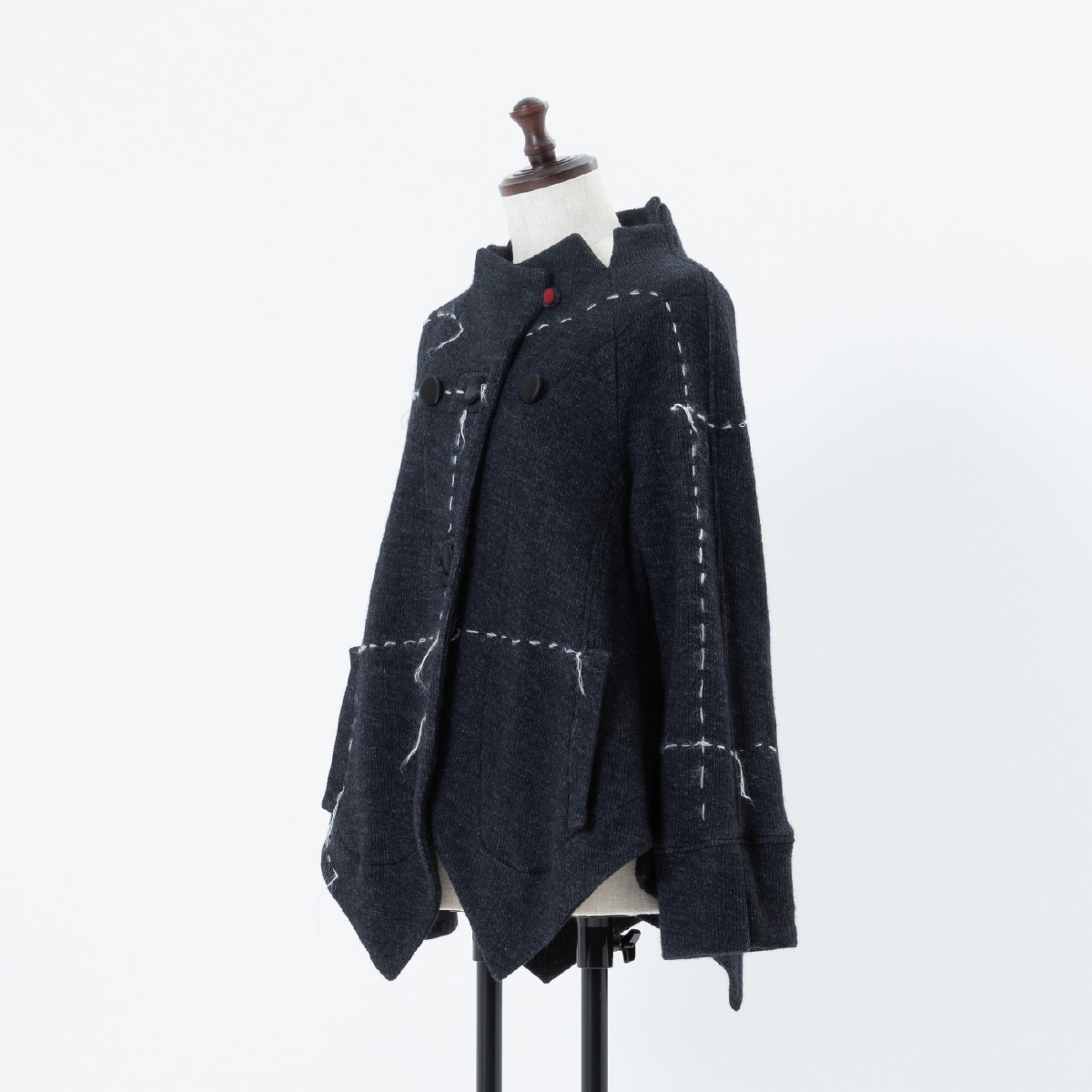 小さなアトリエブランドだからこそ出来る、細やかな仕事。モヘアのぐし縫いが、仕立屋さんの仮縫い線のよう。縦横に走るラインを、自由に描くラフステッチ。段々になったエリが楽しく、首までカバーする暖かさ。柔らかく肌触りのいいニット生地のジャケット。