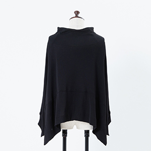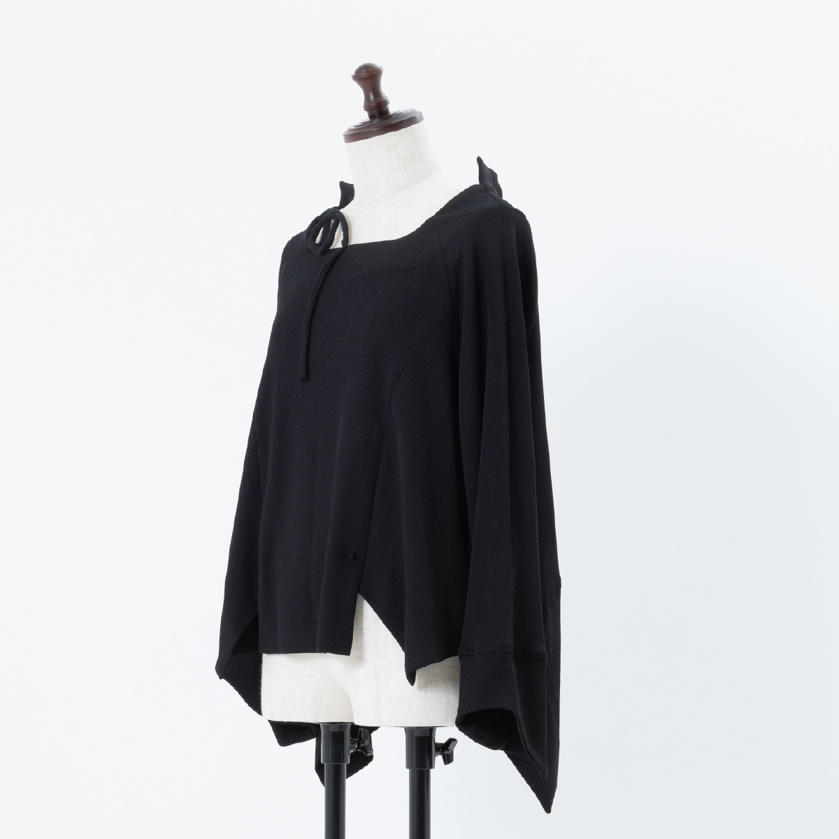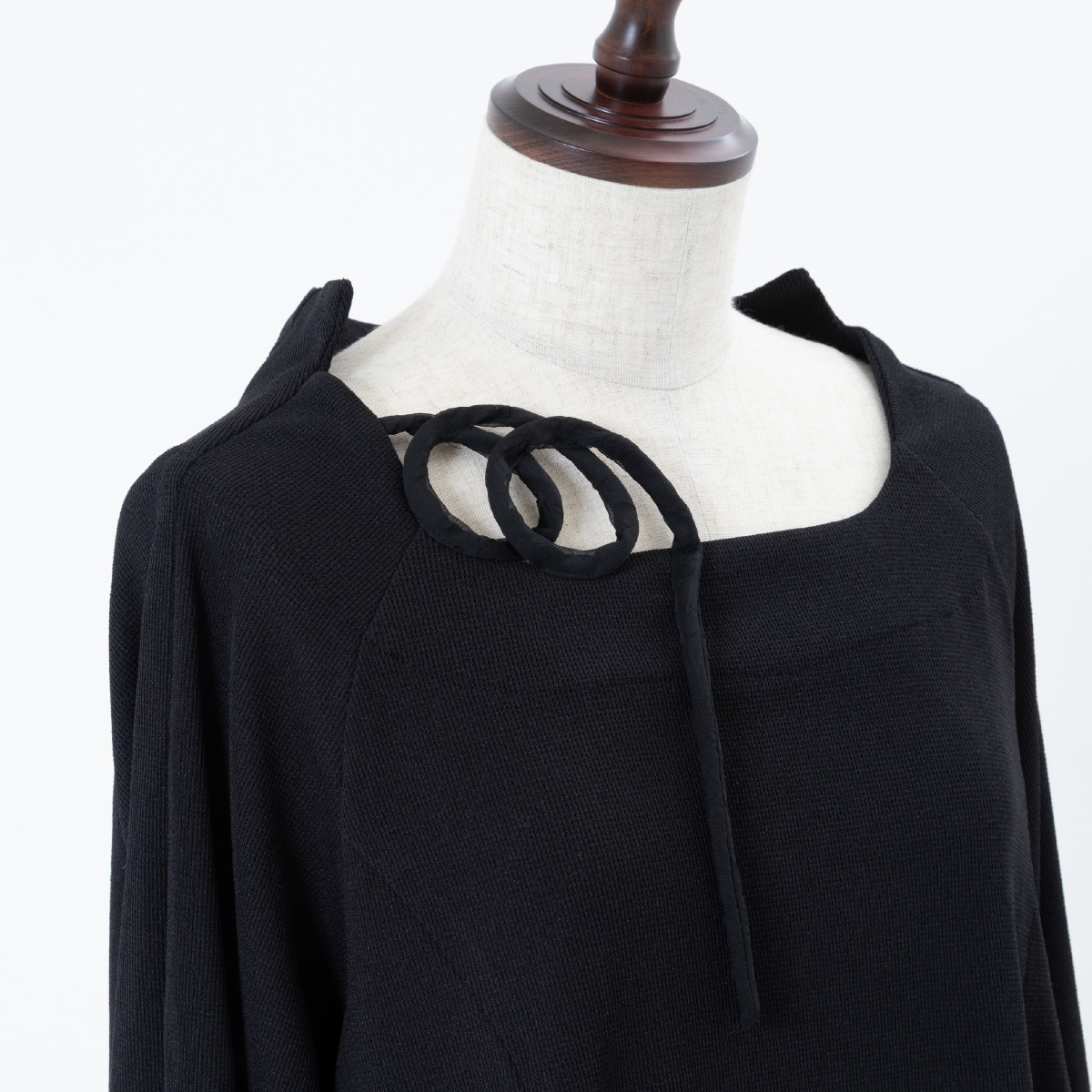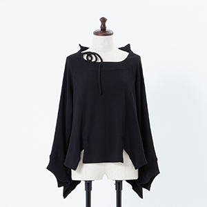 ポイントは胸元のくるり、だけじゃない。スリットいっぱいで、羽のようなスソが、ヒラヒラと遊ぶ。変形のカフスが手首を華奢にしてくれて、Aラインでゆったりと使いやすい。くるりは、手心で作っていくので一点づつ個性がある。オールブラックでサラッとしたカットソー。