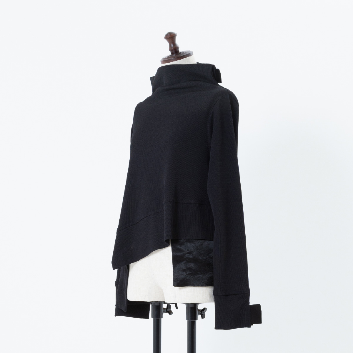四角いパーツが散りばめられた、ハコハコ。エリに2つ、カフスに2つ、スソに3枚、全部四角で構成。ロータートルで重ね着にも相性がいいトップ。アシンメトリーのスソは、ボトムを選ばない。ポリエステルのニットは年中選手。