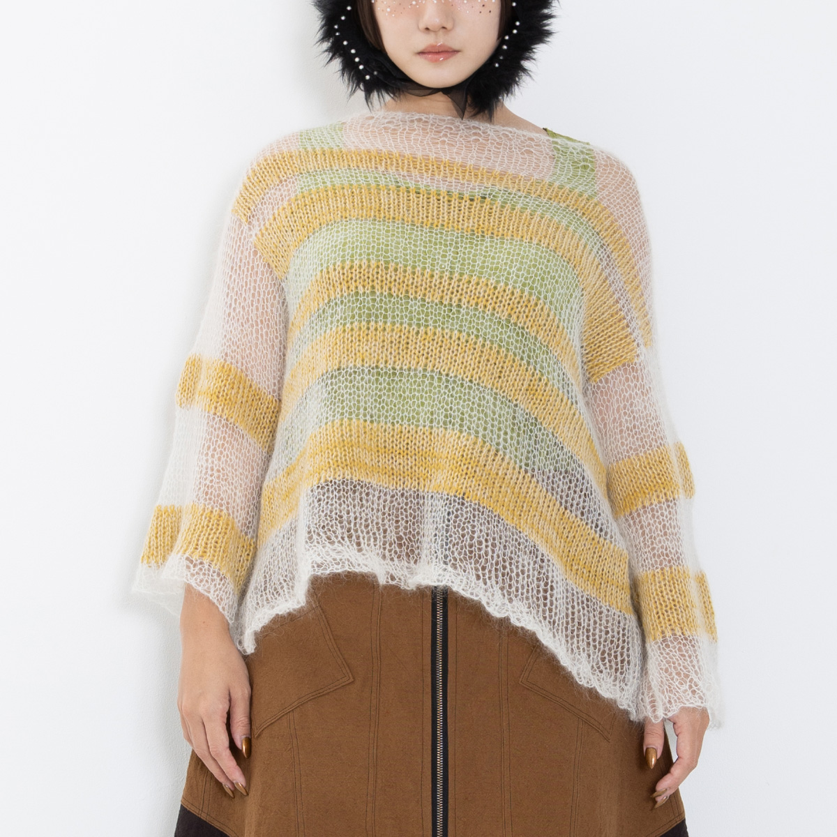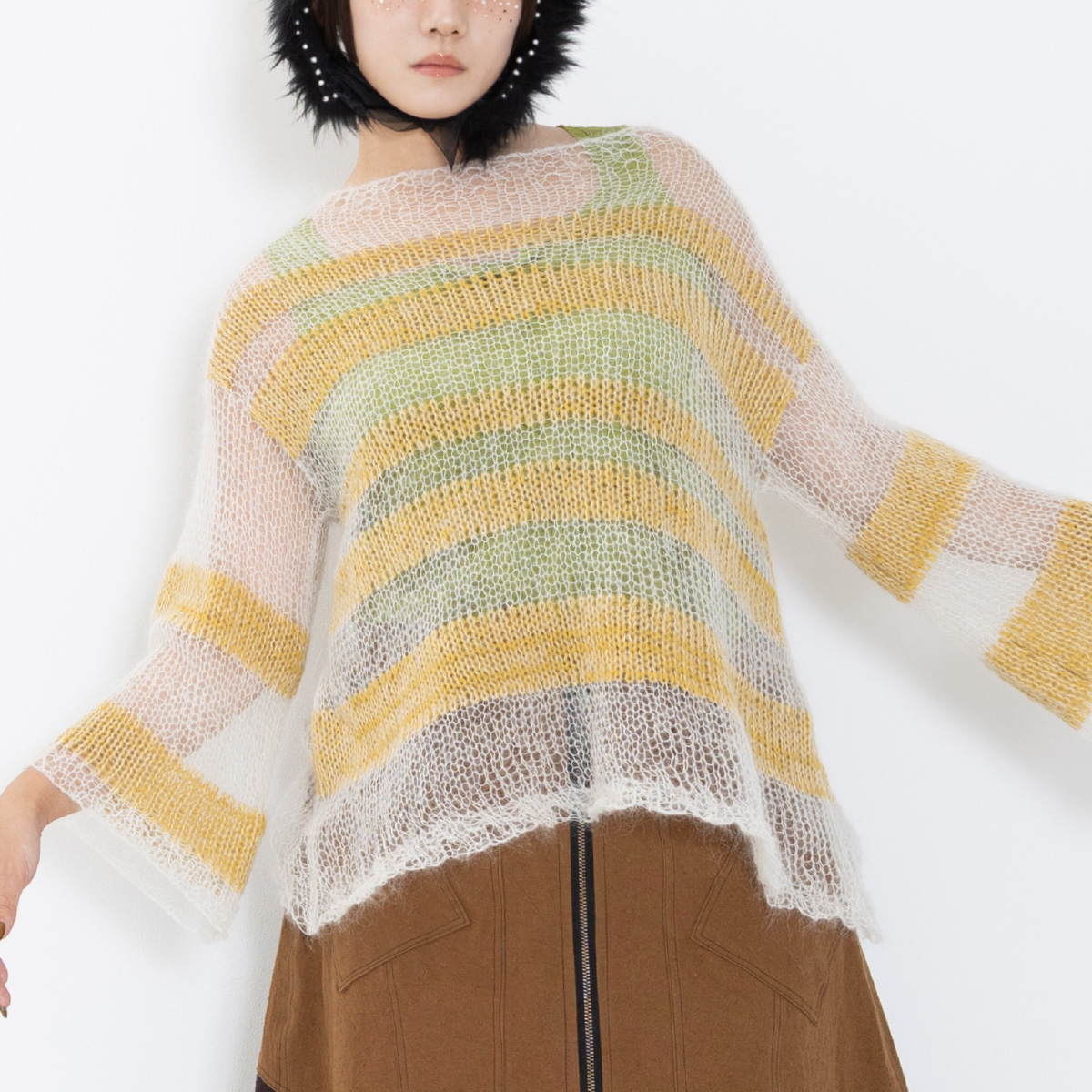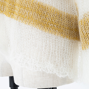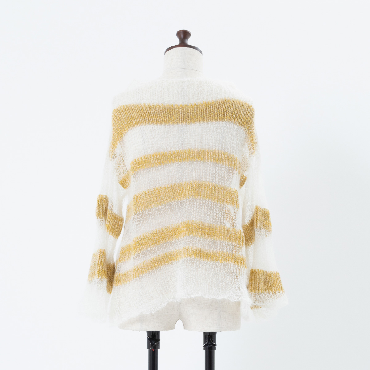 ランダムな巾のボーダーは糸の太さを変えて、ニュアンスを出す。首回りや袖口のエンド部分に仕上げをしない事で、華奢ではかなく見え、反面パンクで乱暴な印象にもなる。手編みのニットは大変で、めったに作れないけど、好きなものが売ってないので、頑張って挑戦。