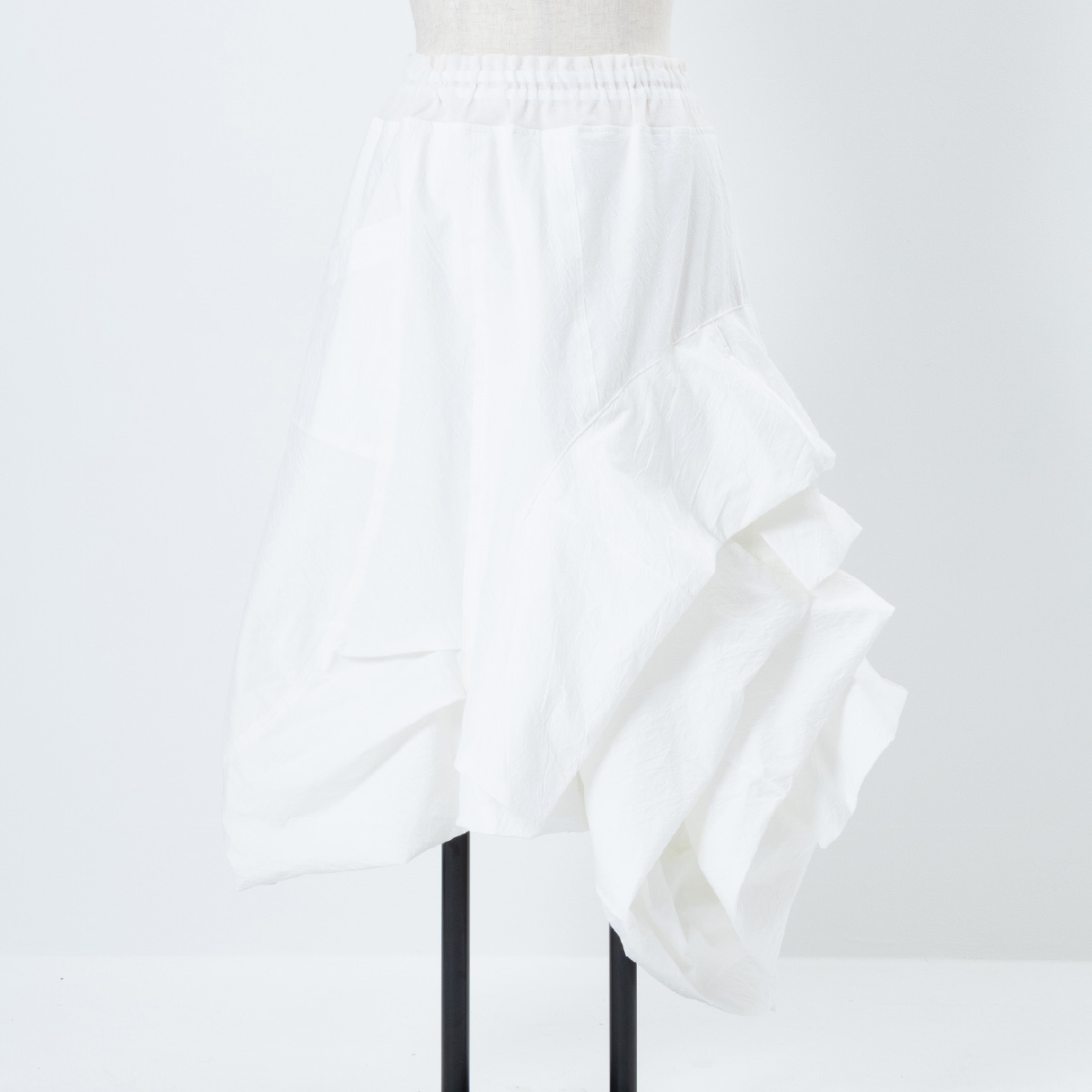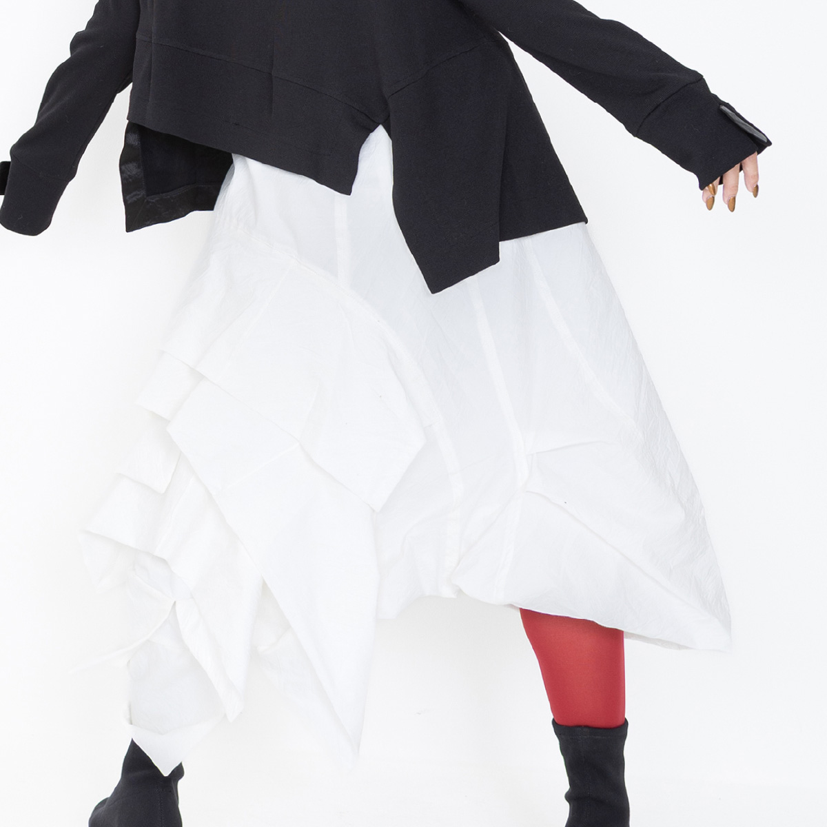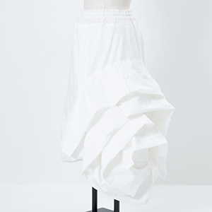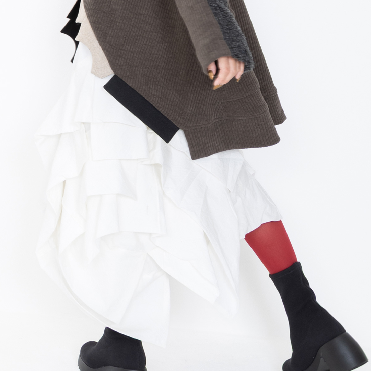 大きな花が咲いたような、インパクトあるバルーンスカート。動くとパサパサと衣擦れの音がする生地は、幾重に重ねても軽い。エレガントなコーディネートもいいけれど、真っ黒のタートルや、ザックリとした靴下、ごついブーツで、カジュアルな着こなしにするのが好み。