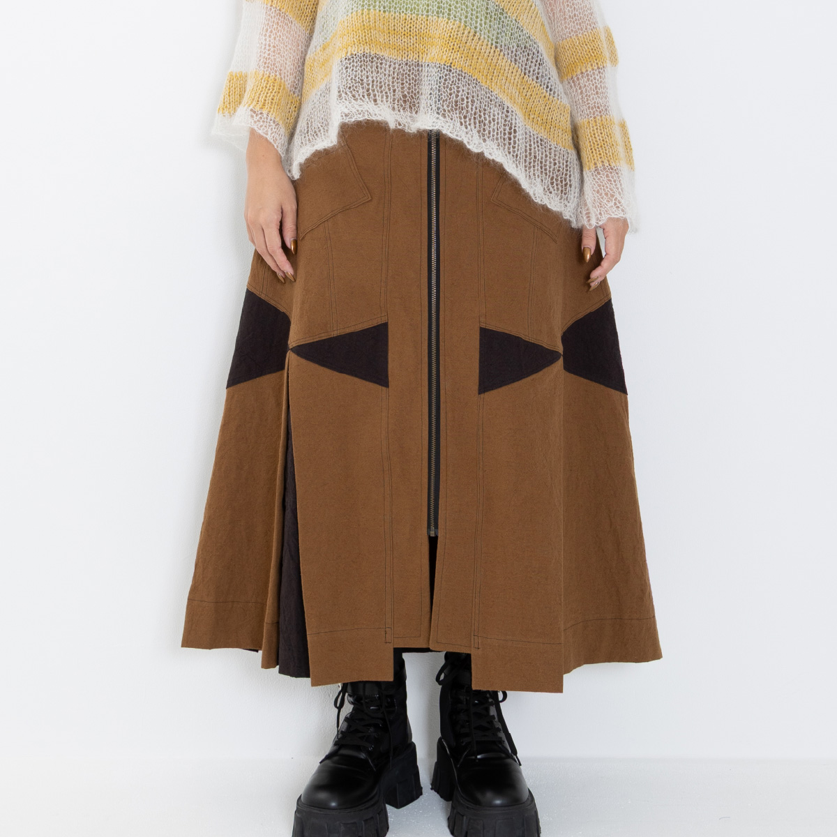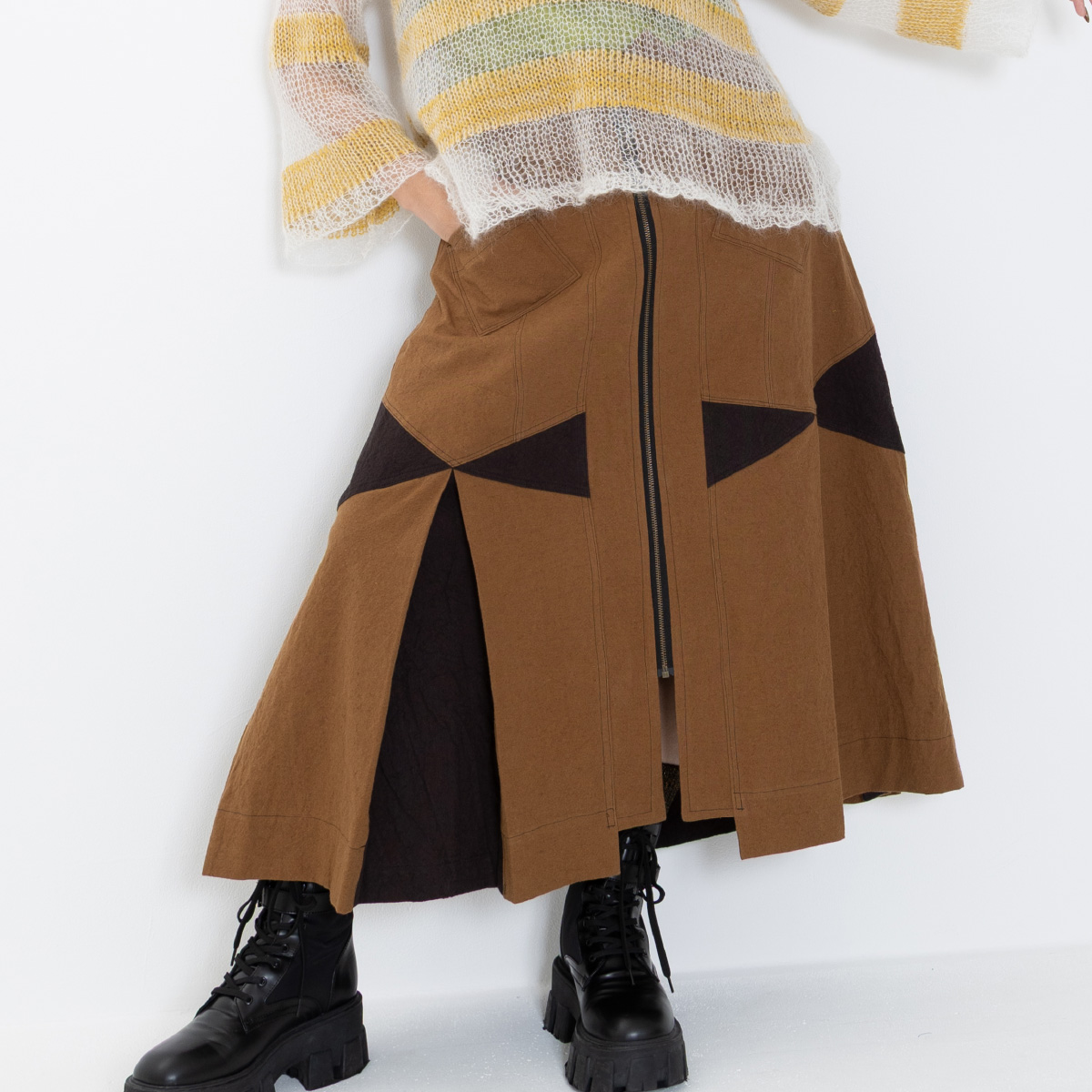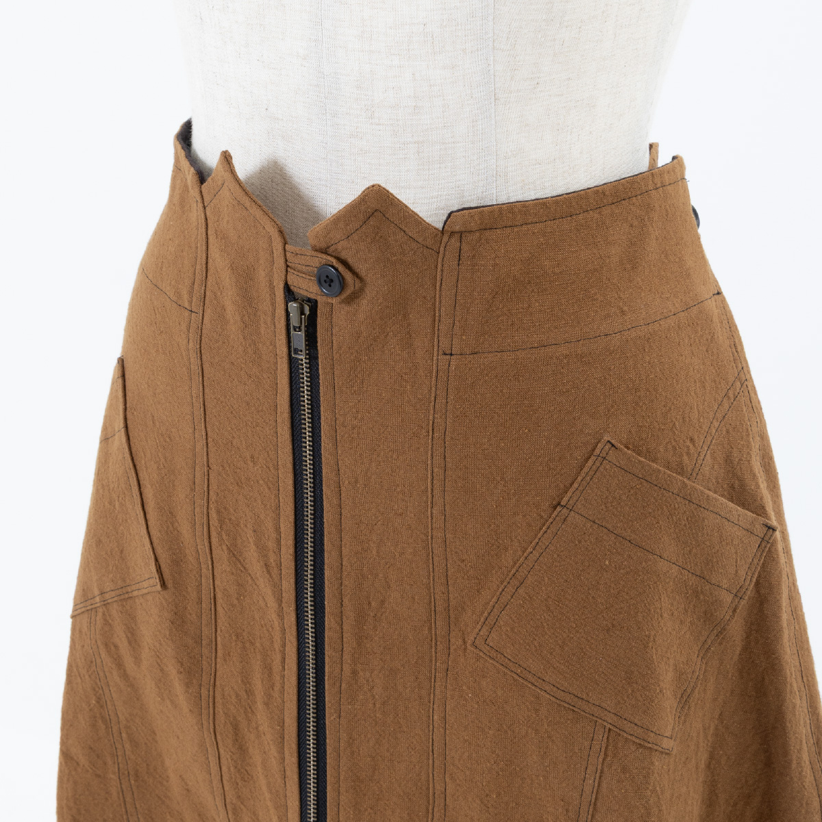 灯台から放たれるライトのようなデザイン。直線的なシルエットがはっきり出る、綿麻のハードな生地は、さらりとした触り心地で、年中楽しめるアイテム。Aラインのシルエットをさらに動かす、4つのハコプリ。真っ直ぐに芯が通って、スッと背筋も伸びる巻スカート。