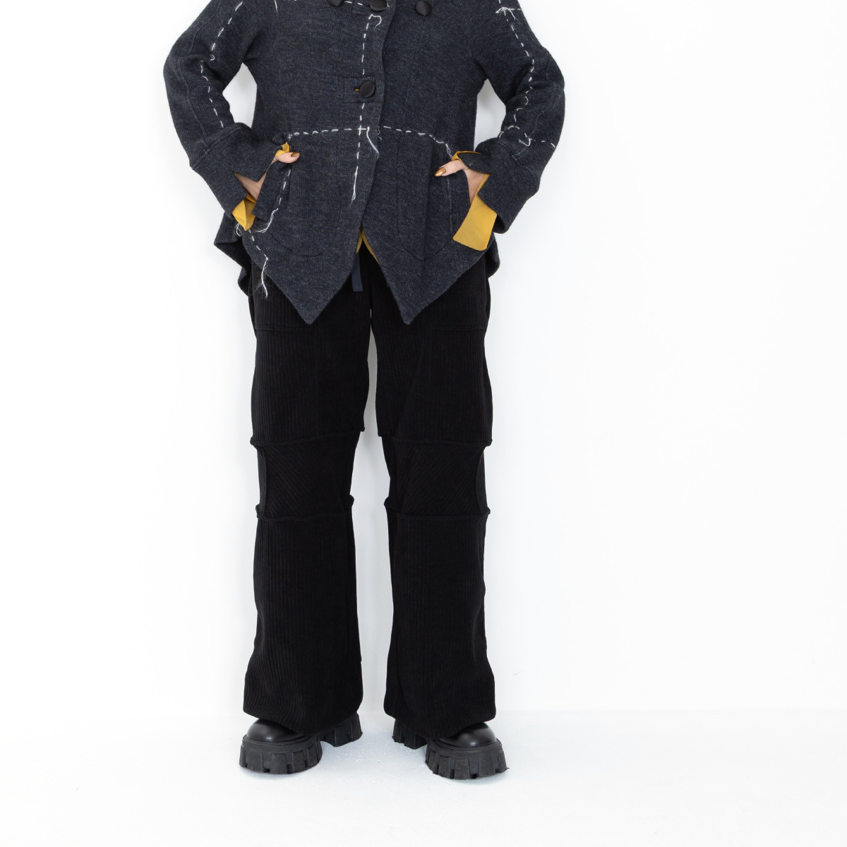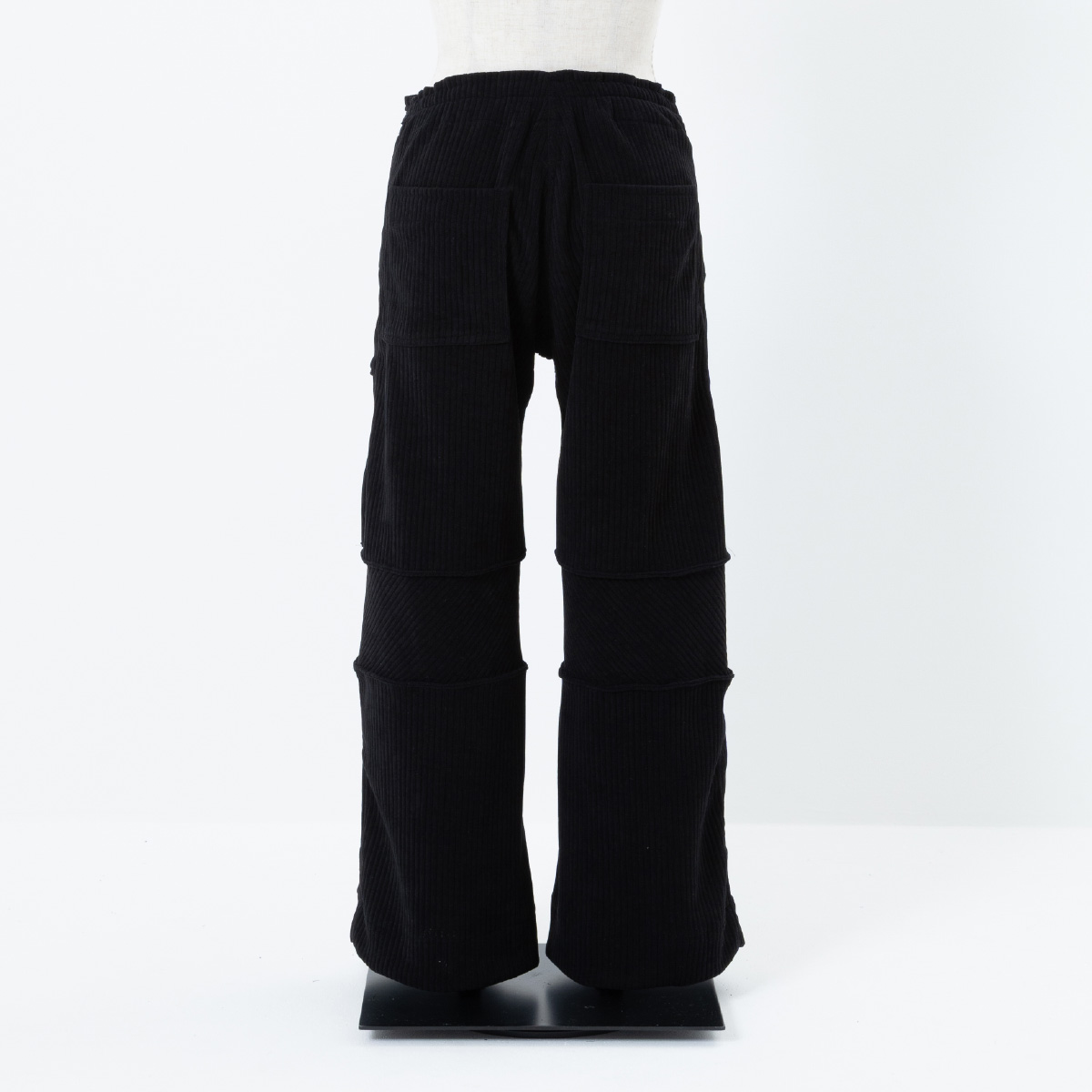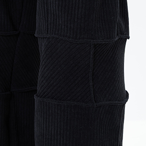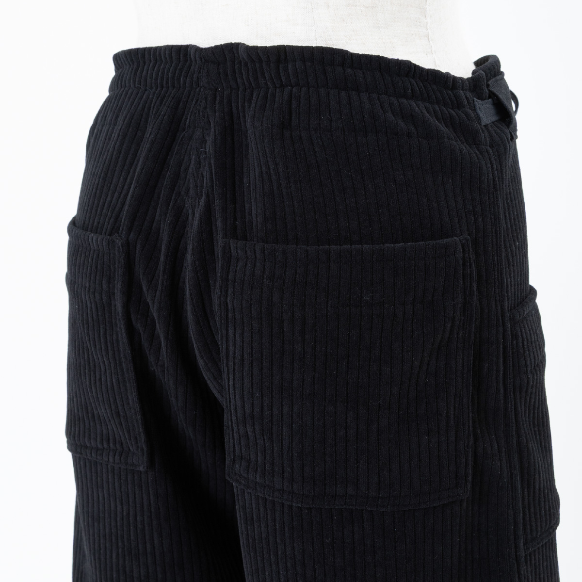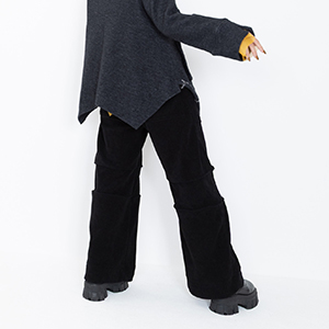ドンと太い存在感のあるドカンパンツ。膝部分にバイアス裁ちを使い、立体感を出すステッチを入れ、膝位置を高く、スタイルのいいシルエットを目指す。厚みのあるコーデュロイで、季節感溢れるボトム。単色で使いやすい、冬のデイリーユースアイテム。