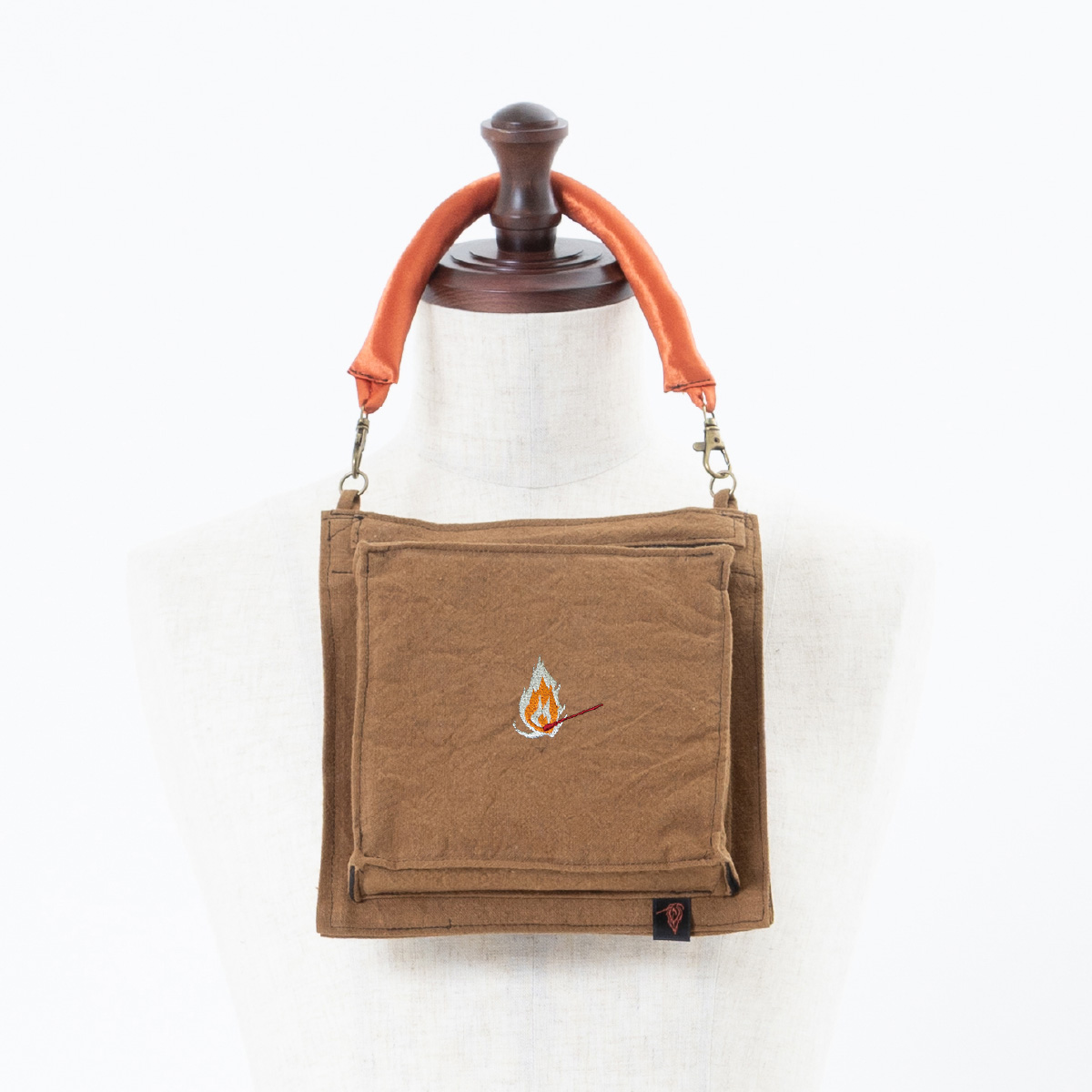 エッジの効いた箱マチのポケット。中央に燐のロゴ。フカフカの持ち手。約17センチ程度の小ささだけど、収納部は3カ所。スマホさえあれば、実はどこにでもいける時代だけど、お財布とか鍵とか、メガネとか鏡とか、ハンドクリームとかリップとか、やっぱり持っていたい心情。それ全部入ります。