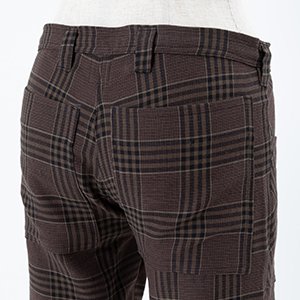 燐の定番グーズパンツ。七分丈の立体パンツ。相性のいい生地を探し、いつも違う素材で作るアイテム。スソのベルトが、後ろに跳ねるようなデザイン。コートやジャケットのシーズンに、細身のパンツは欠かせない。