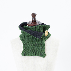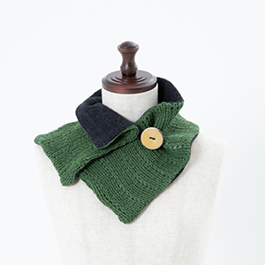 発色のいい糸で手編みをした、ミニサイズのマフラー。首にキチンとそって、とても軽い。大きなボタンがポイント。向きを変えると形も変わるデザイン。付けエリのように使ったり、スカーフのようにエリから覗かせたり、室内で付けていても違和感がない、燐の可愛いマフリン。