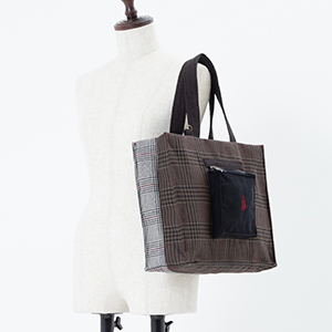 ビンセントとグースパンツとボックスバッグは、同じ生地で出来ている。これは、旅行に出掛けるコーディネートをコンセプトにした為。1泊は軽く出来る大きさの、ボストンバッグをイメージ。使いやすいフルオープンだけど、隠しジップもあるので安心。服屋の作るバッグは柔らかく服を傷つけない。